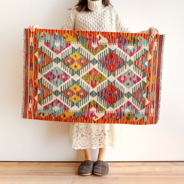 アフガニスタンで手織りでつくられた、カラフルなキリムラグ。 平織なので、1年中さらっと使えます。 おうちのインテリアの第一印象となる玄関を華やかに彩り、 あなたや家族、お客様を明るくお迎えしてくれます。 玄関にラグを敷くと、悪い気が室内に入るのを防いでくれると言われています。 ぜひお気に入りのキリムで、お部屋を彩ってみてください。 ◆ キリムの仕様 <材質> 羊毛 100% <サイズ> 幅:約 93.5 cm (左右のフリンジ含む) x 奥行:約 63.5 cm ※厚みは大体、5㎜程度です。 <原産国> アフガニスタン(一部、仕上げをパキスタンで行っています) ※閲覧環境により、写真と実物の色みが異なることもございます。 また、ハンドメイドならではの歪みや色ムラ、傷、汚れ等ございます。 どうぞご理解の上、ご注文頂けますようお願いいたします。 ※不良品以外のご返品はご遠慮ください。 ※本商品はキリムラグ1点のみの販売です。その他撮影用小物は商品に含まれません。 ◆ 発送について ・送料は無料です。 ・ご注文後、当日~1週間以内に発送いたします。 (基本的には当日もしくは翌日に発送できるようにしていますが、出展・出張等で1週間程かかることもございますので、ご了承ください)