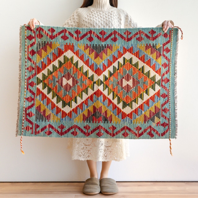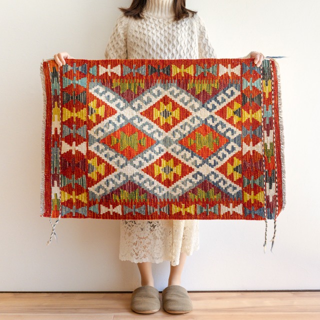 アフガニスタンで手織りでつくられた、カラフルなキリムラグ。 平織なので、1年中さらっと使えます。 おうちのインテリアの第一印象となる玄関を華やかに彩り、 あなたや家族、お客様を明るくお迎えしてくれます。 玄関にラグを敷くと、悪い気が室内に入るのを防いでくれると言われています。 ぜひお気に入りのキリムで、お部屋を彩ってみてください。 ◆ キリムの仕様 <材質> 羊毛 100% <サイズ> 幅:約 92 cm (左右のフリンジ含む) x 奥行:約 67 cm ※厚みは大体、5㎜程度です。 <原産国> アフガニスタン(一部、仕上げをパキスタンで行っています) ※閲覧環境により、写真と実物の色みが異なることもございます。 また、ハンドメイドならではの歪みや色ムラ、傷、汚れ等ございます。 どうぞご理解の上、ご注文頂けますようお願いいたします。 ※不良品以外のご返品はご遠慮ください。 ※本商品はキリムラグ1点のみの販売です。その他撮影用小物は商品に含まれません。 ◆ 発送について ・送料は無料です。 ・ご注文後、当日~1週間以内に発送いたします。 (基本的には当日もしくは翌日に発送できるようにしていますが、出展・出張等で1週間程かかることもございますので、ご了承ください)