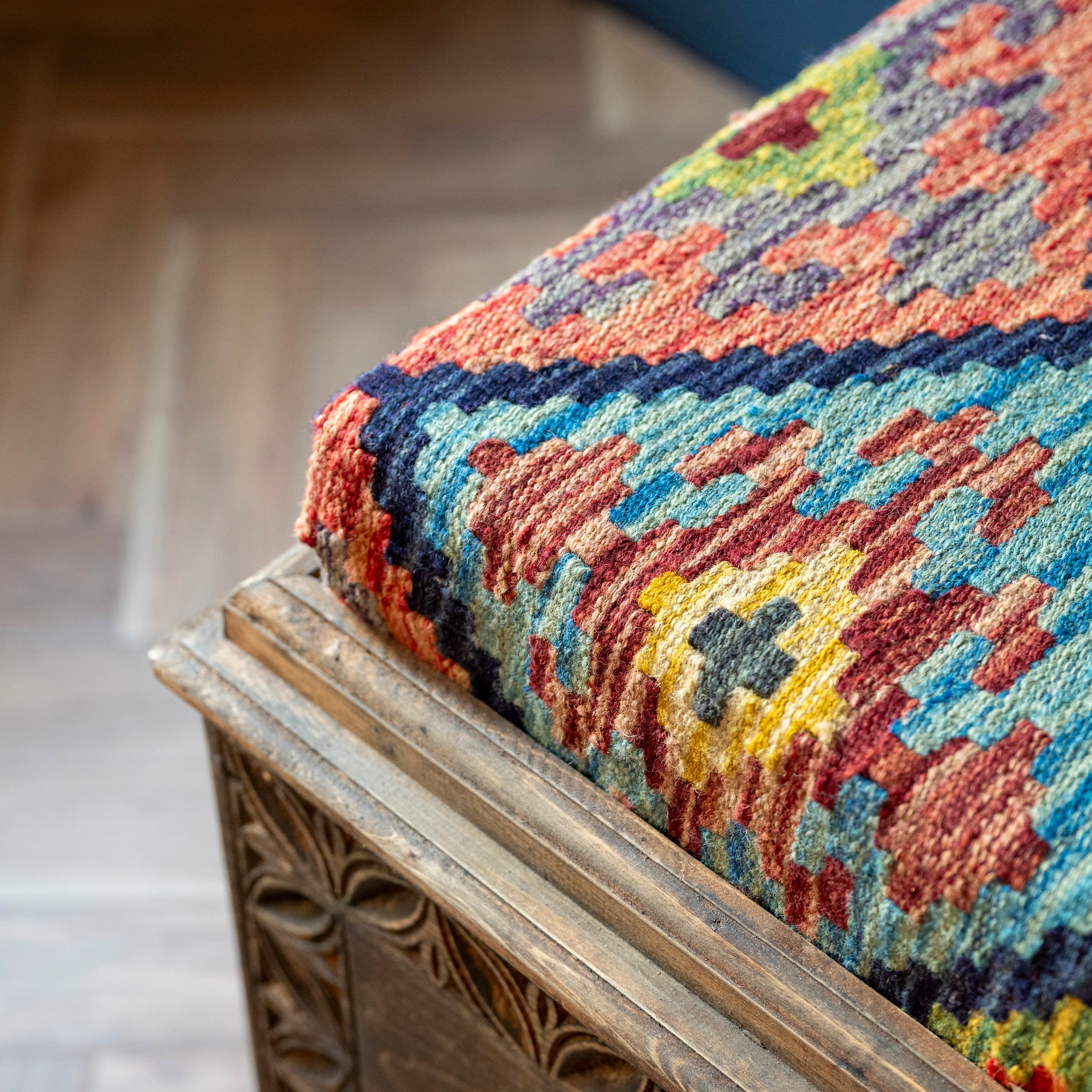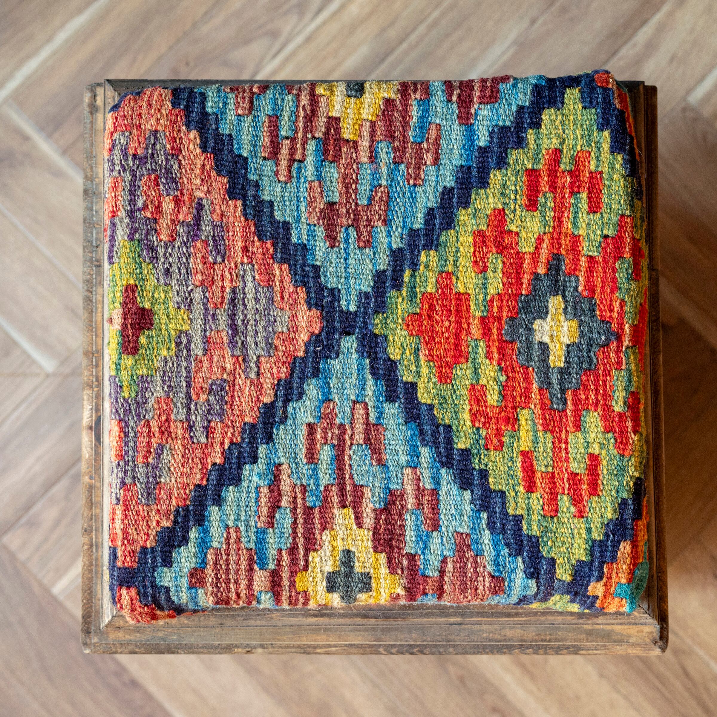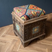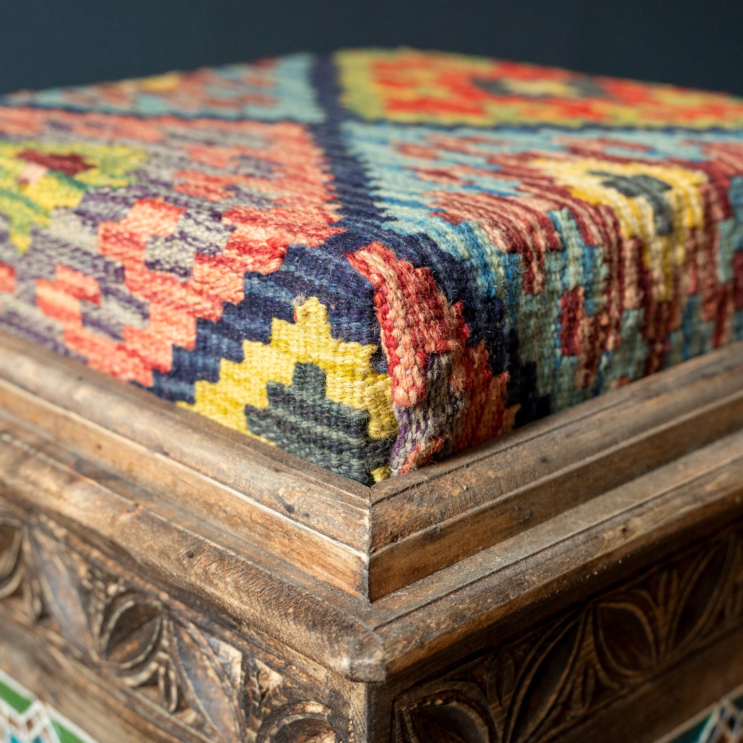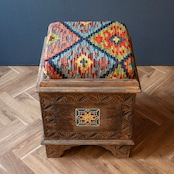 ウール製の手織りキリム(ラグ)を座面にあしらった、パキスタン製の椅子です。
