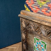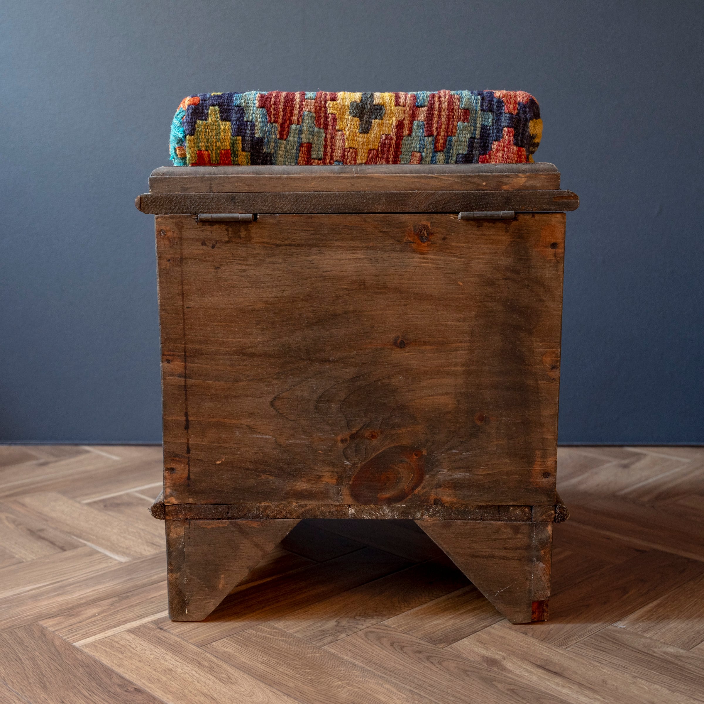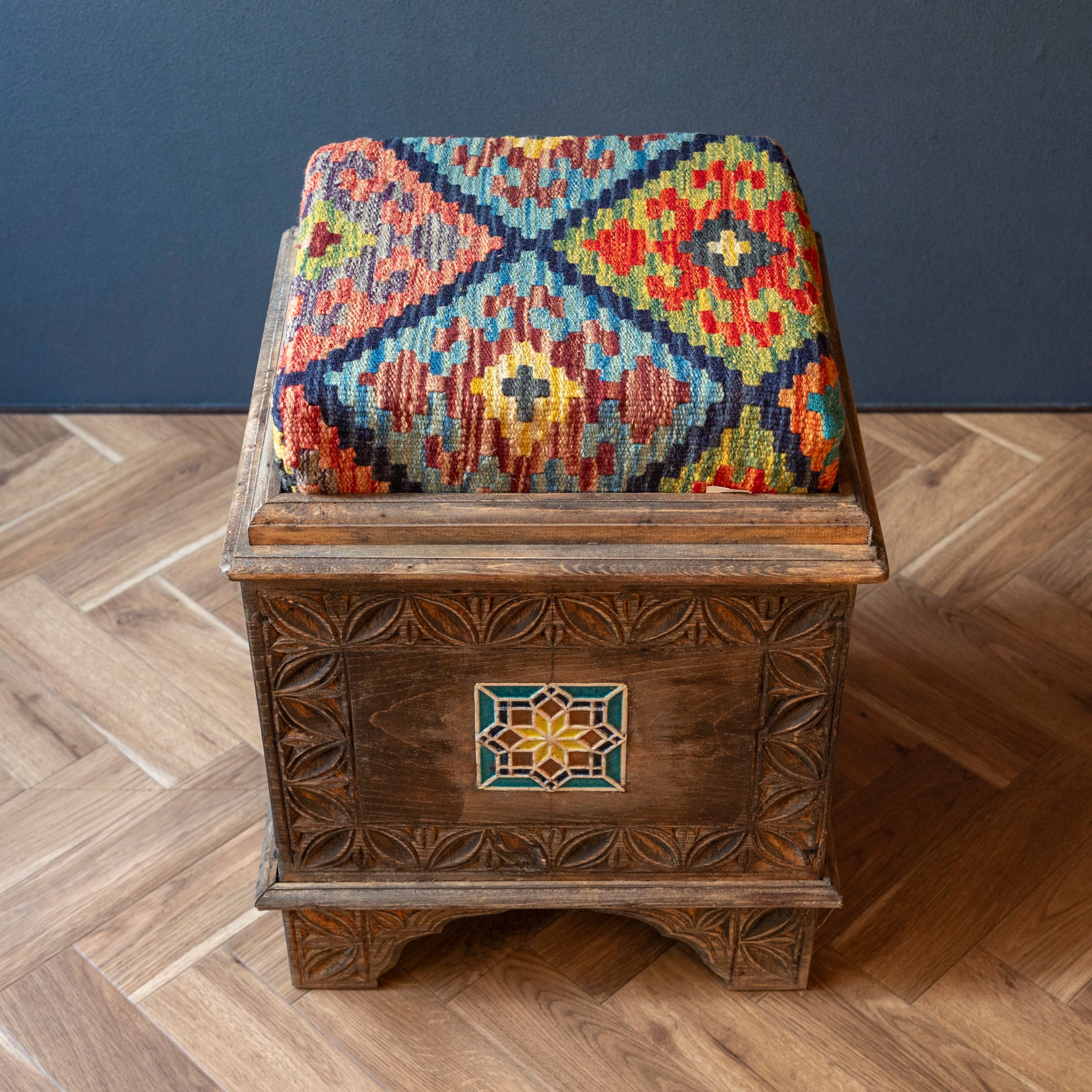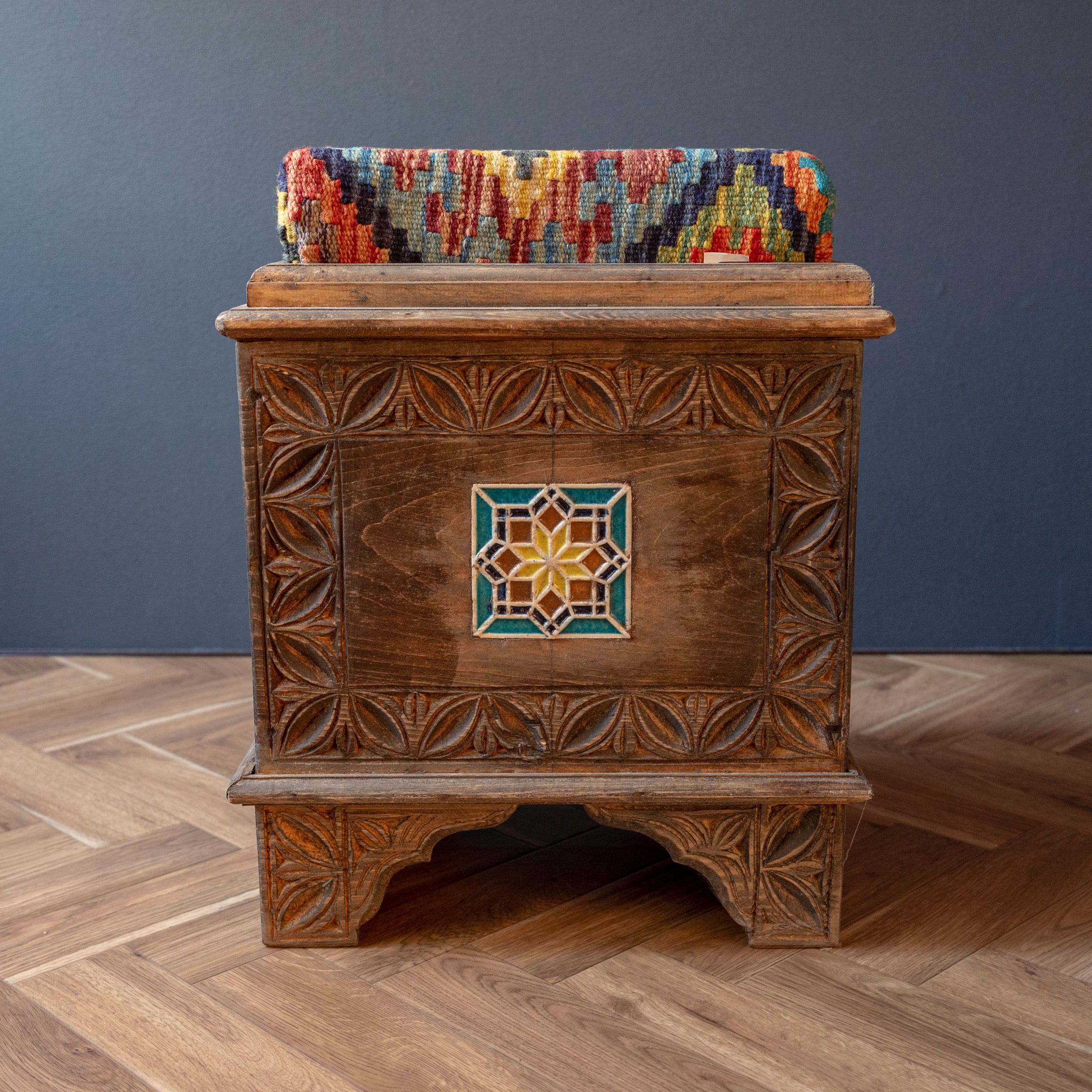 ウール製の手織りキリム(ラグ)を座面にあしらった、パキスタン製の椅子です。