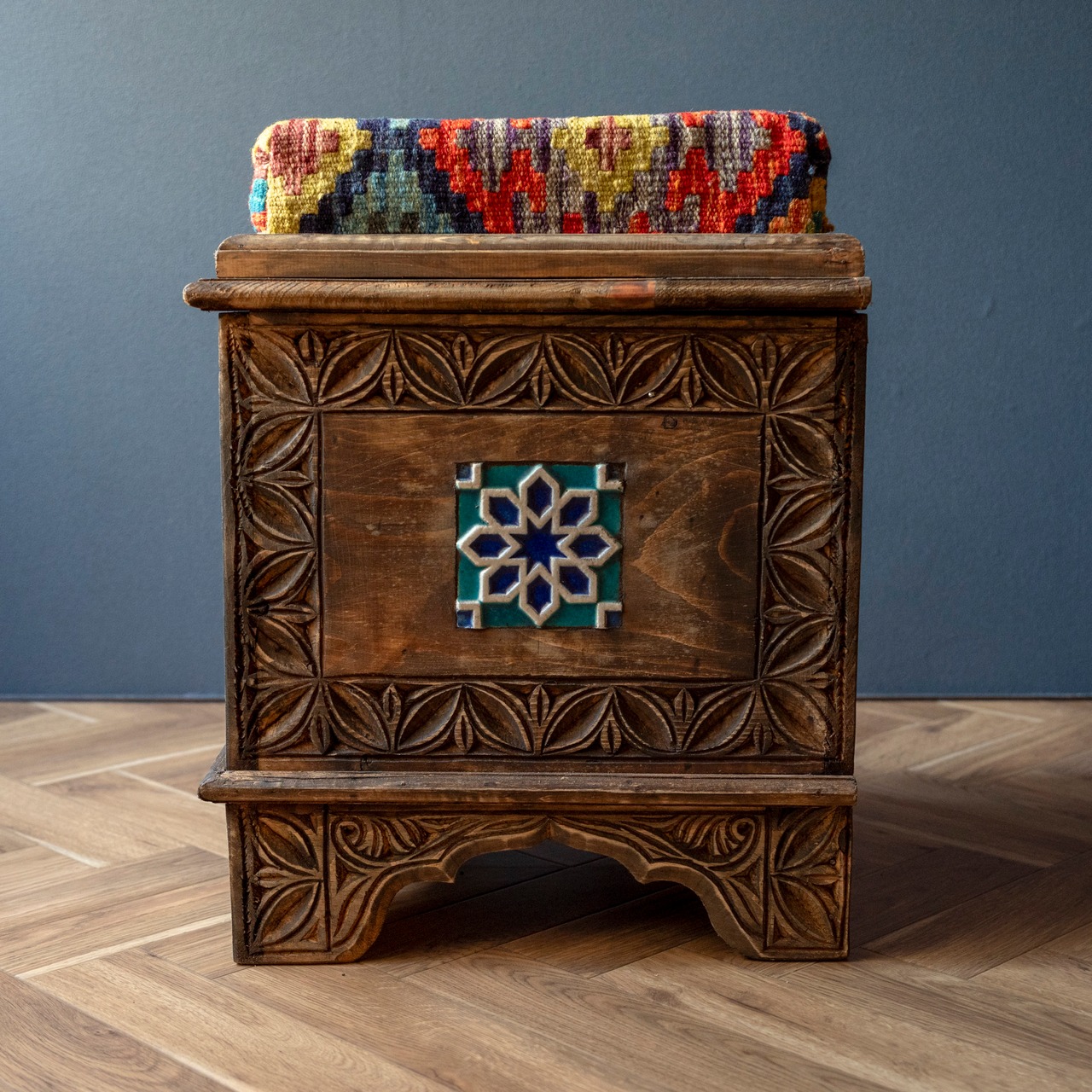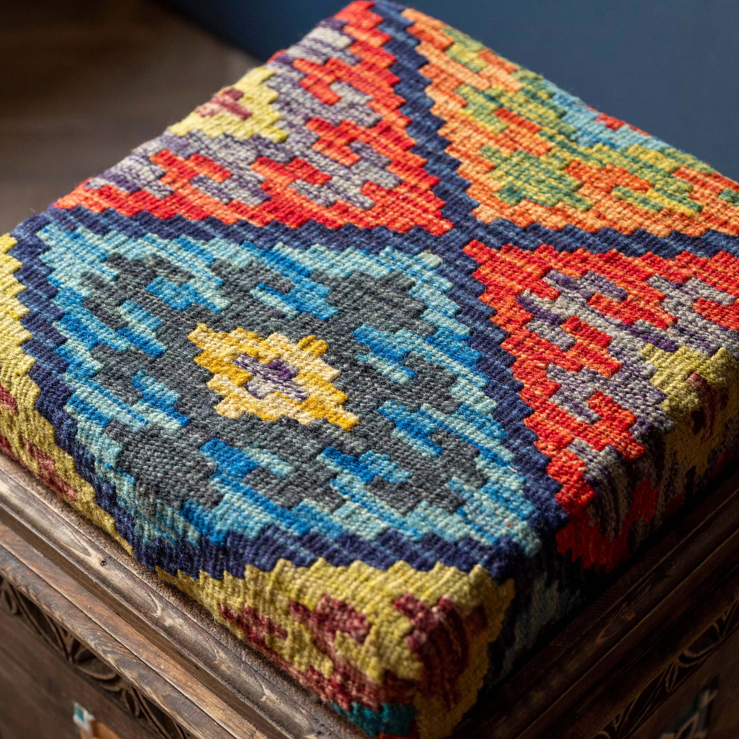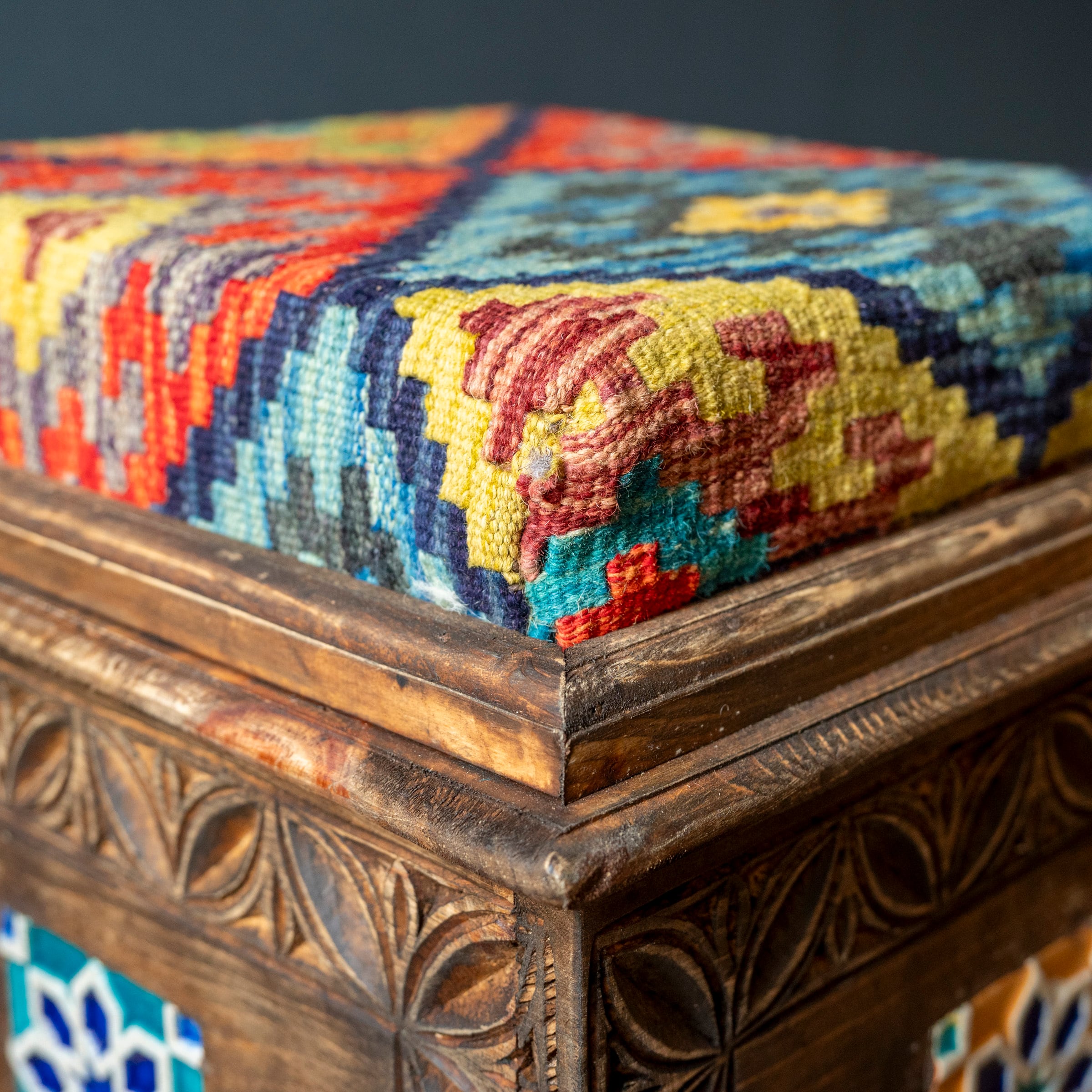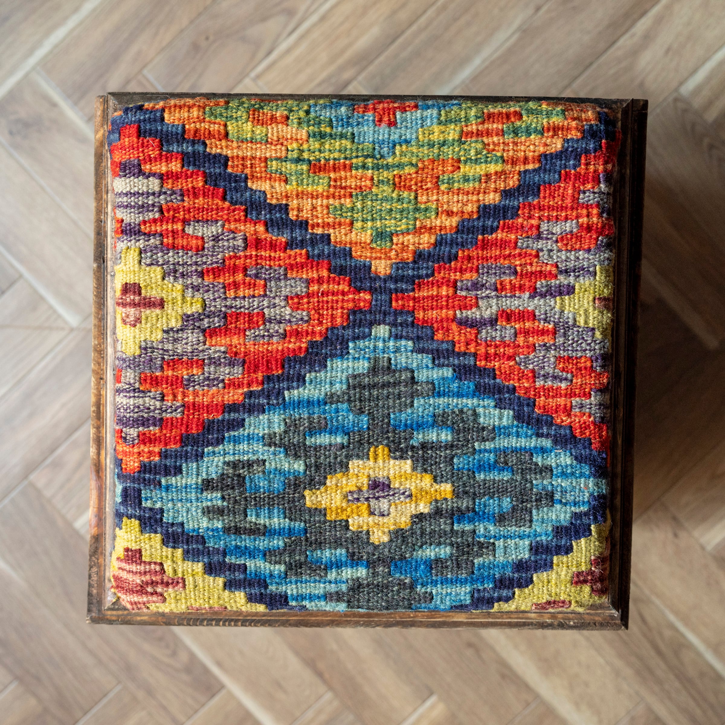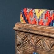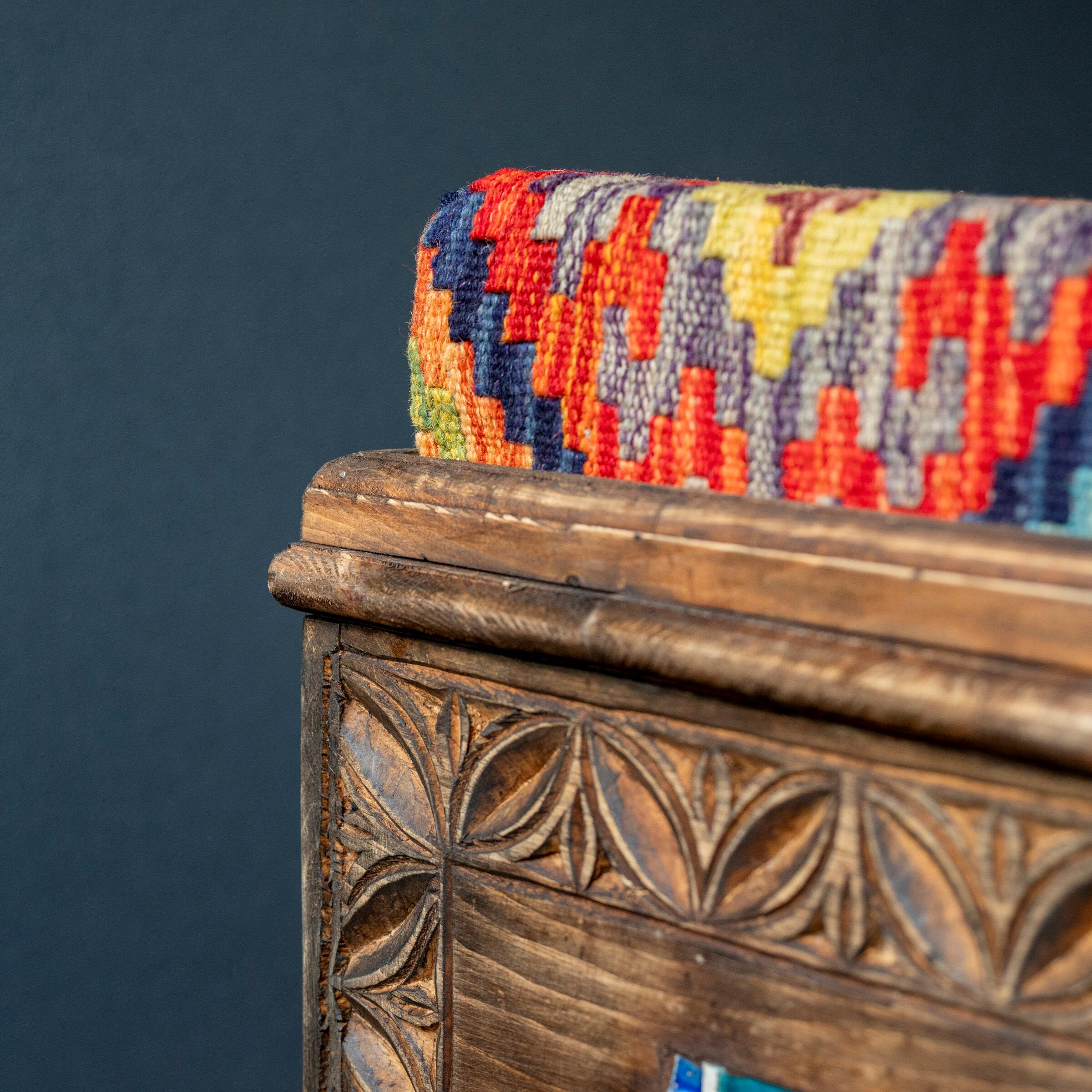 ウール製の手織りキリム(ラグ)を座面にあしらった、パキスタン製の椅子です。