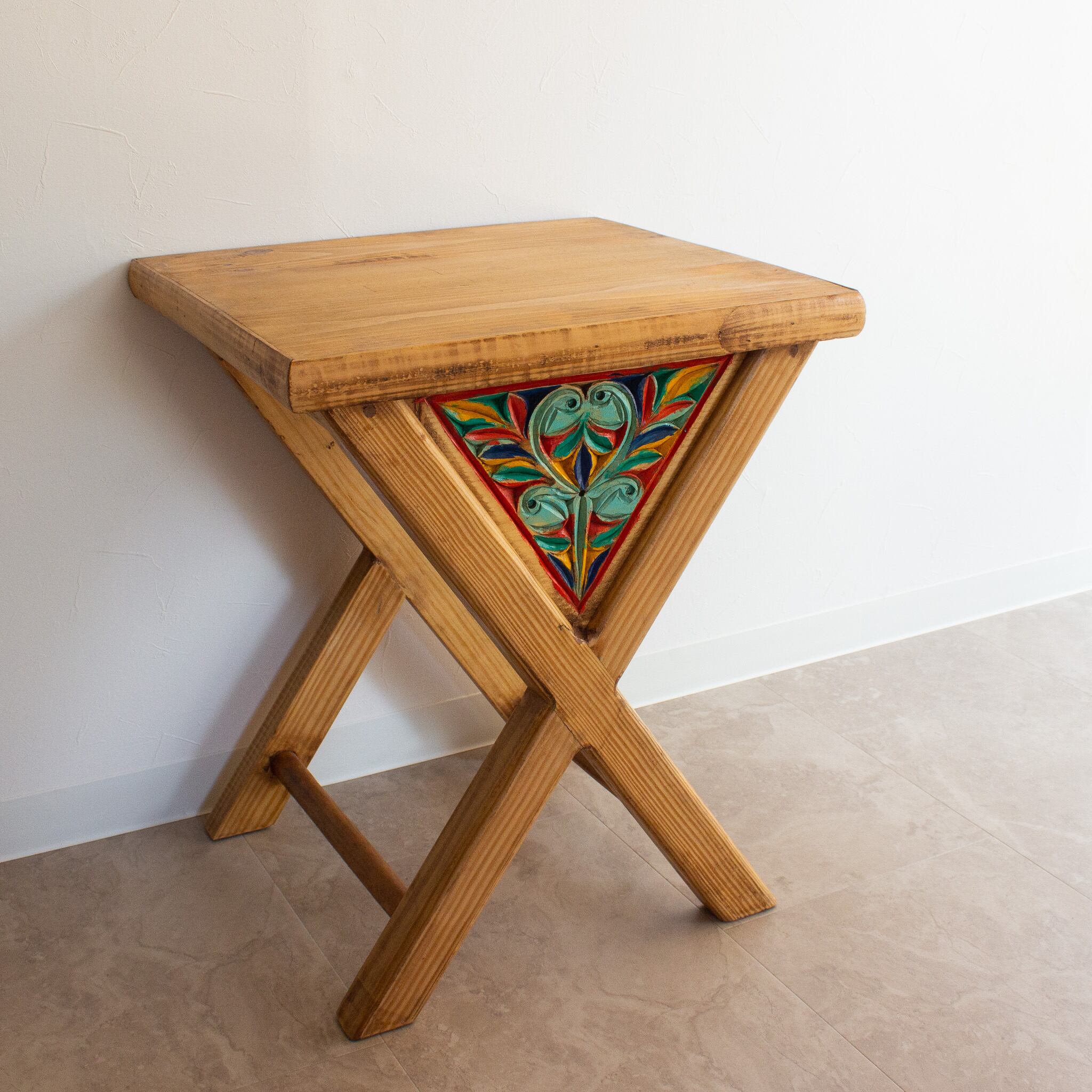 無垢材でつくられたサイドテーブル。天板から脚にかけて、木材がX字のように交差しているのが特徴的なデザインです。前面にはパキスタンらしいダイナミックな彫刻が施されています。