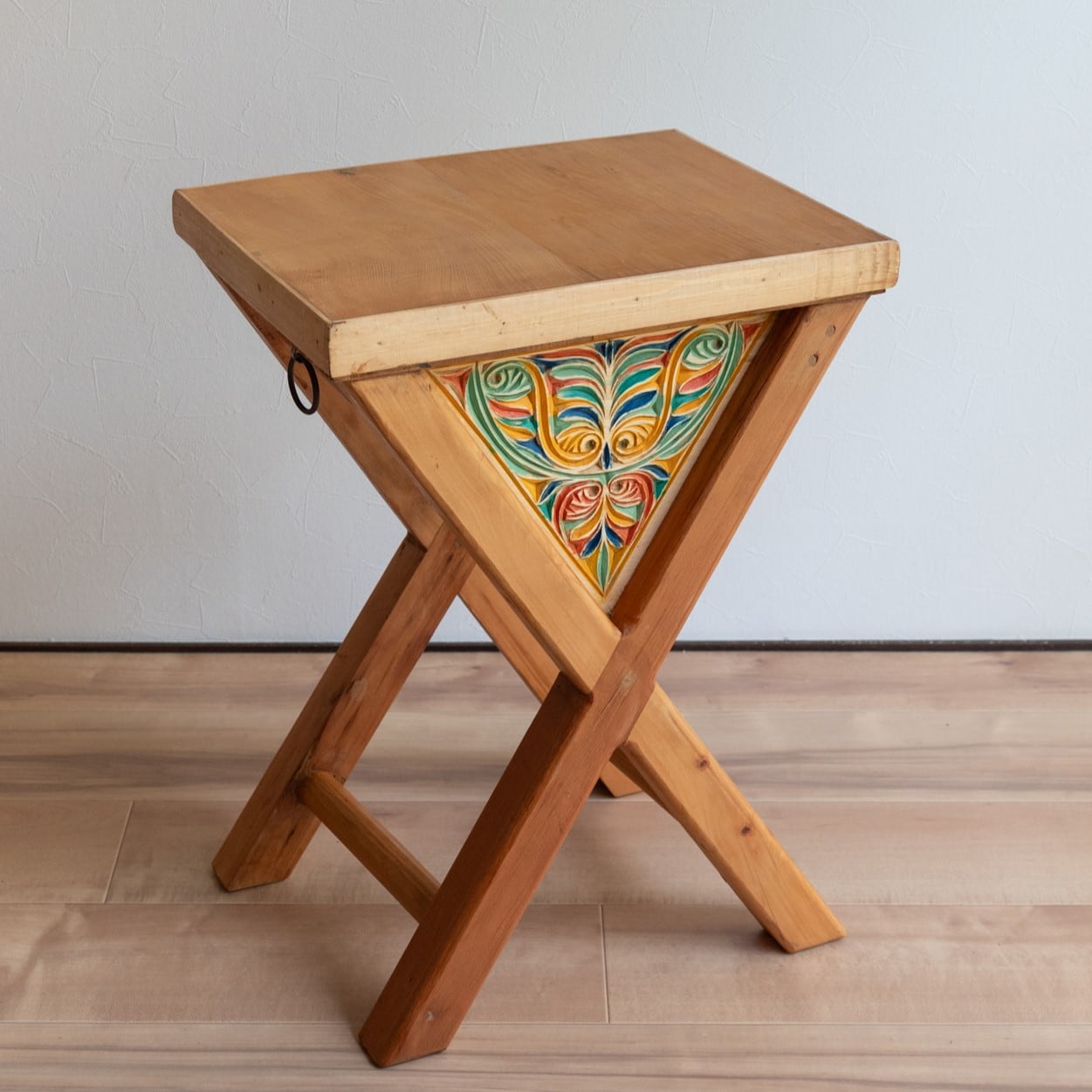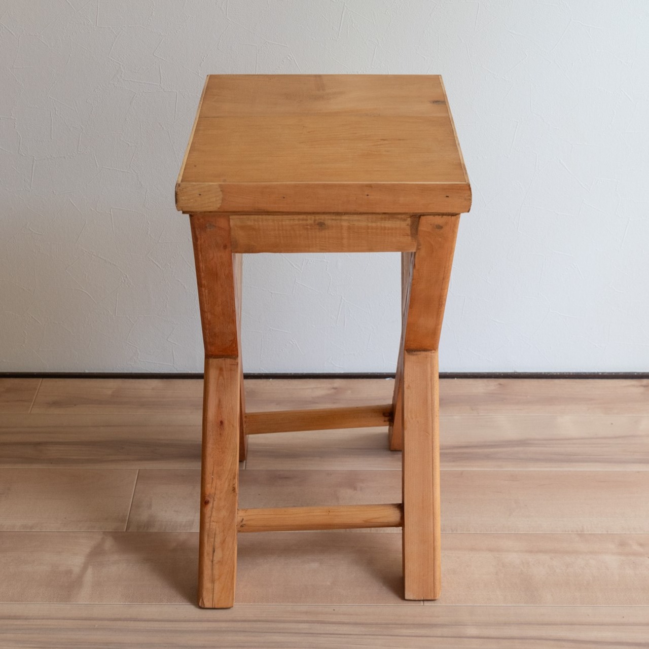 無垢材でつくられたサイドテーブル。天板から脚にかけて、木材がX字のように交差しているのが特徴的なデザインです。