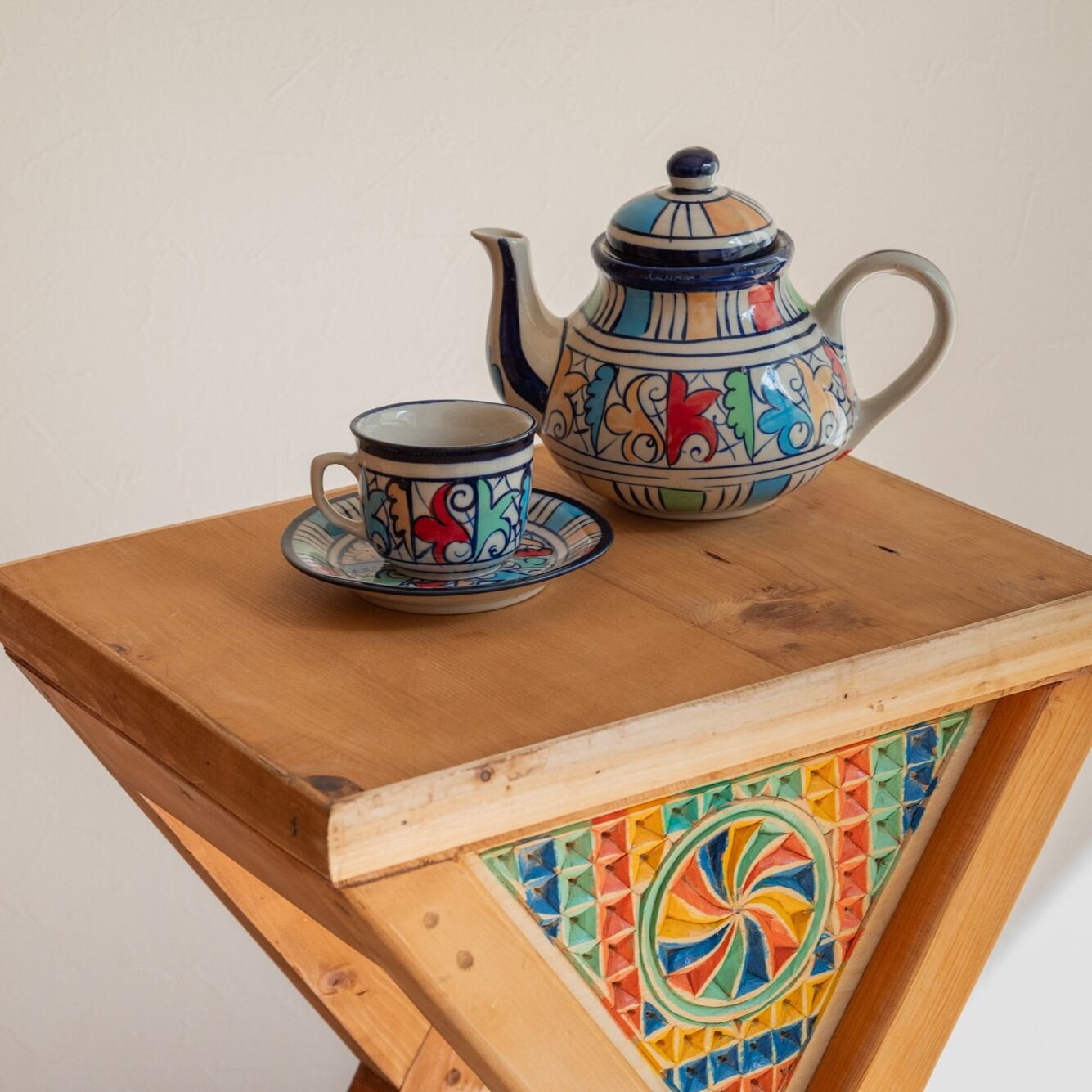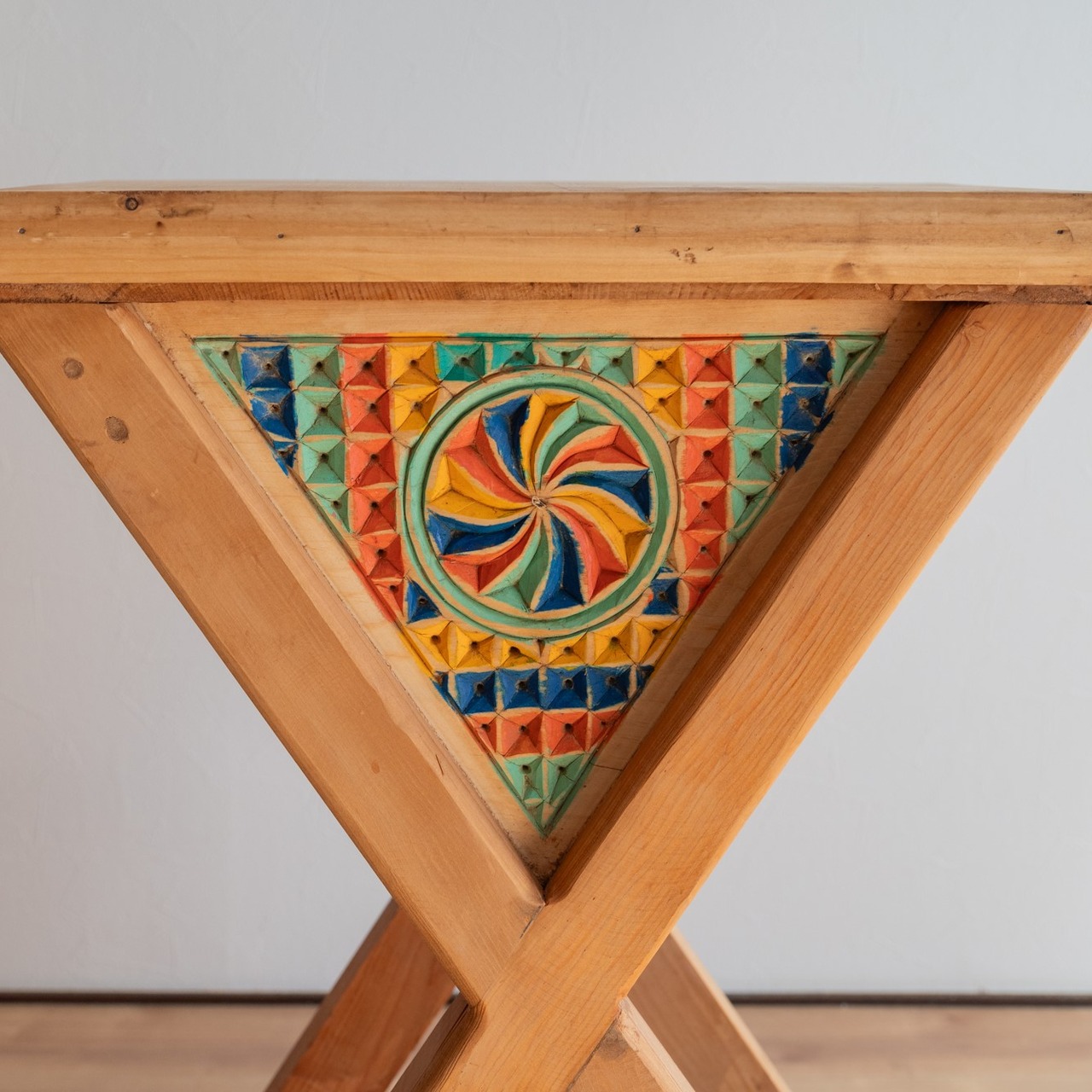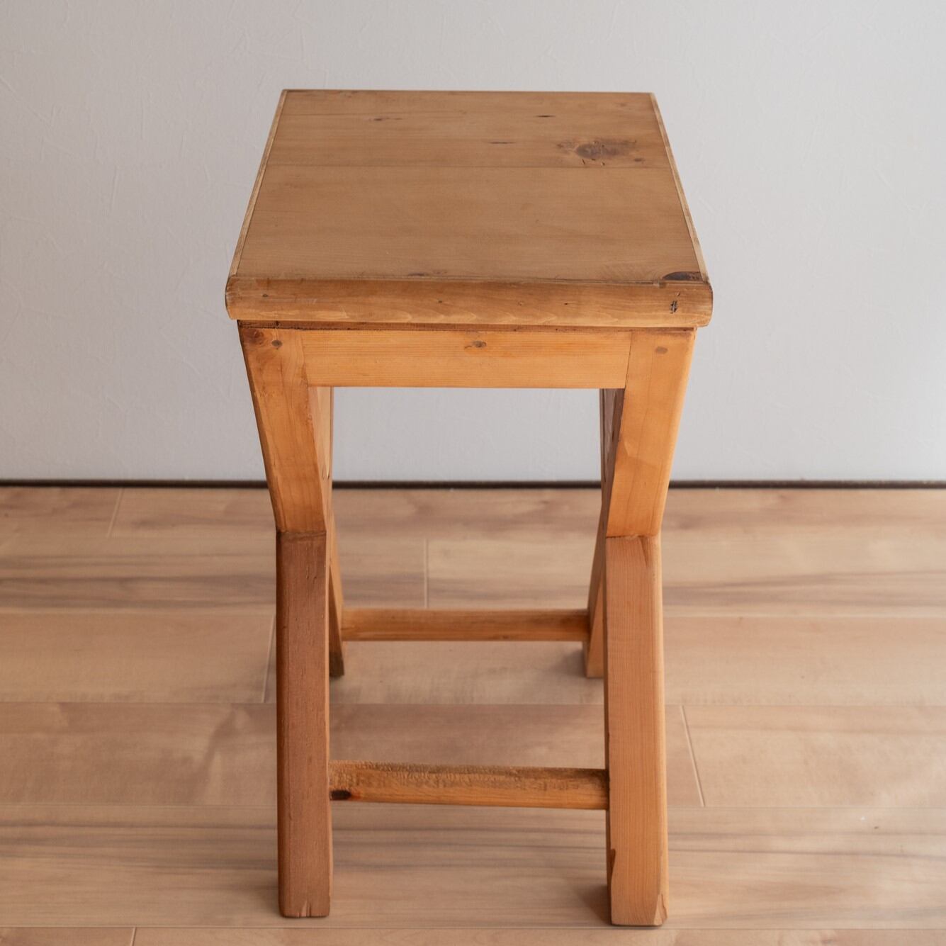 無垢材でつくられたサイドテーブル。天板から脚にかけて、木材がX字のように交差しているのが特徴的なデザインです。