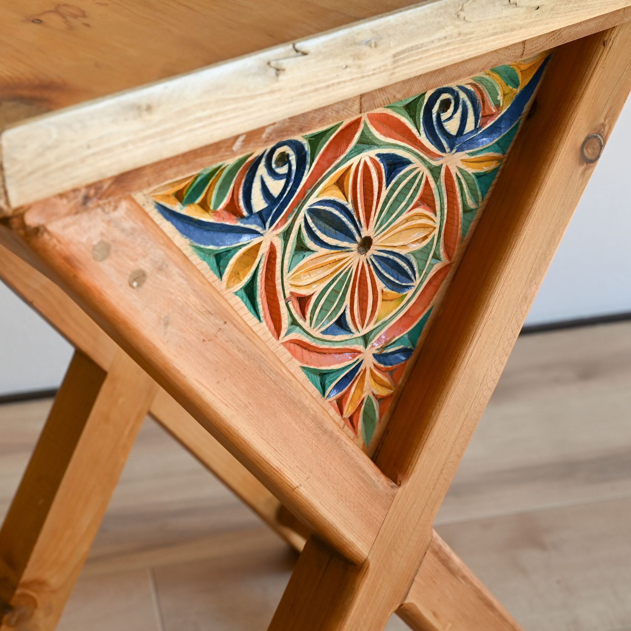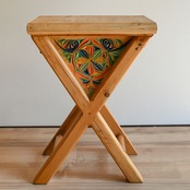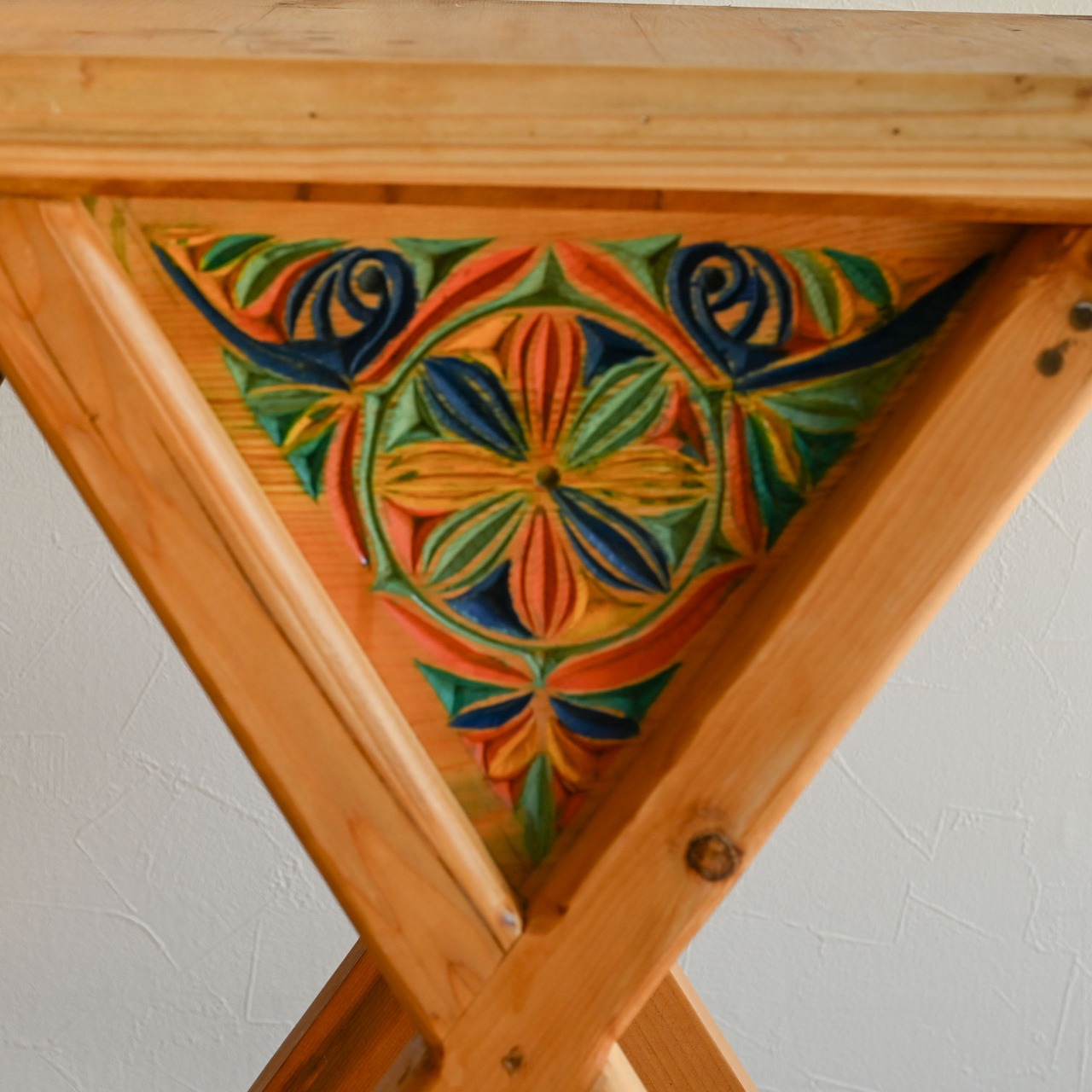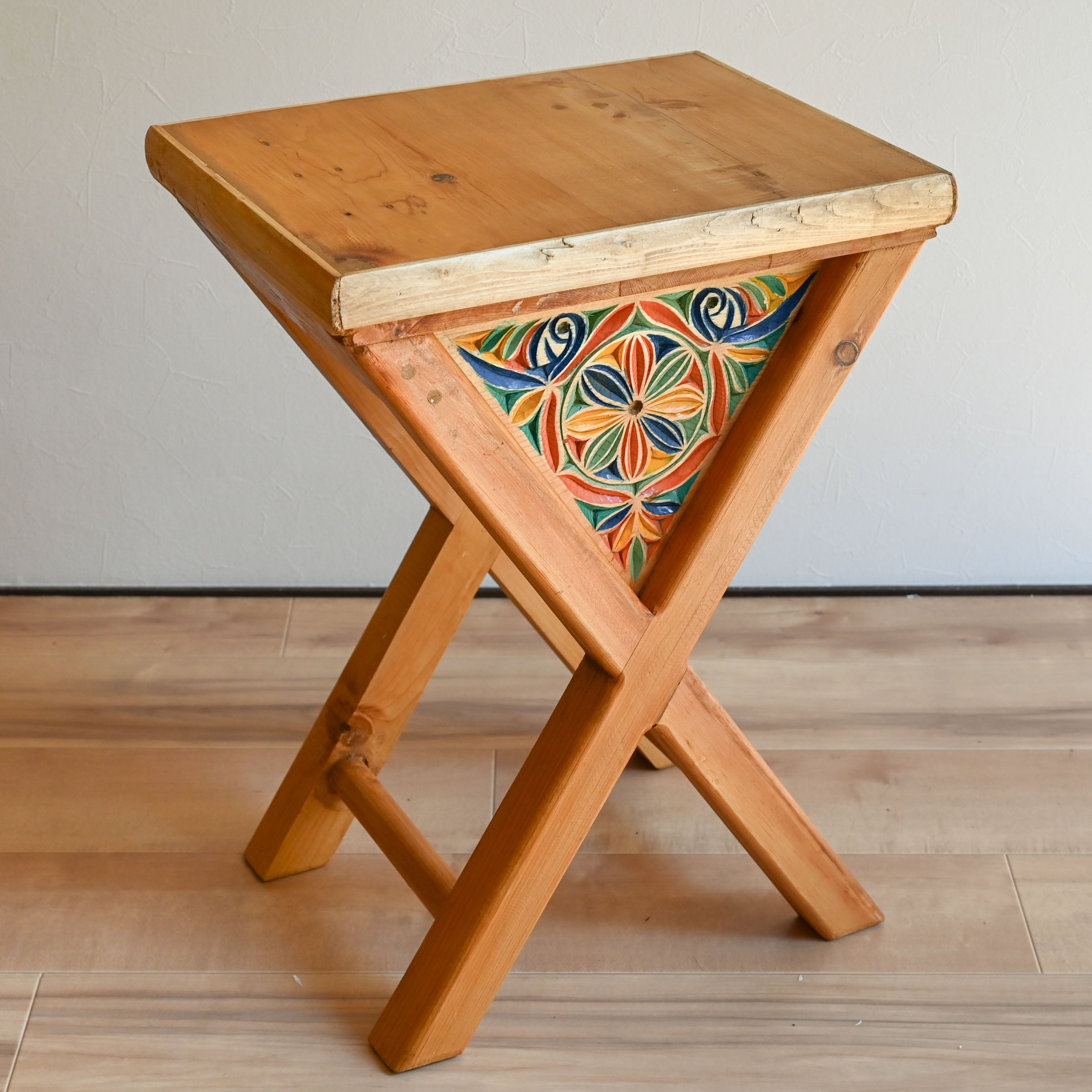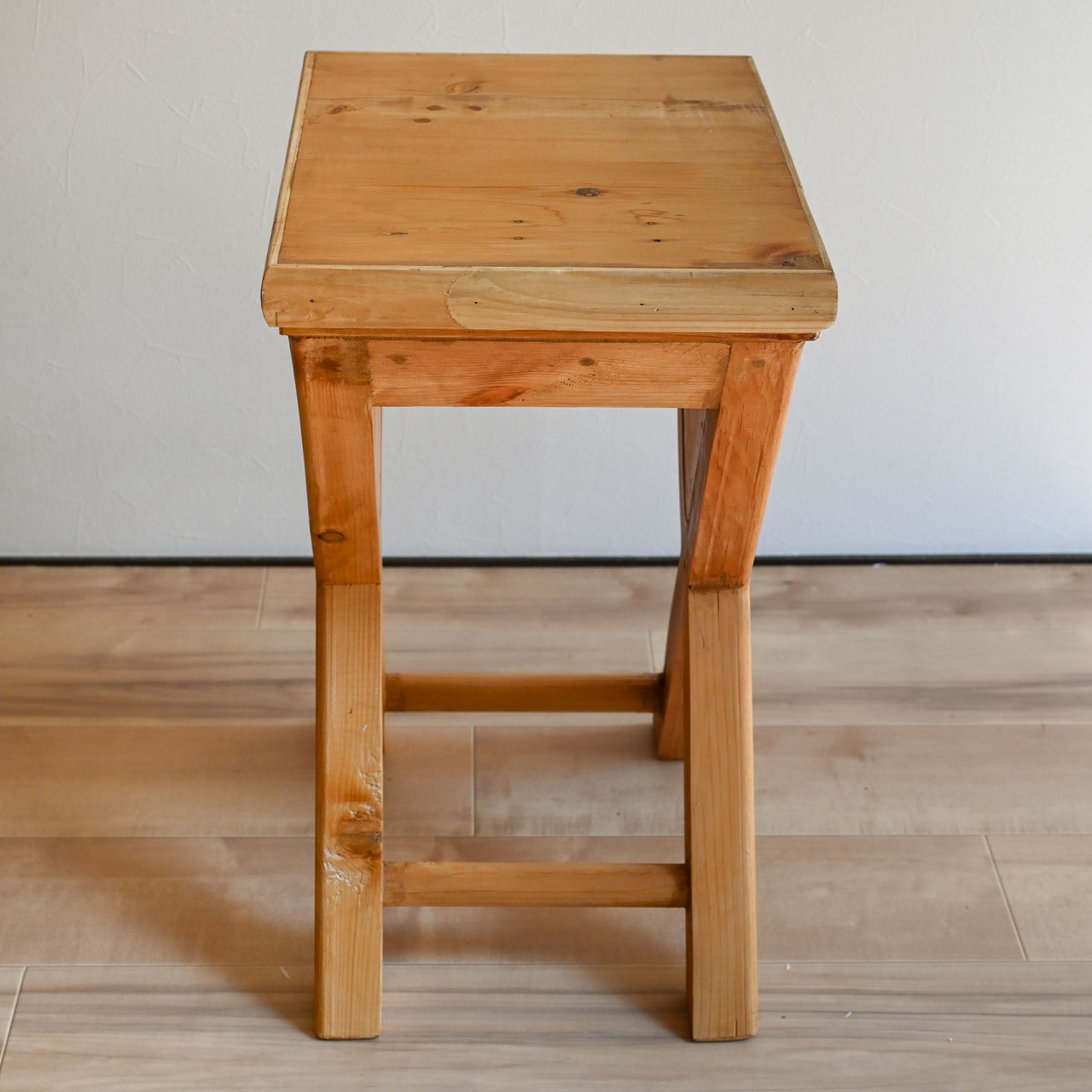 無垢材でつくられたサイドテーブル。天板から脚にかけて、木材がX字のように交差しているのが特徴的なデザインです。