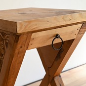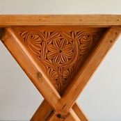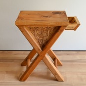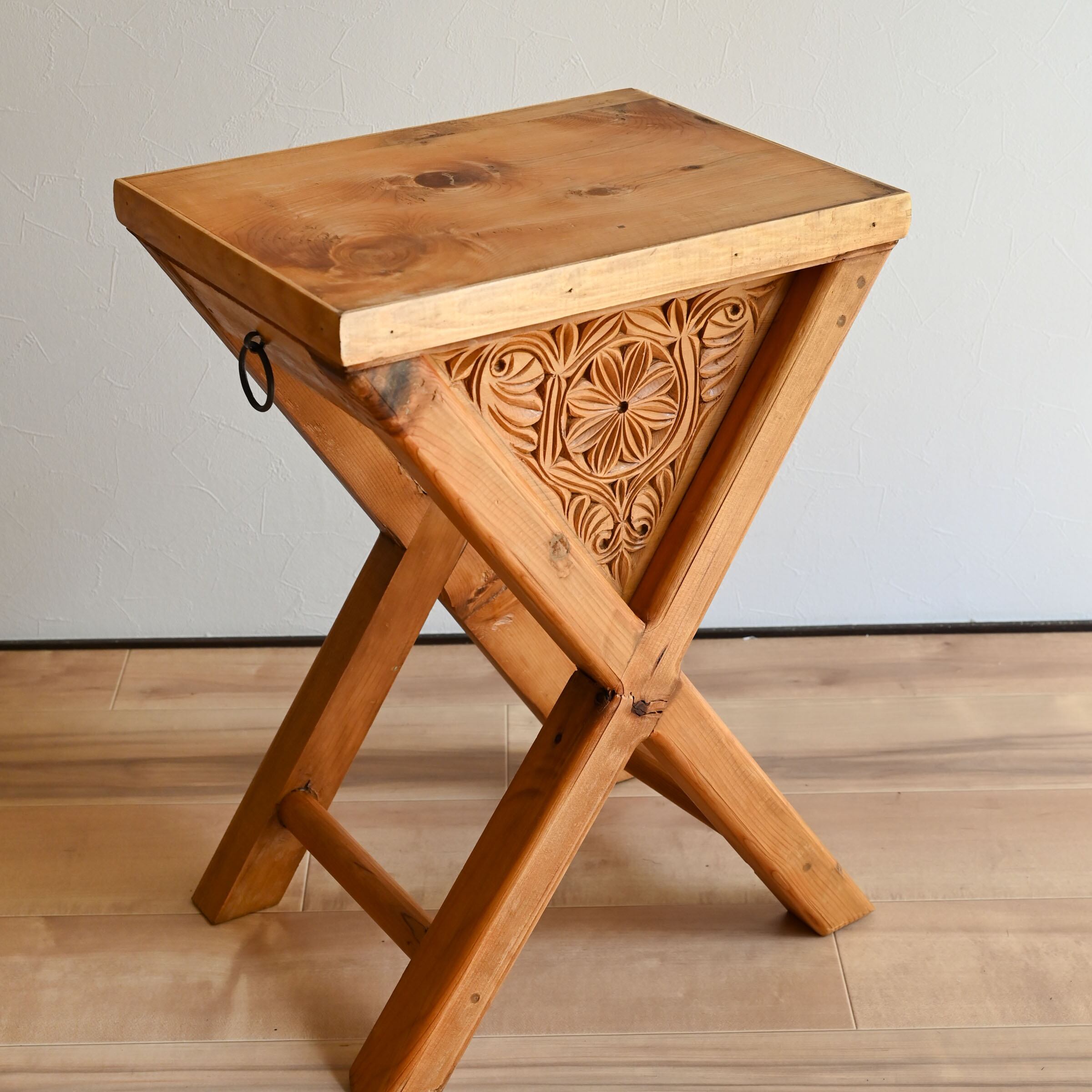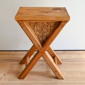 無垢材でつくられたサイドテーブル。天板から脚にかけて、木材がX字のように交差しているのが特徴的なデザインです。前面にはパキスタンらしいダイナミックな彫刻が施されています。