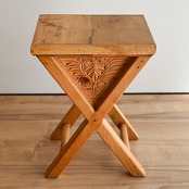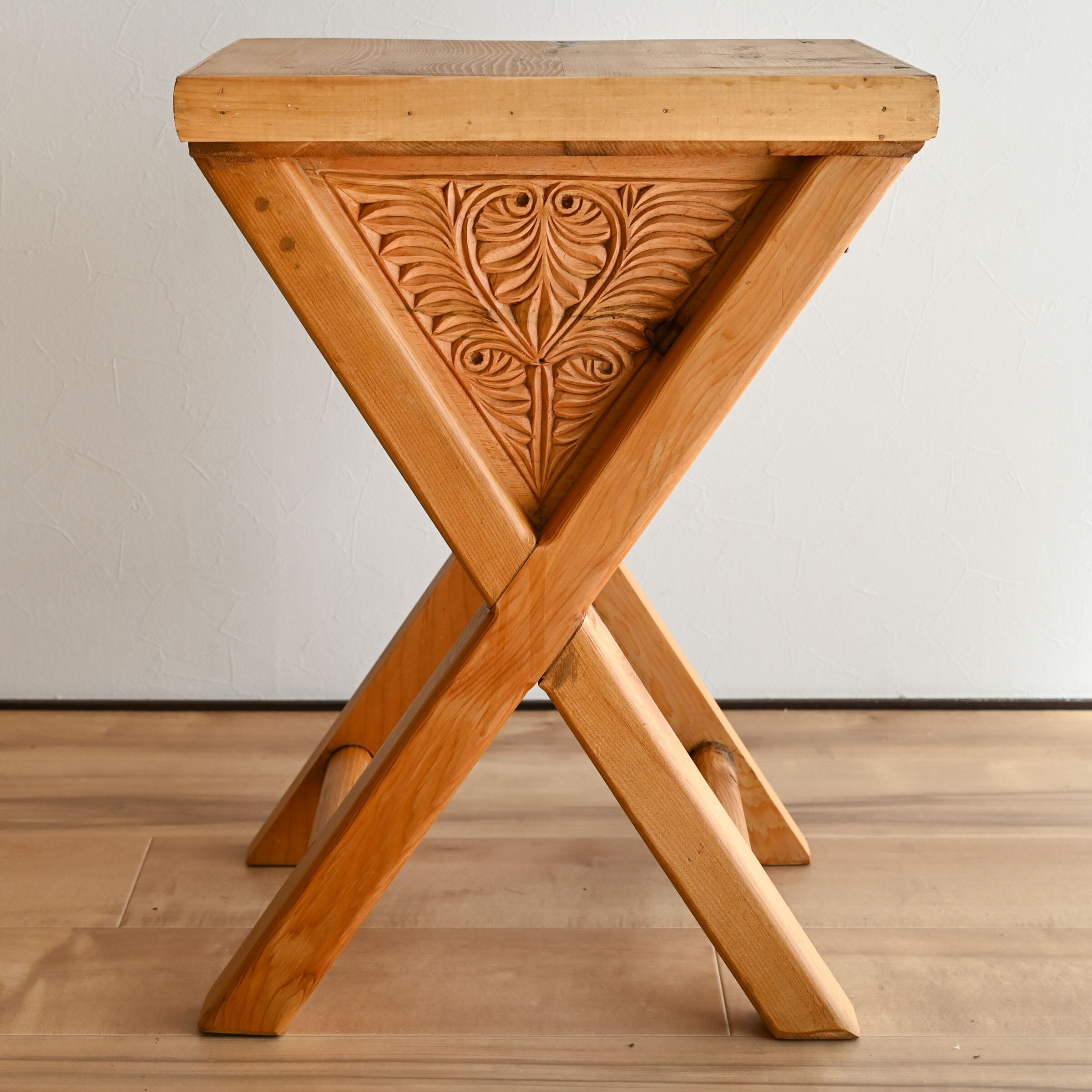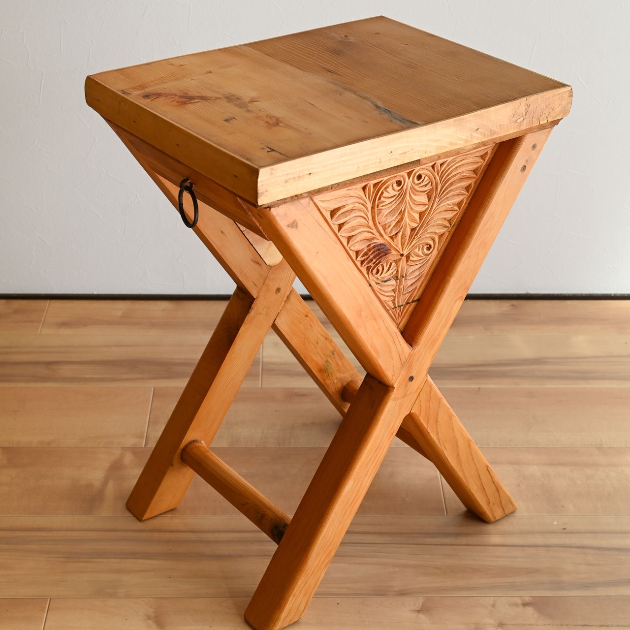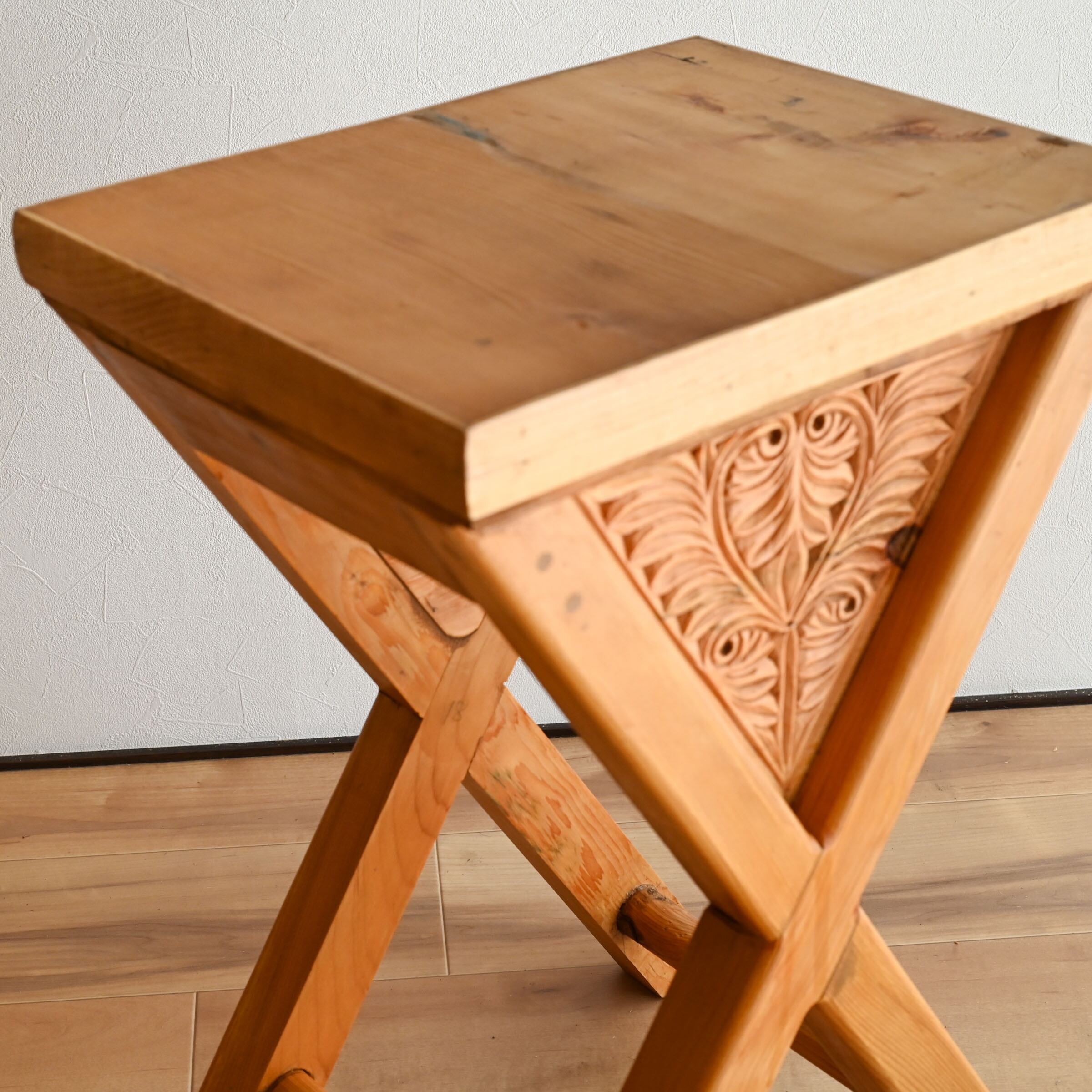 無垢材でつくられたサイドテーブル。天板から脚にかけて、木材がX字のように交差しているのが特徴的なデザインです。前面にはパキスタンらしいダイナミックな彫刻が施されています。