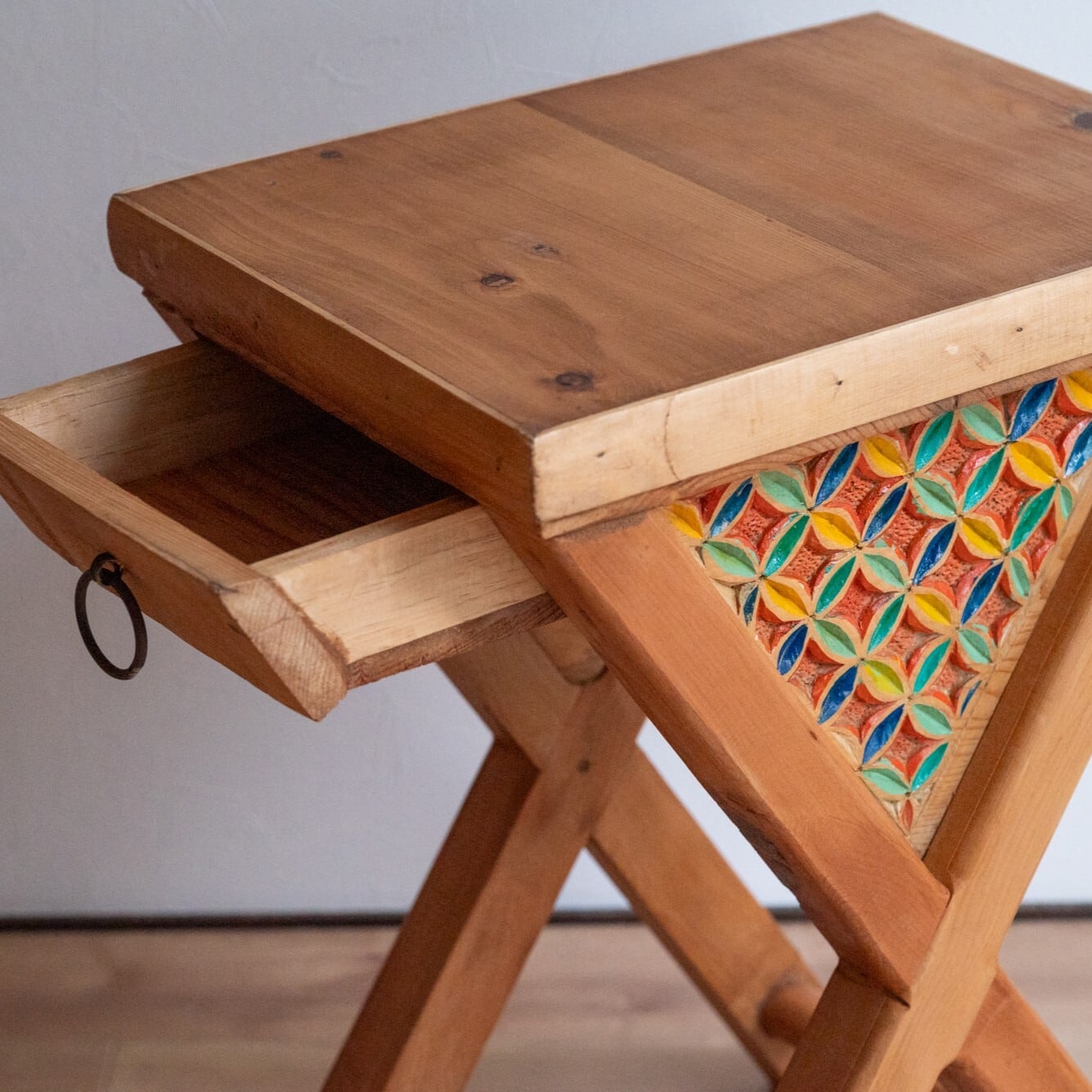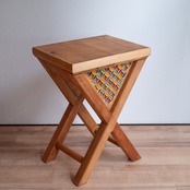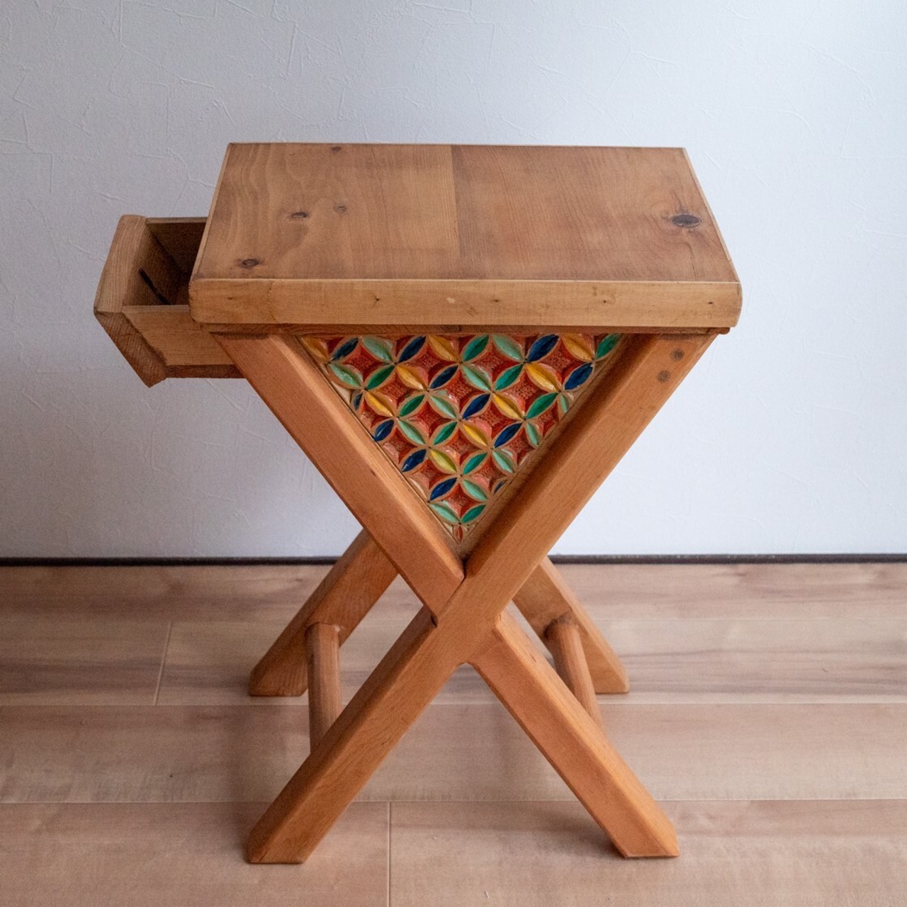 無垢材でつくられたサイドテーブル。天板から脚にかけて、木材がX字のように交差しているのが特徴的なデザインです。