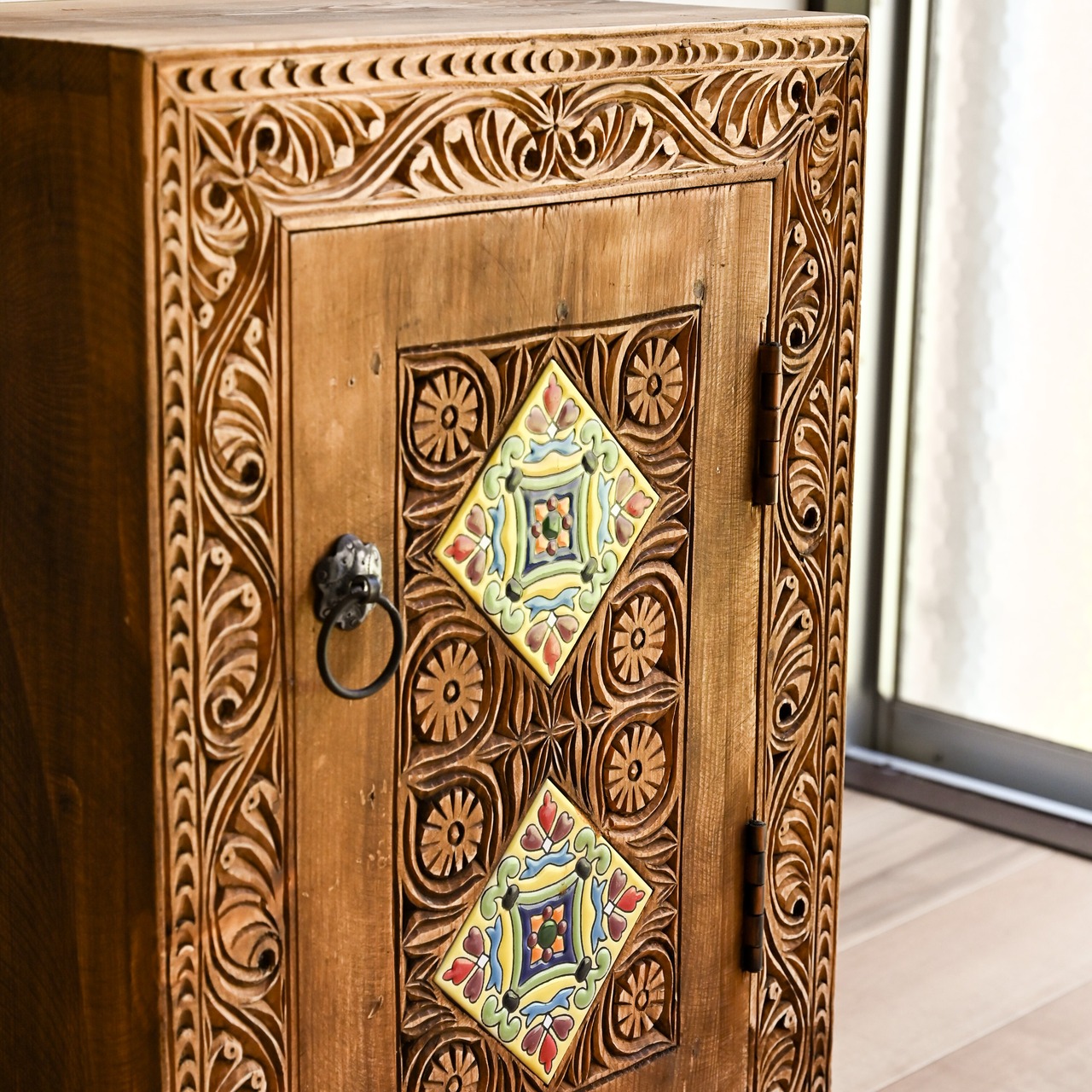 扉にはめたハンドメイドのタイルが象徴的なキャビネット。
