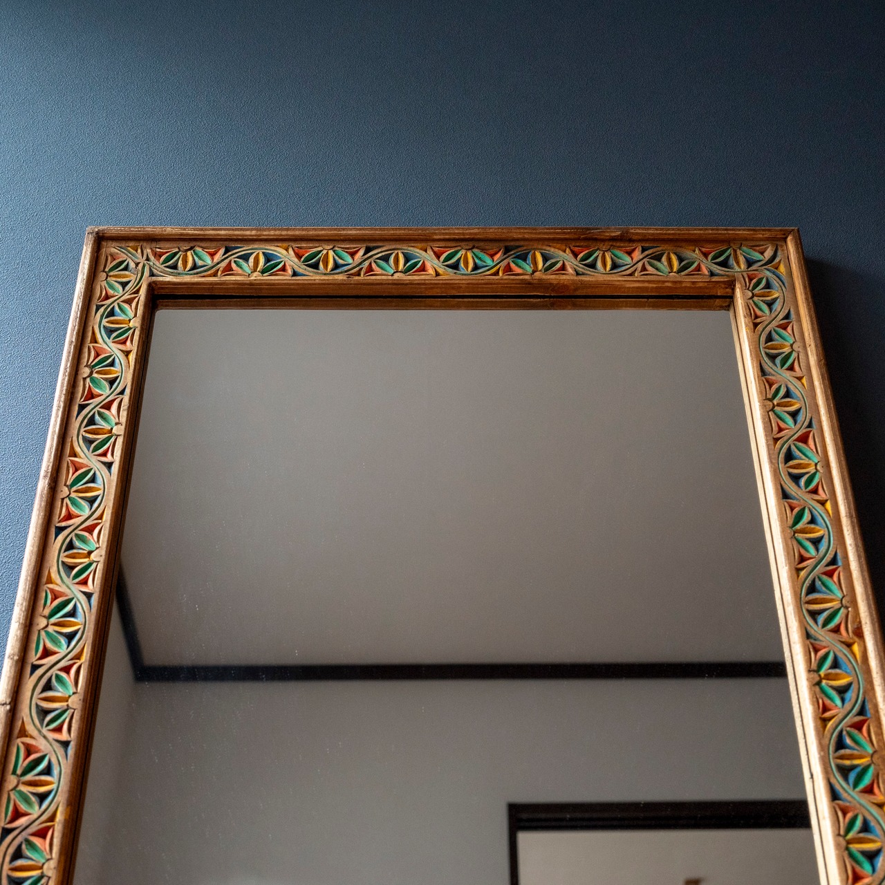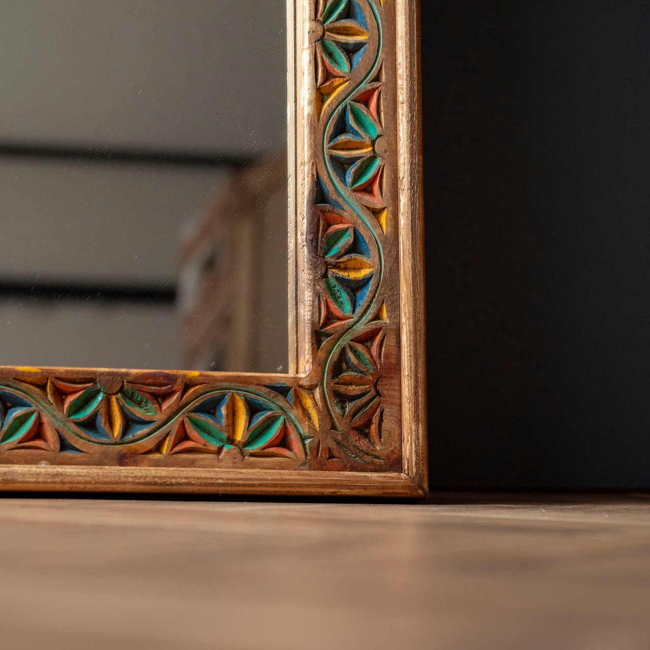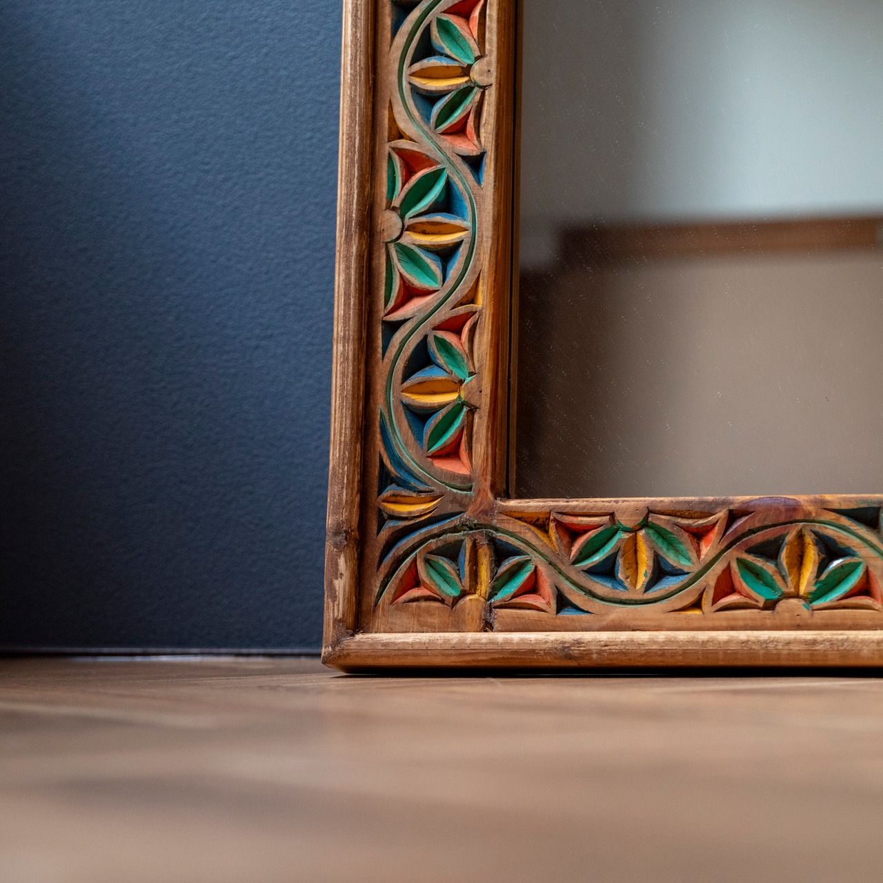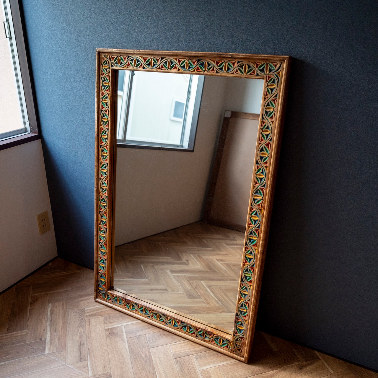 太めの木製フレームに手彫りの彫刻をあしらったミラー。