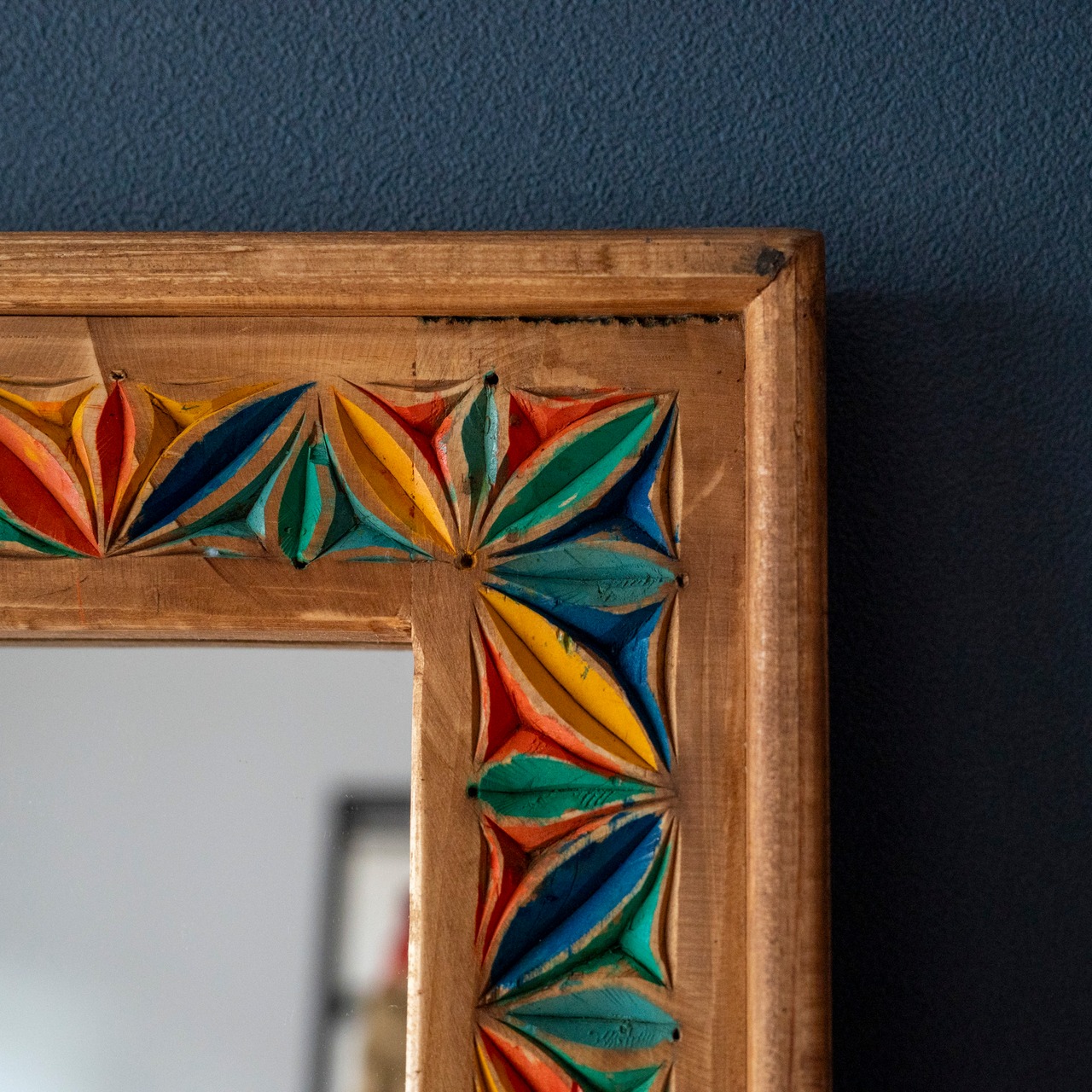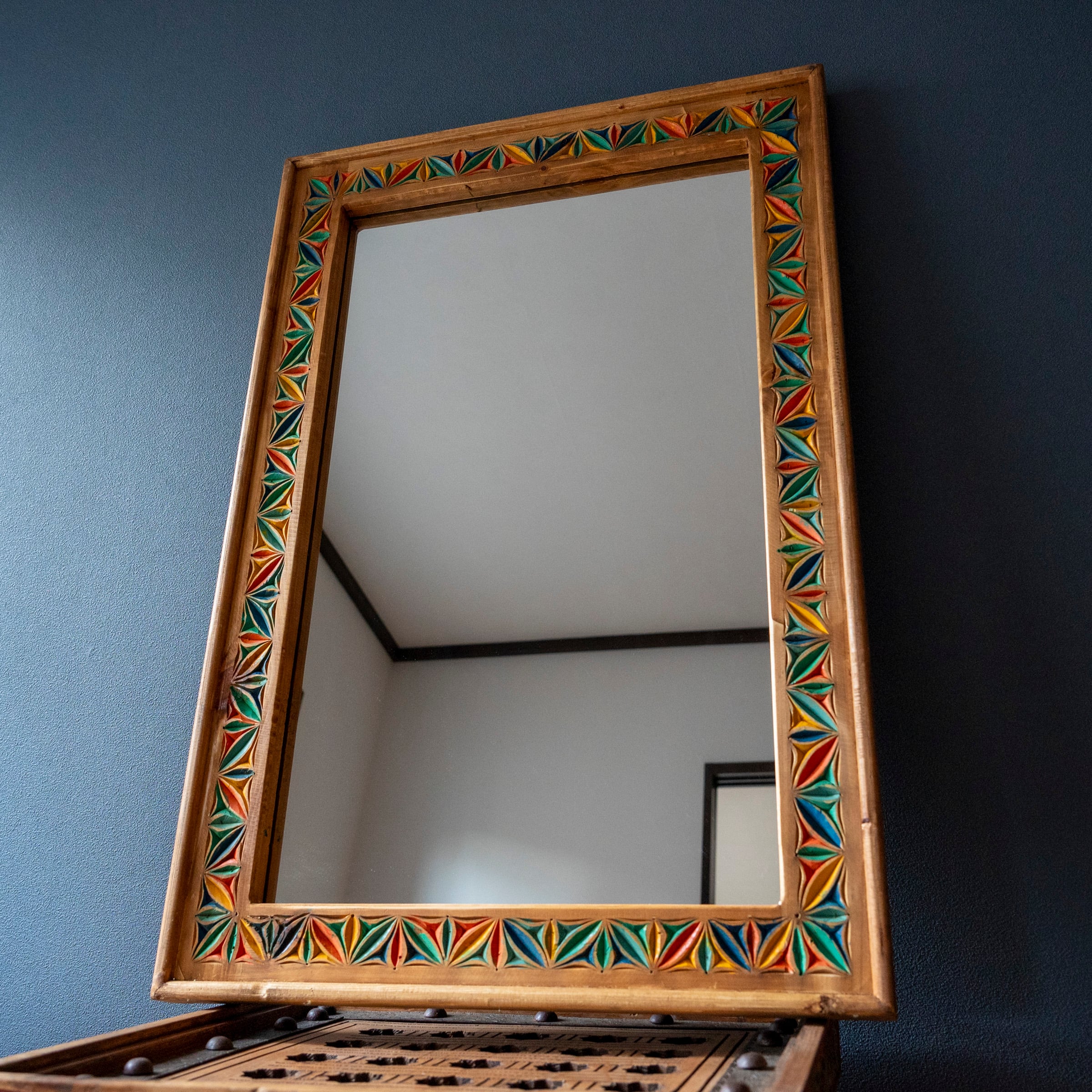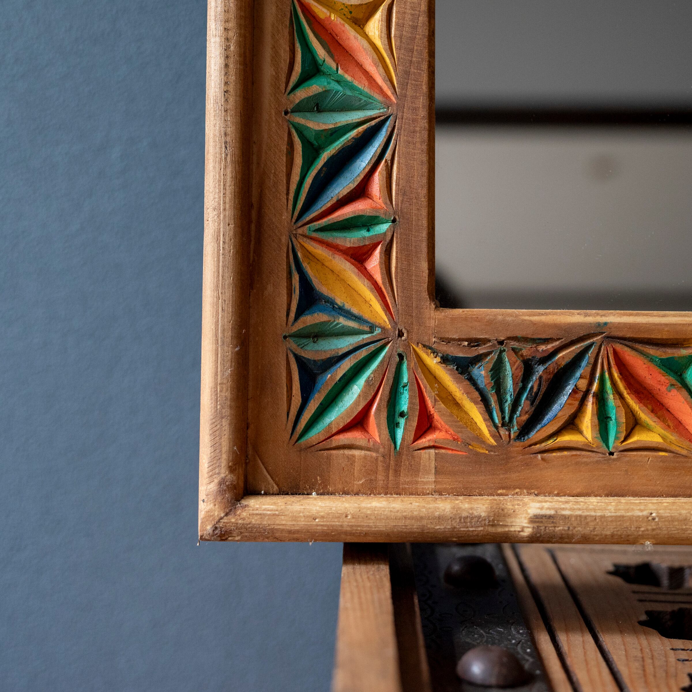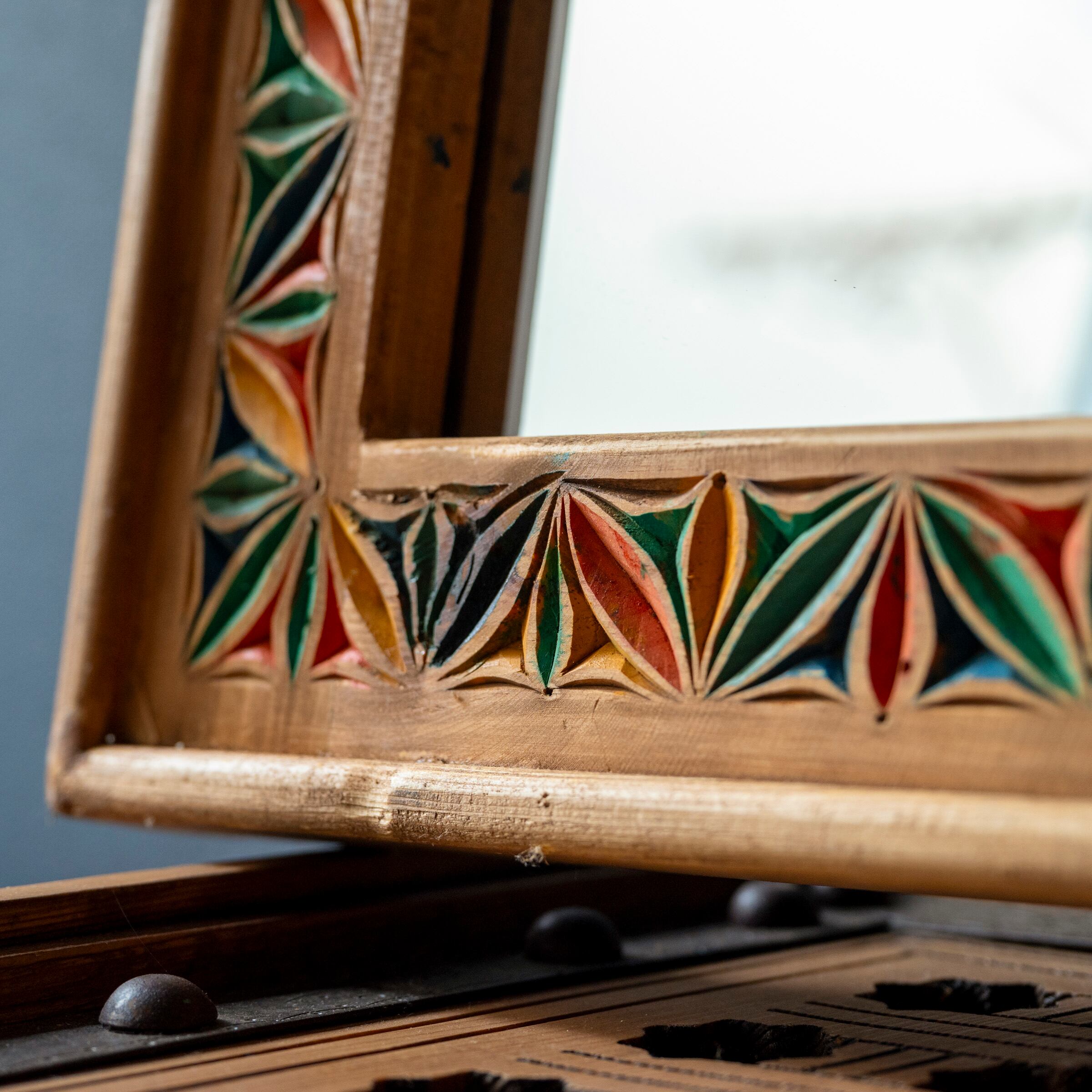 太めの木製フレームに手彫りの彫刻をあしらったミラー。