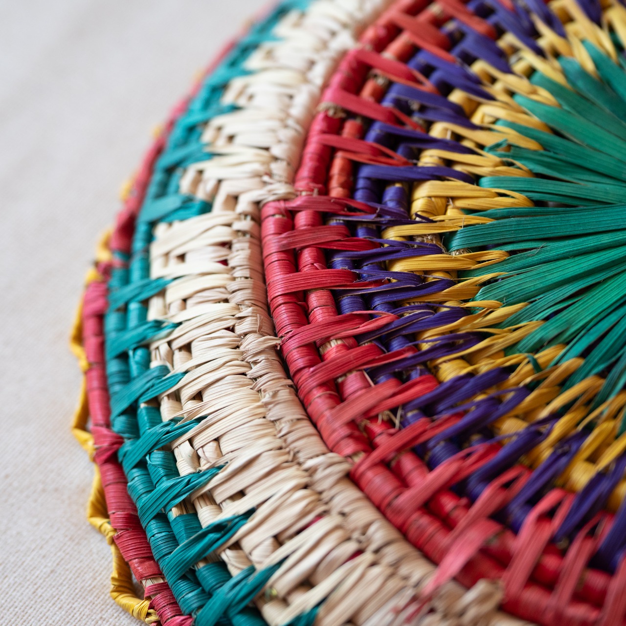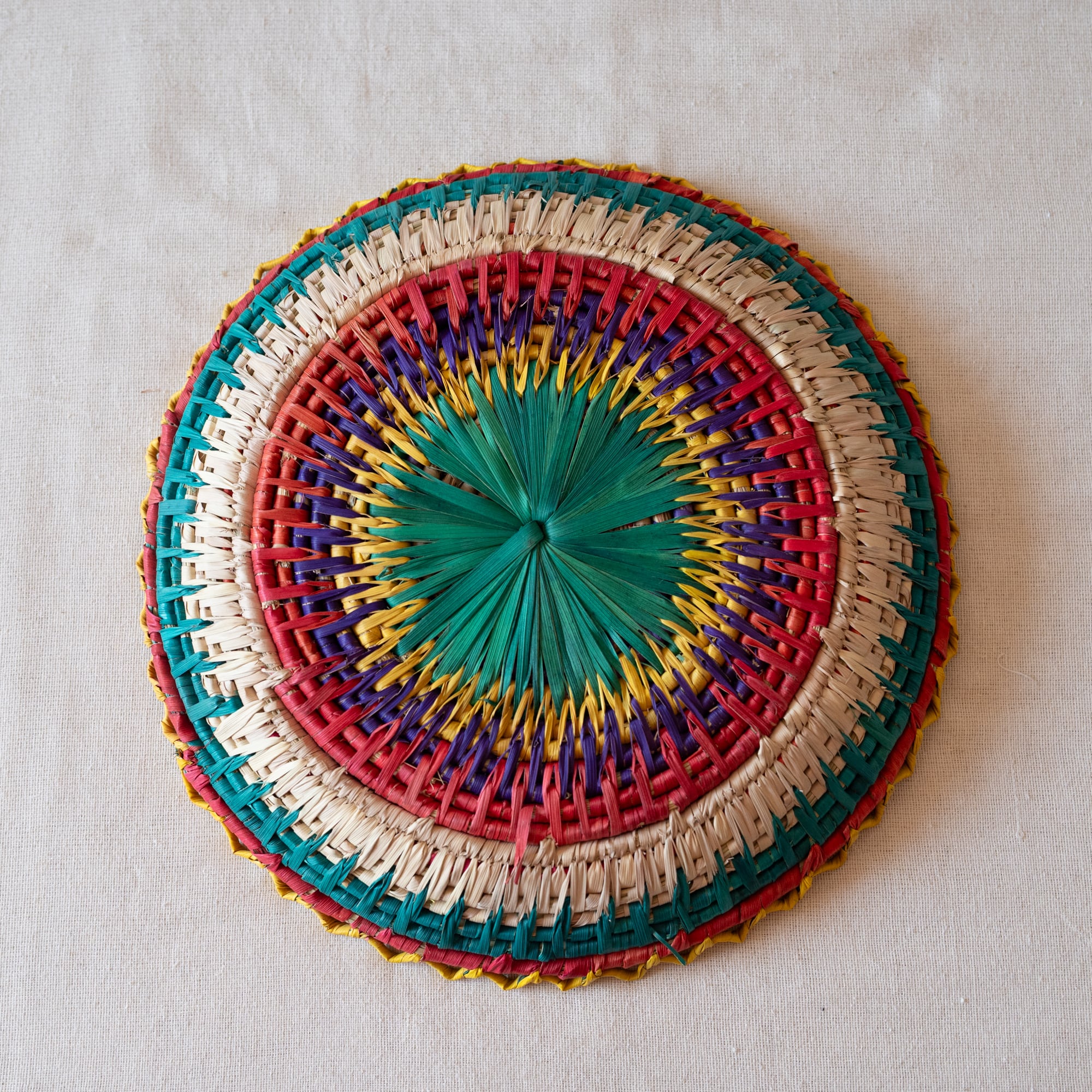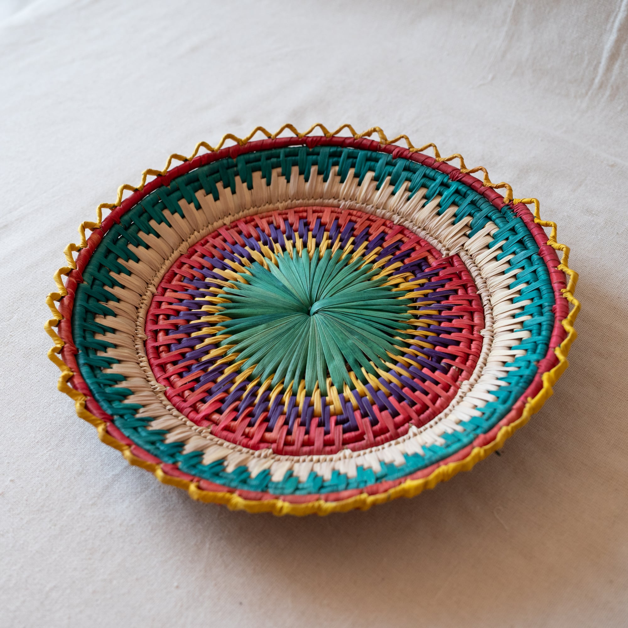 パキスタンの村の女性たちが、ナツメヤシの葉を手編みしてつくったカゴ。見ていると元気になるようなカラフルな色合いです。