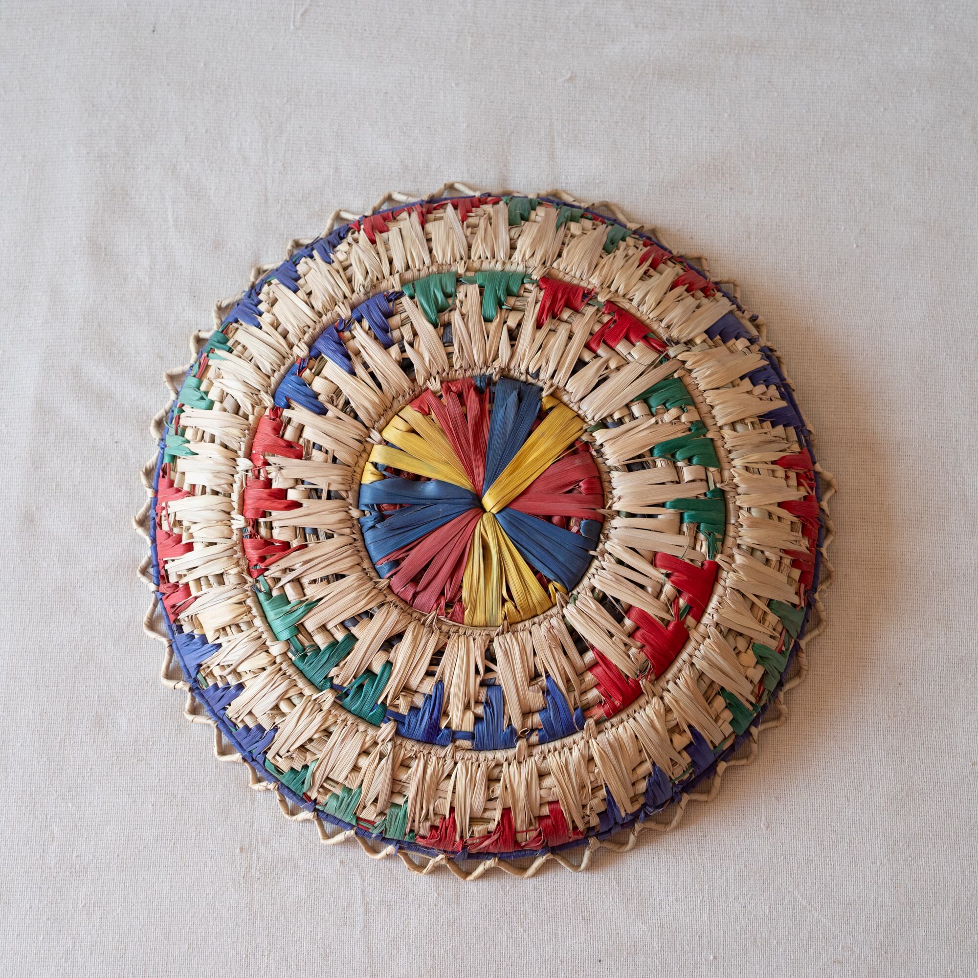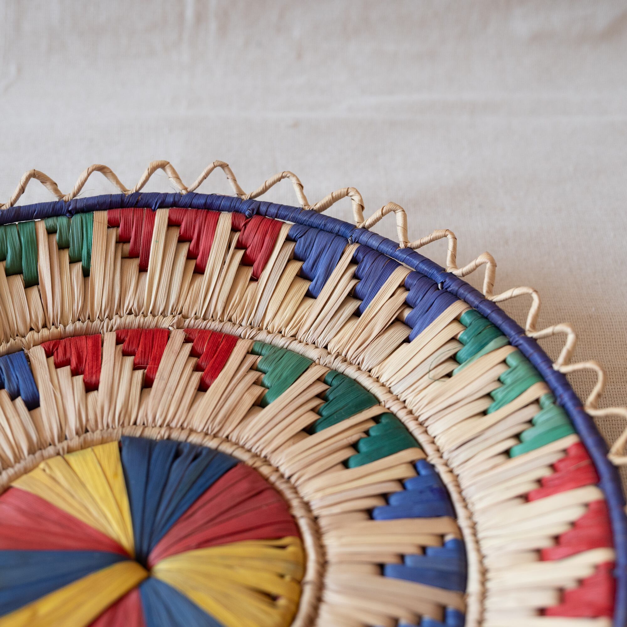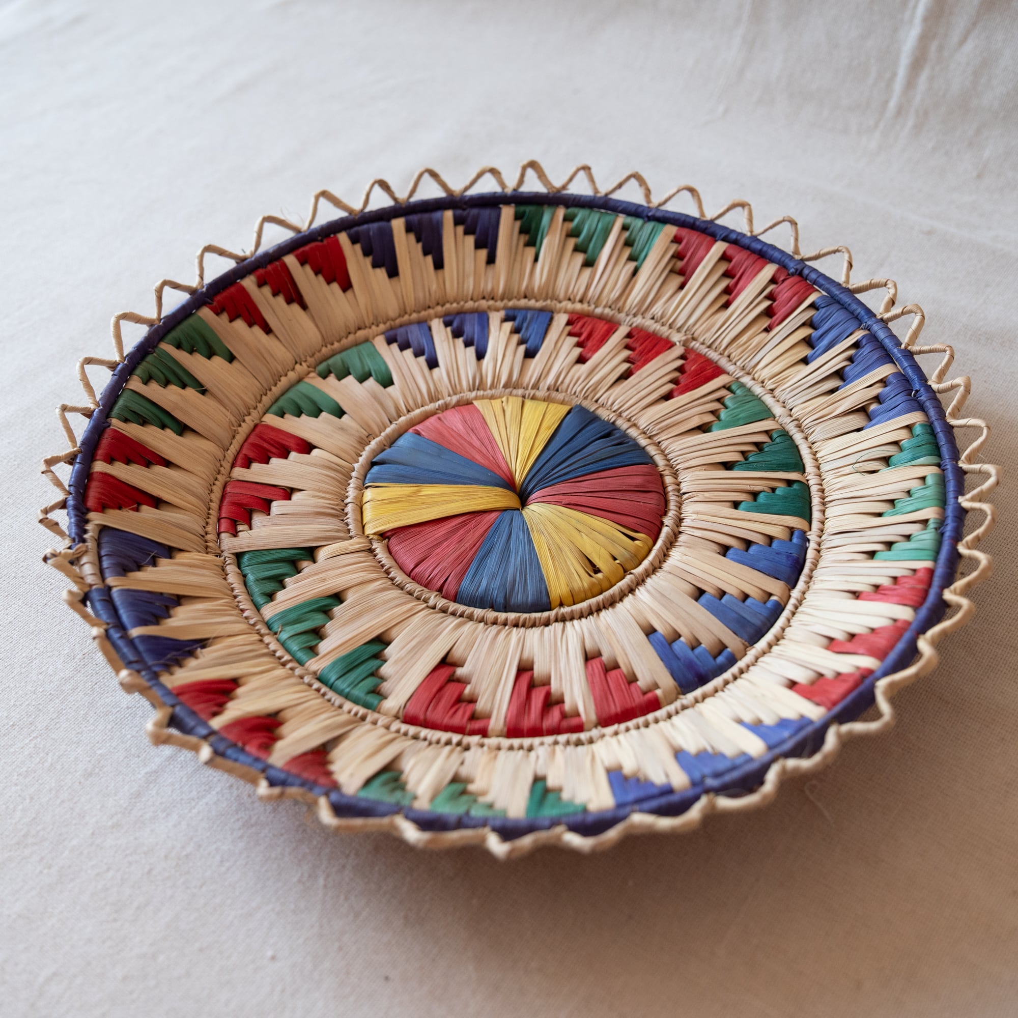 パキスタンの村の女性たちが、ナツメヤシの葉を手編みしてつくったカゴ。見ていると元気になるようなカラフルな色合いです。