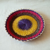 パキスタンの村の女性たちが、ナツメヤシの葉を手編みしてつくったカゴ。見ていると元気になるようなカラフルな色合いです。