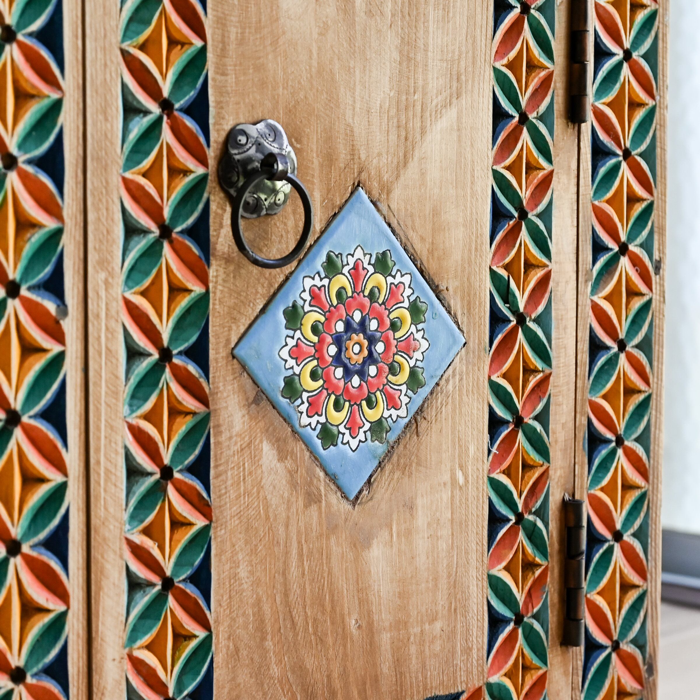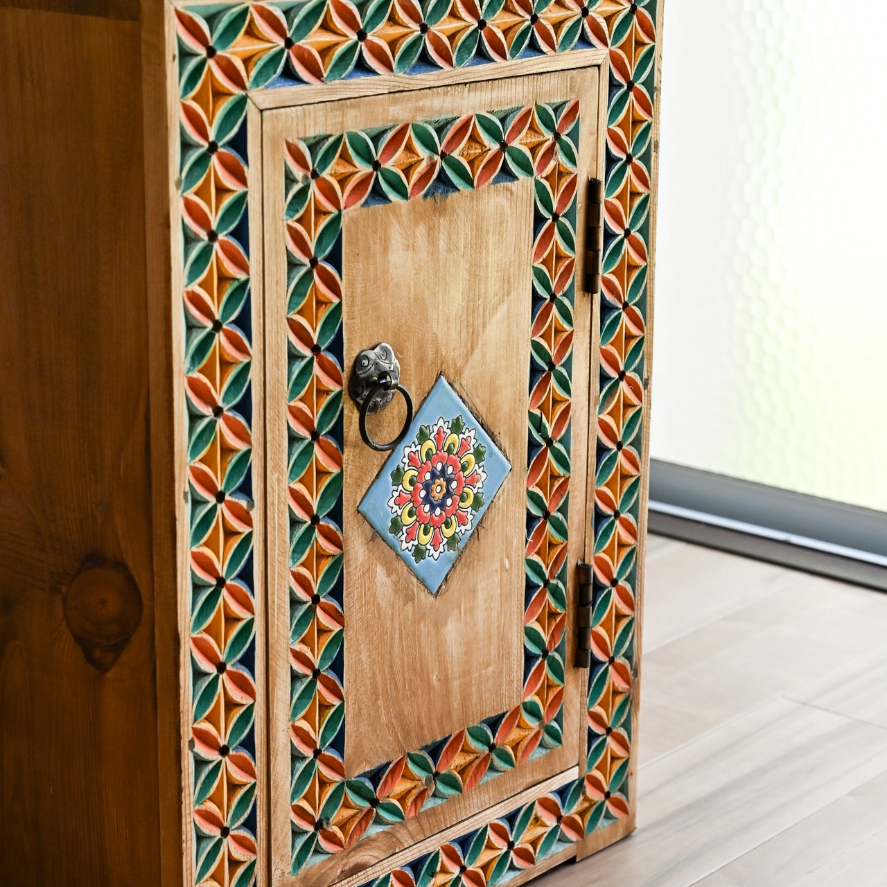 扉にはめたハンドメイドのタイルが象徴的なキャビネット。
