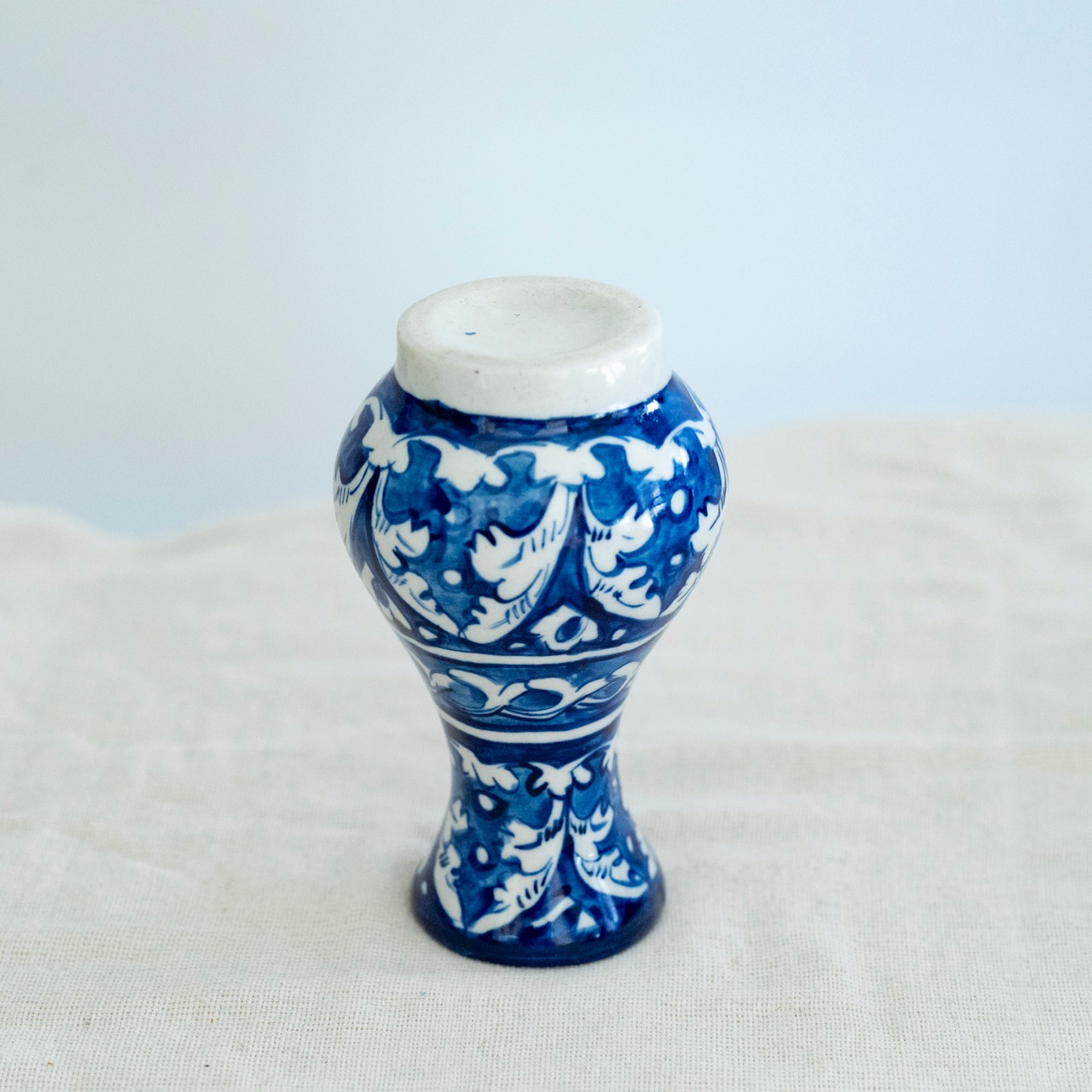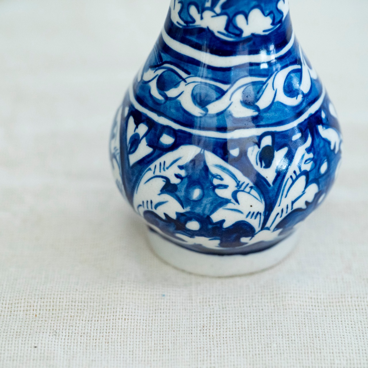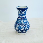 深い青で、ひとつひとつ、手仕事で模様が描かれた花瓶です。