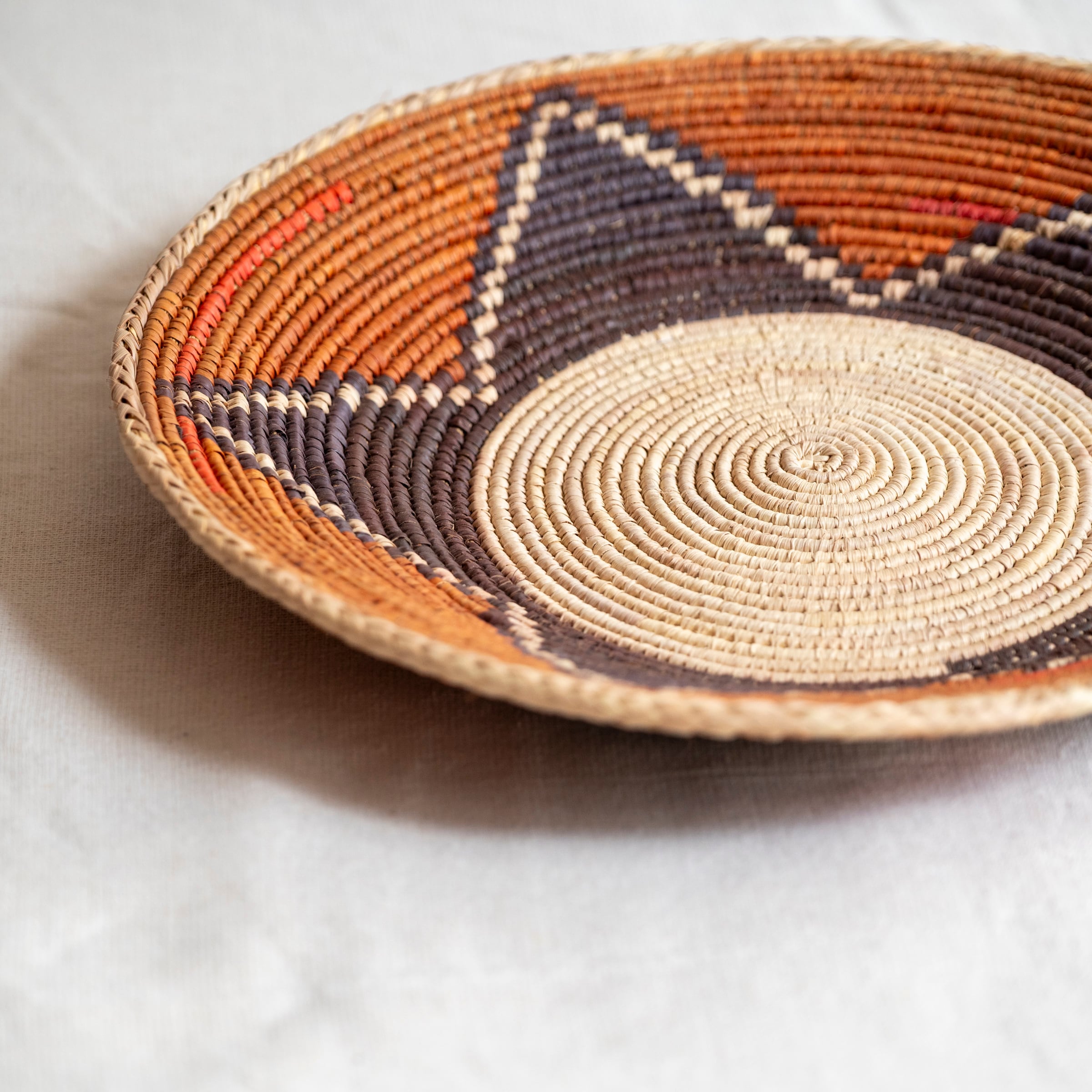 パキスタンの村の女性たちが、ナツメヤシの葉を手編みしてつくったカゴ。見ていると元気になるようなカラフルな色合いです。