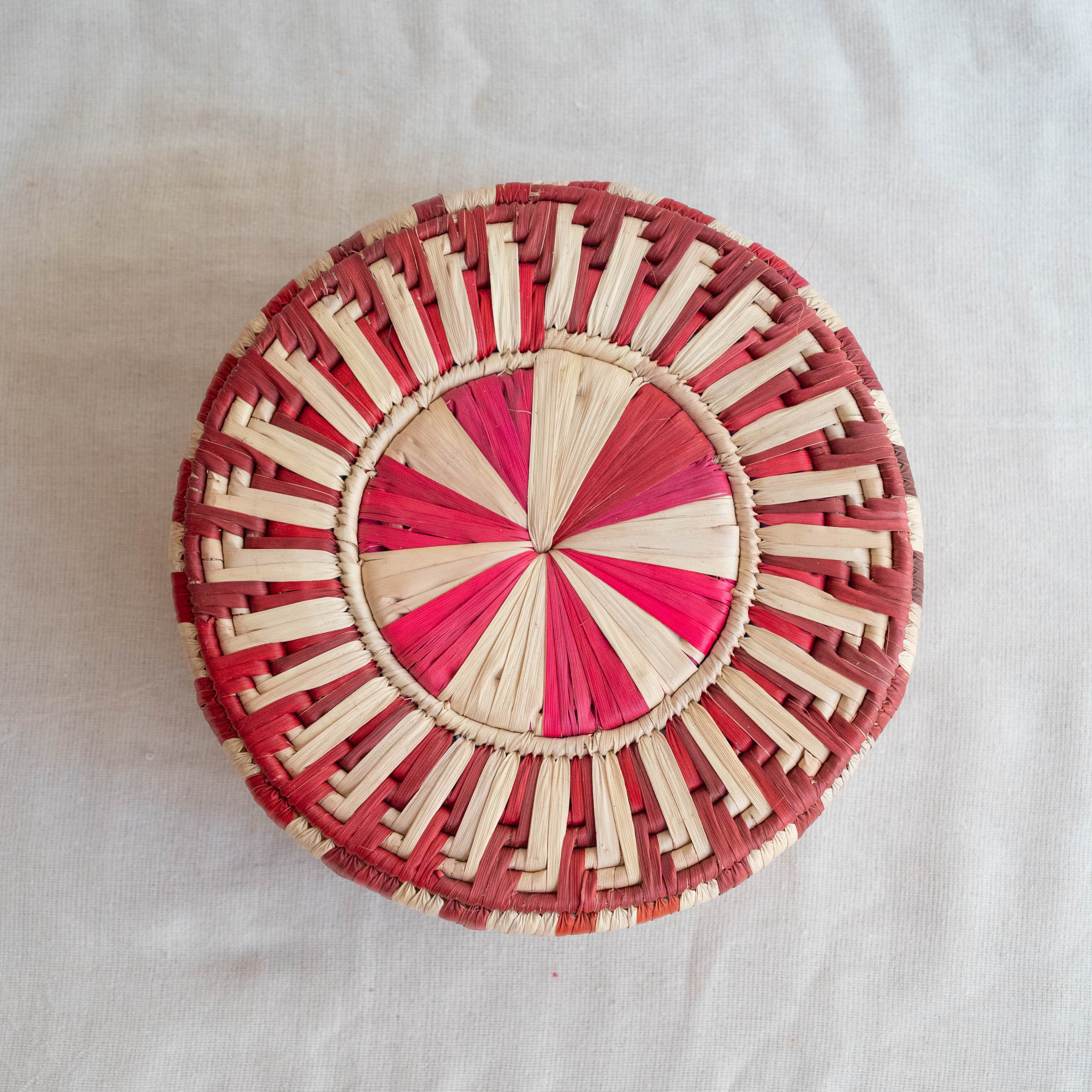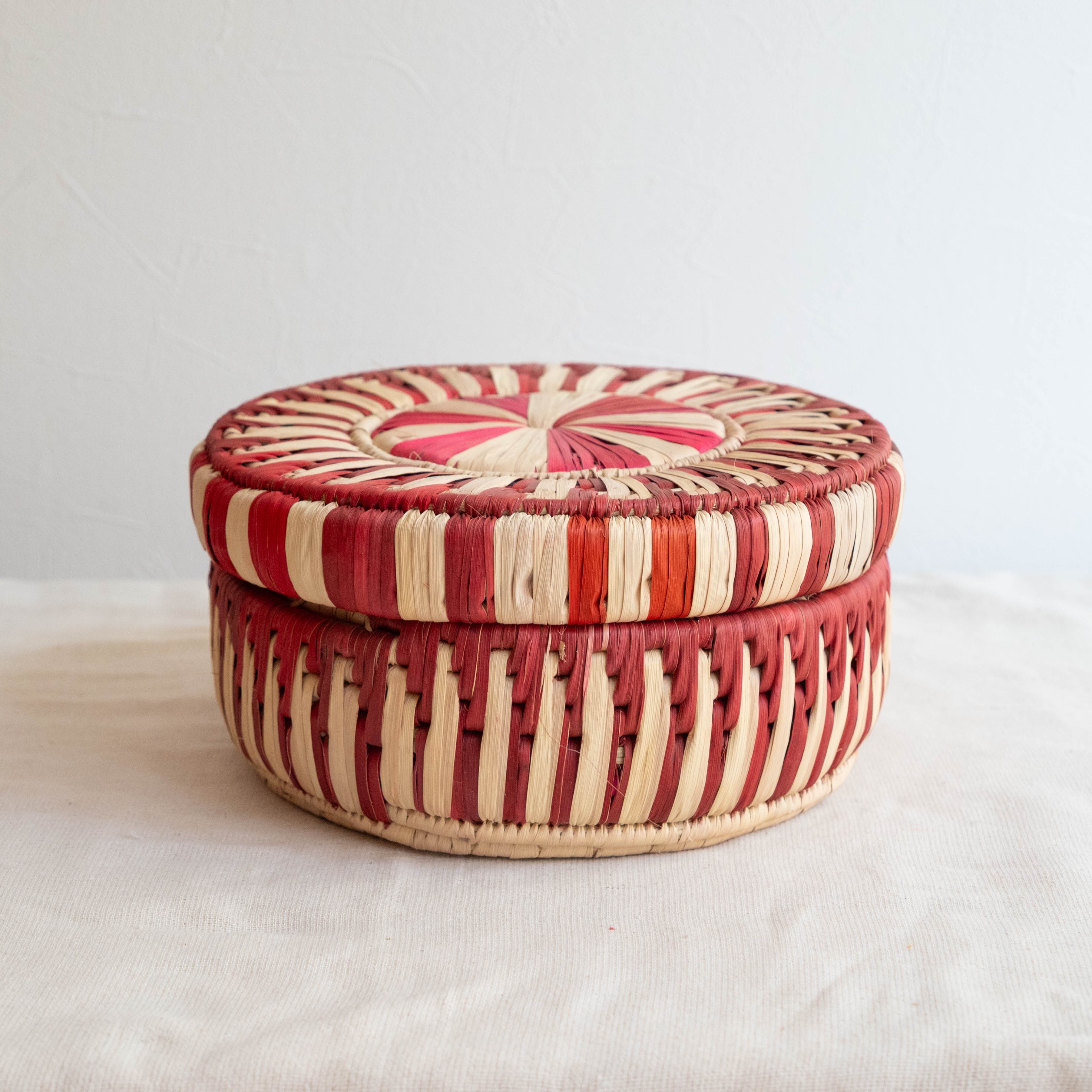 カラフルなパキスタンのかごシリーズの、フタ付きのデザインです。