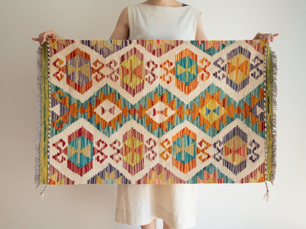 カラフルなキリムは、鮮やかに染めたウールで織る幾何学模様が特徴的ですが、