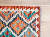 カラフルなキリムは、鮮やかに染めたウールで織る幾何学模様が特徴的ですが、