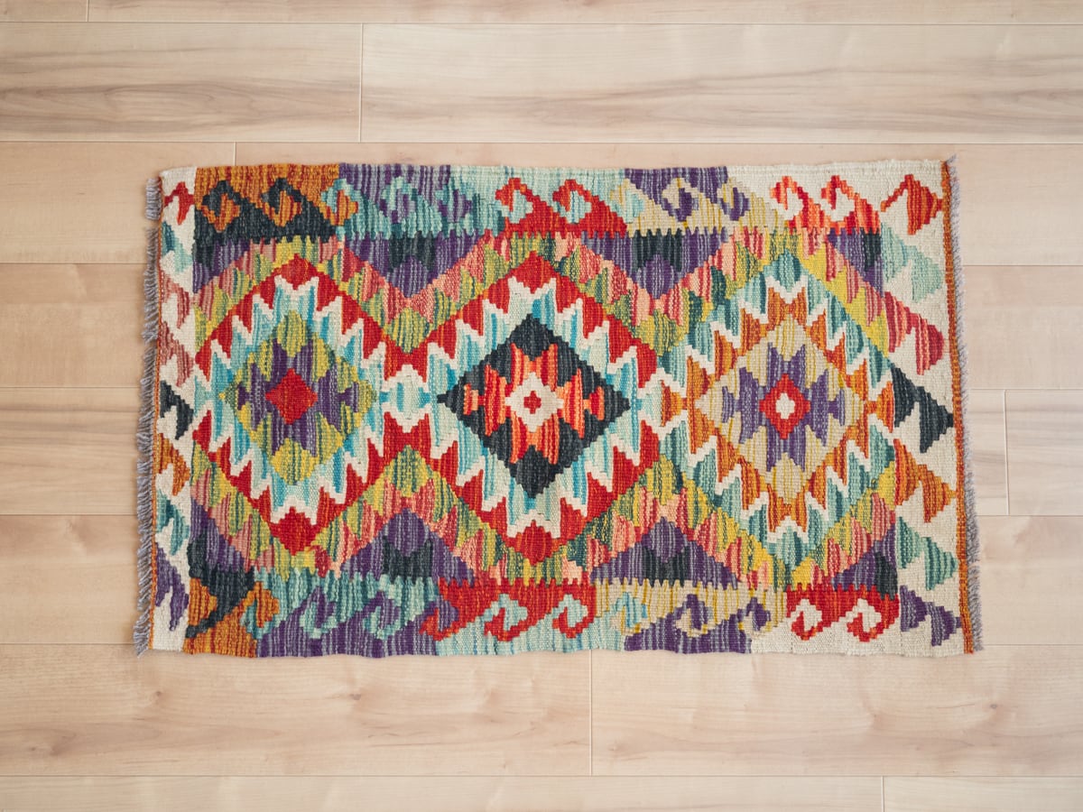 キリムのデザインは、美しい幾何学模様だったり、カラフルな色だったり、