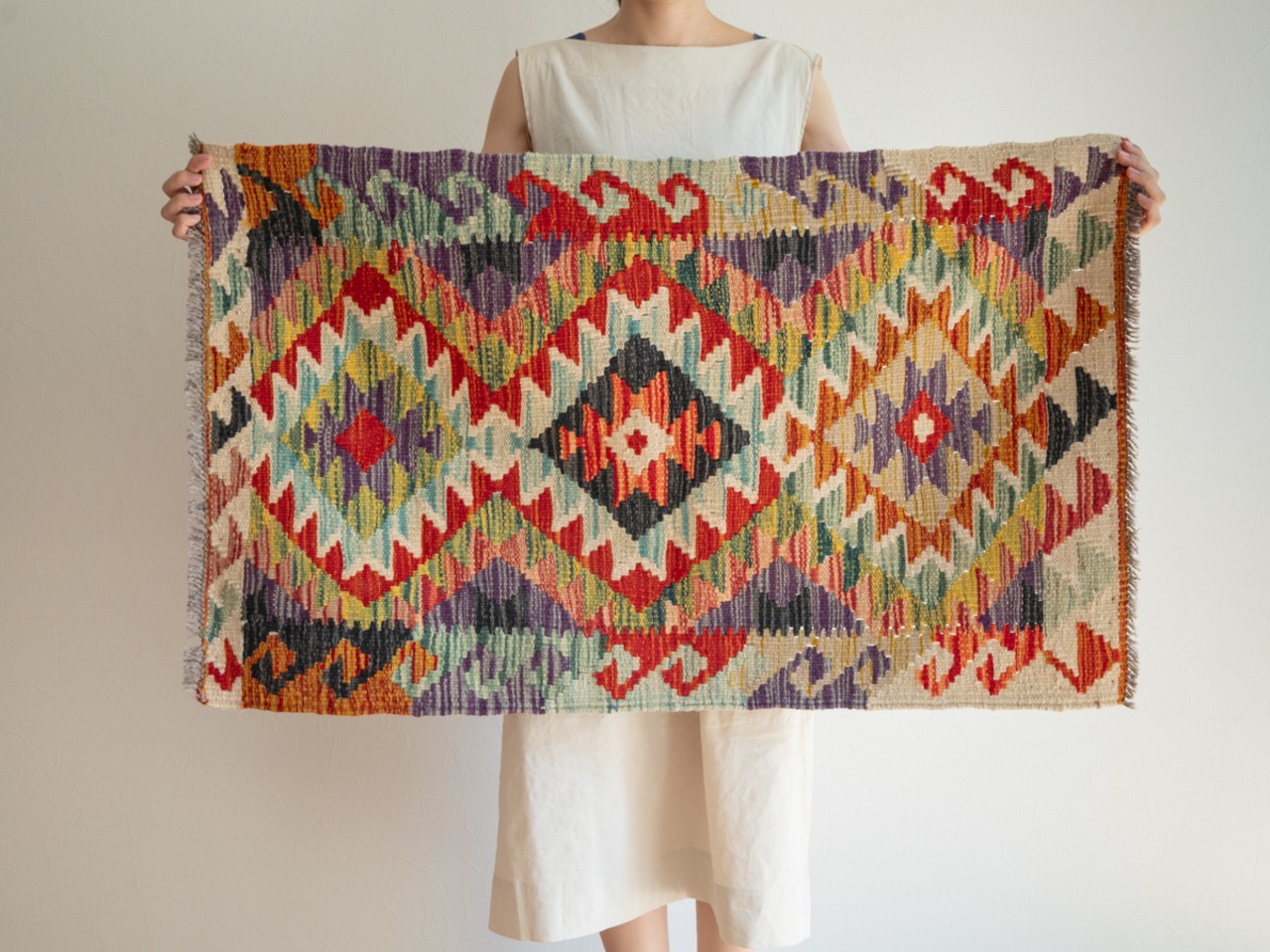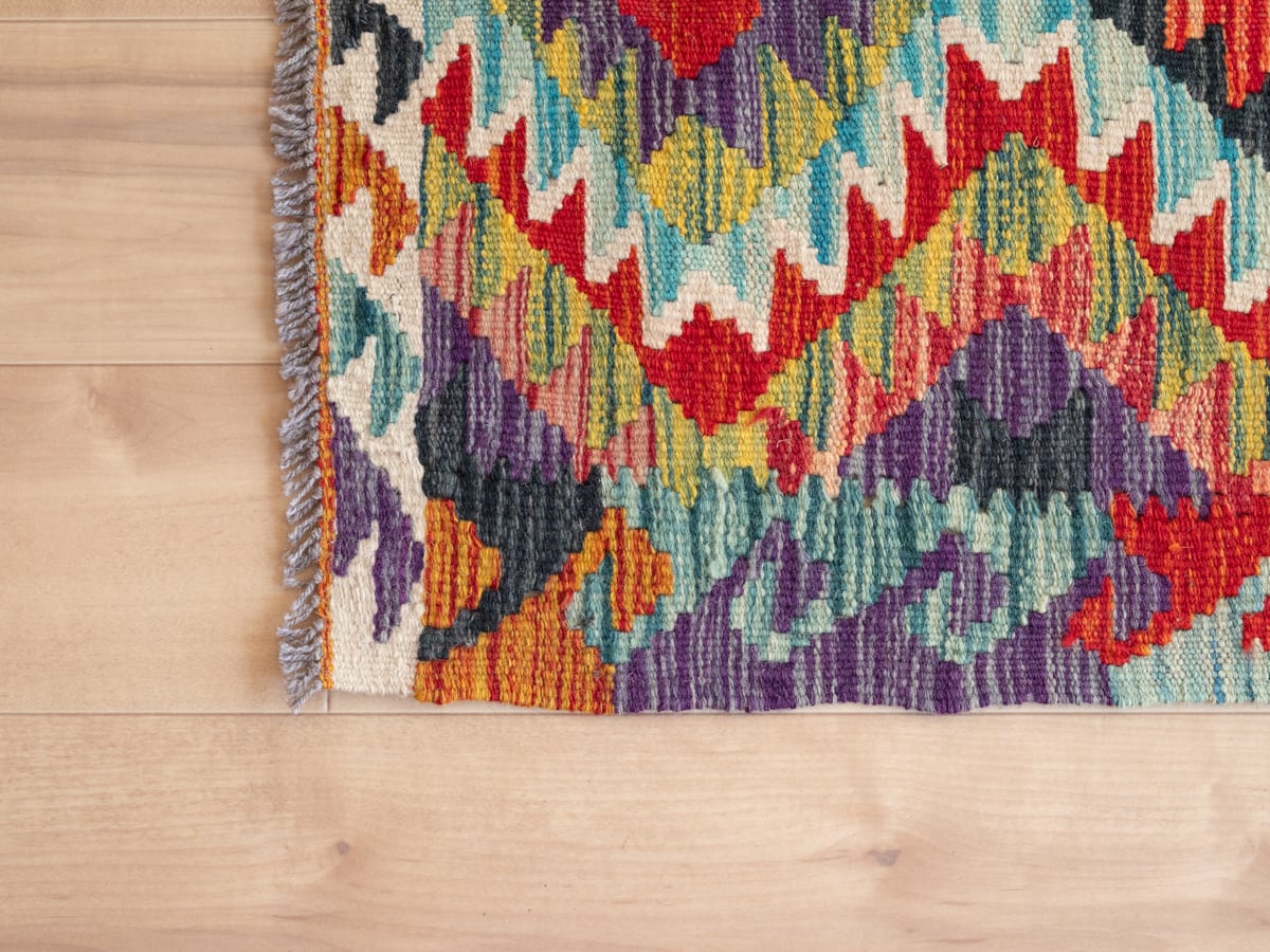 カラフルなキリムは、鮮やかに染めたウールで織る幾何学模様が特徴的ですが、