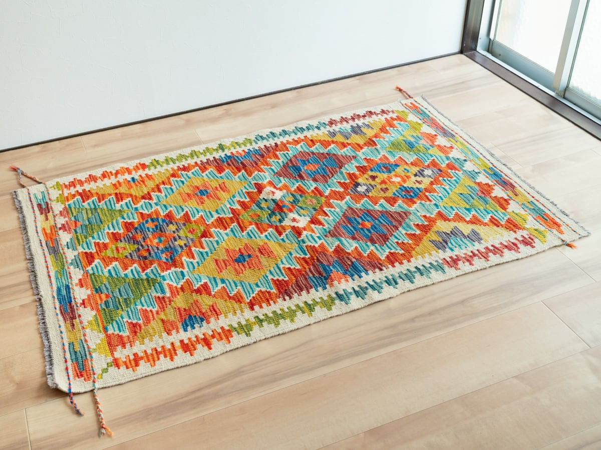 アフガニスタンのキリムL No.4 [約132×81cm] ソファーの足元や、ローテーブル下のサイズ