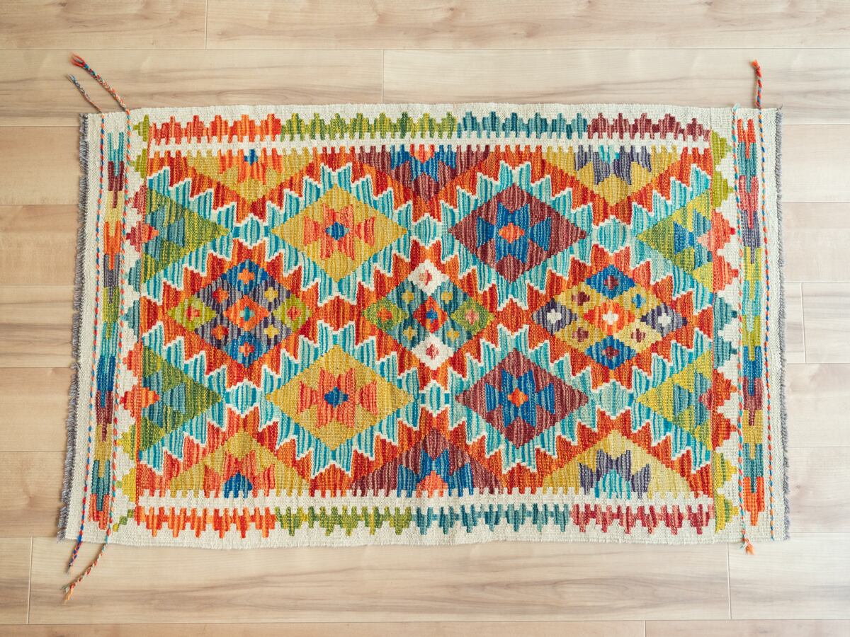 カラフルなキリムは、鮮やかに染めたウールで織る幾何学模様が特徴的ですが、