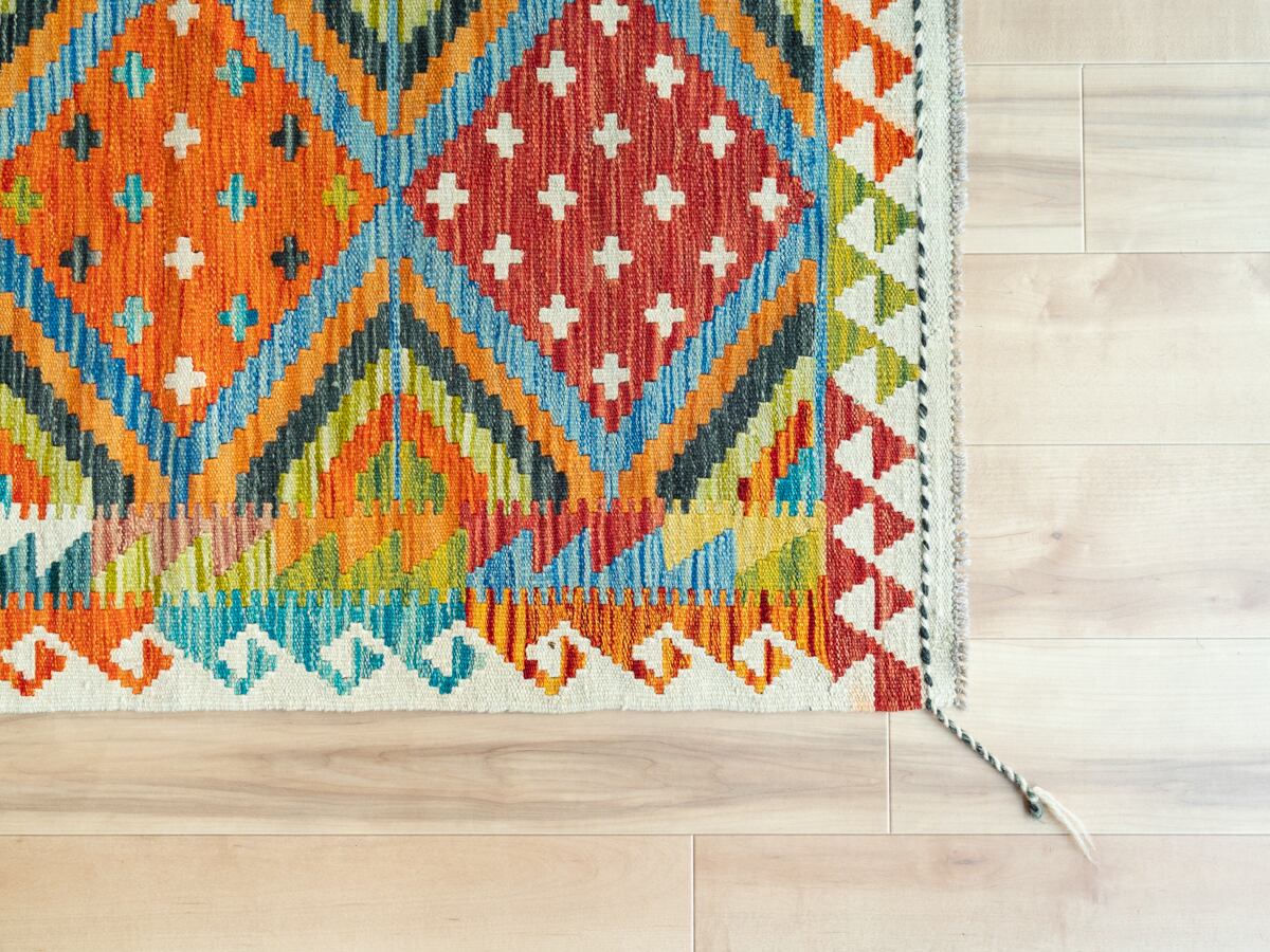 カラフルなキリムは、鮮やかに染めたウールで織る幾何学模様が特徴的ですが、