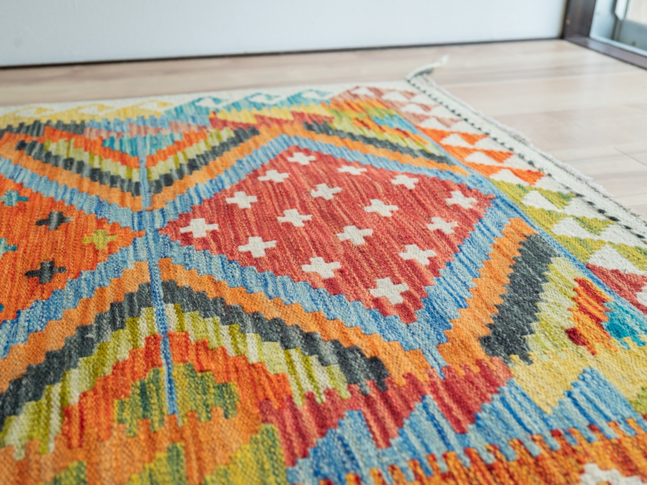 このパキっとしたカラフルさが印象的なキリムの決め手は、
