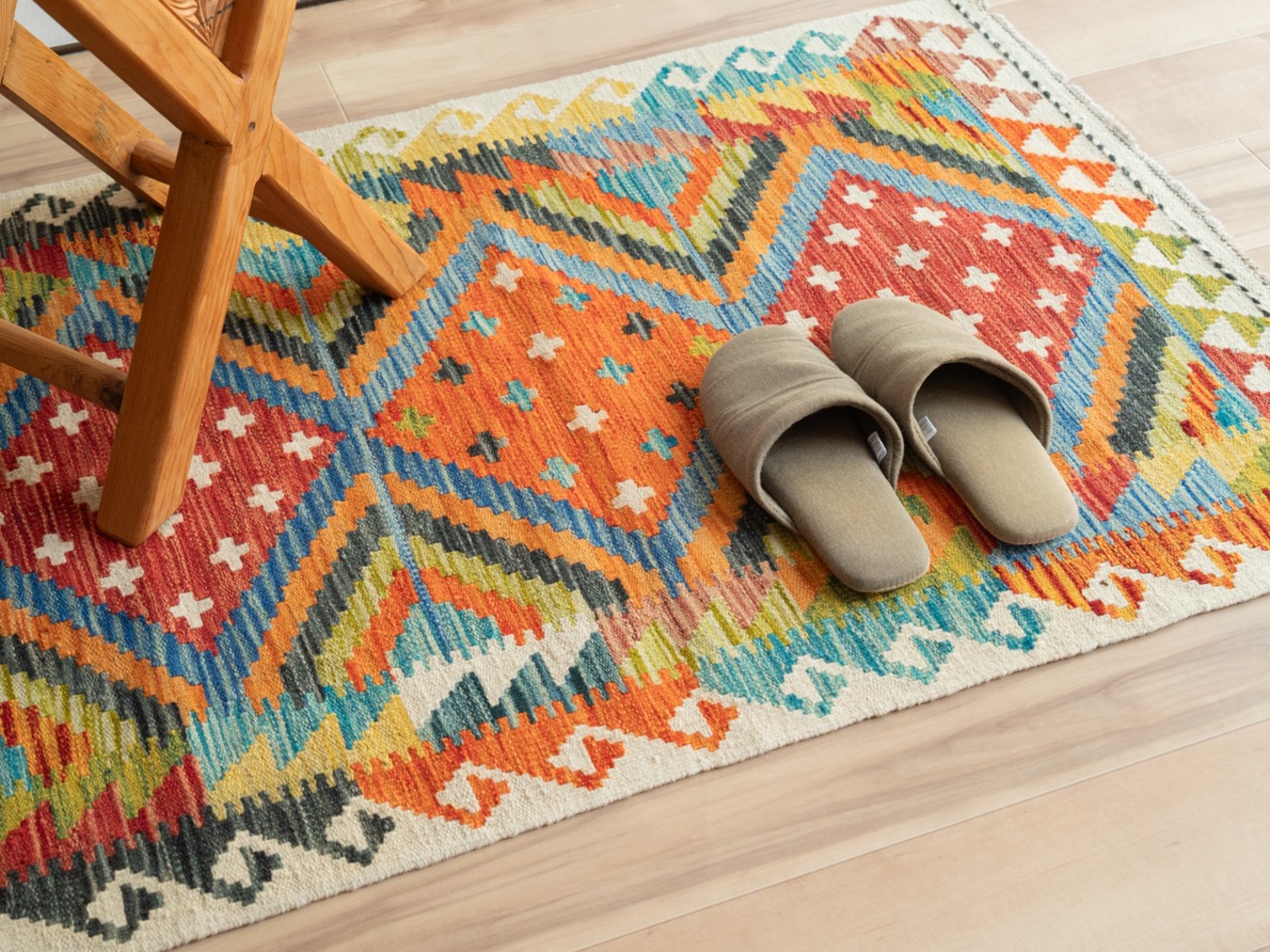 初めて素足でキリムに足をのせると、ちょっとゴワゴワした印象があるかもしれません。
