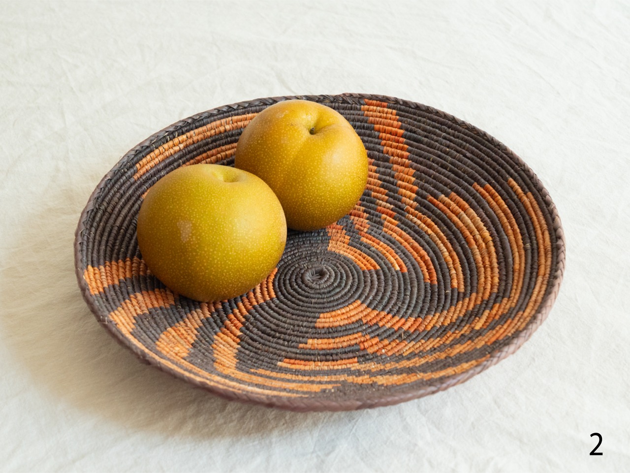 その葉っぱを数日置いて乾燥させ、色を染め、手で編んだのが、このかごです。