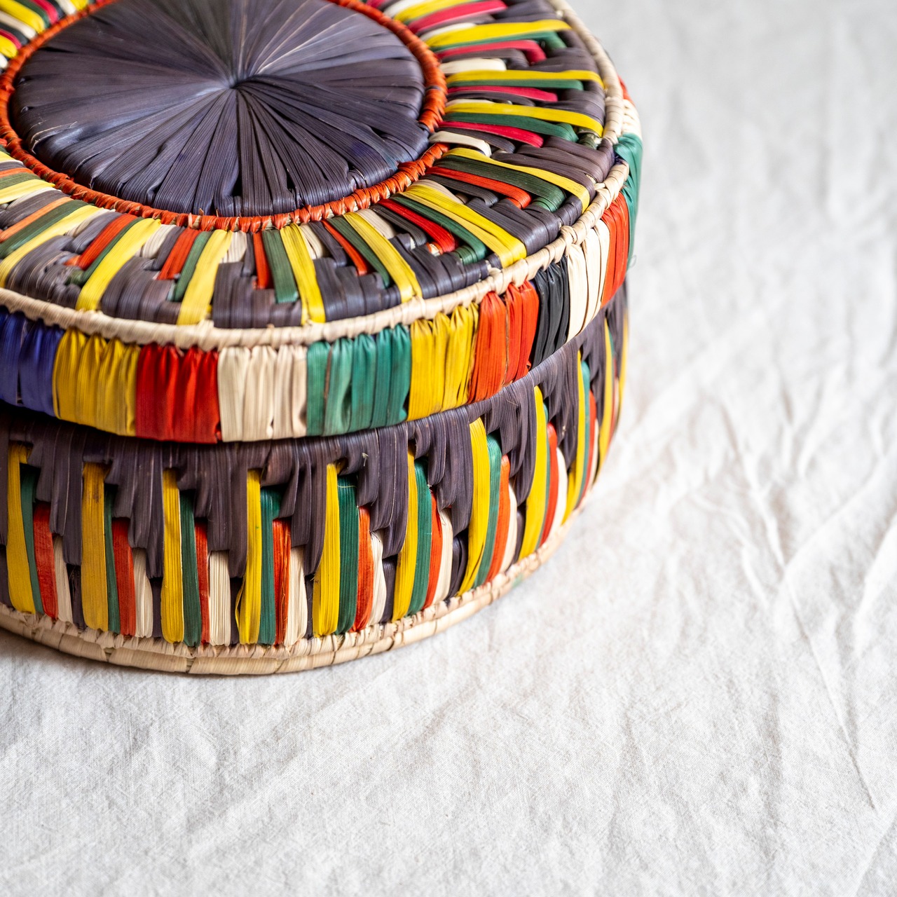 カラフルなパキスタンのかごシリーズの、フタ付きのデザインです。