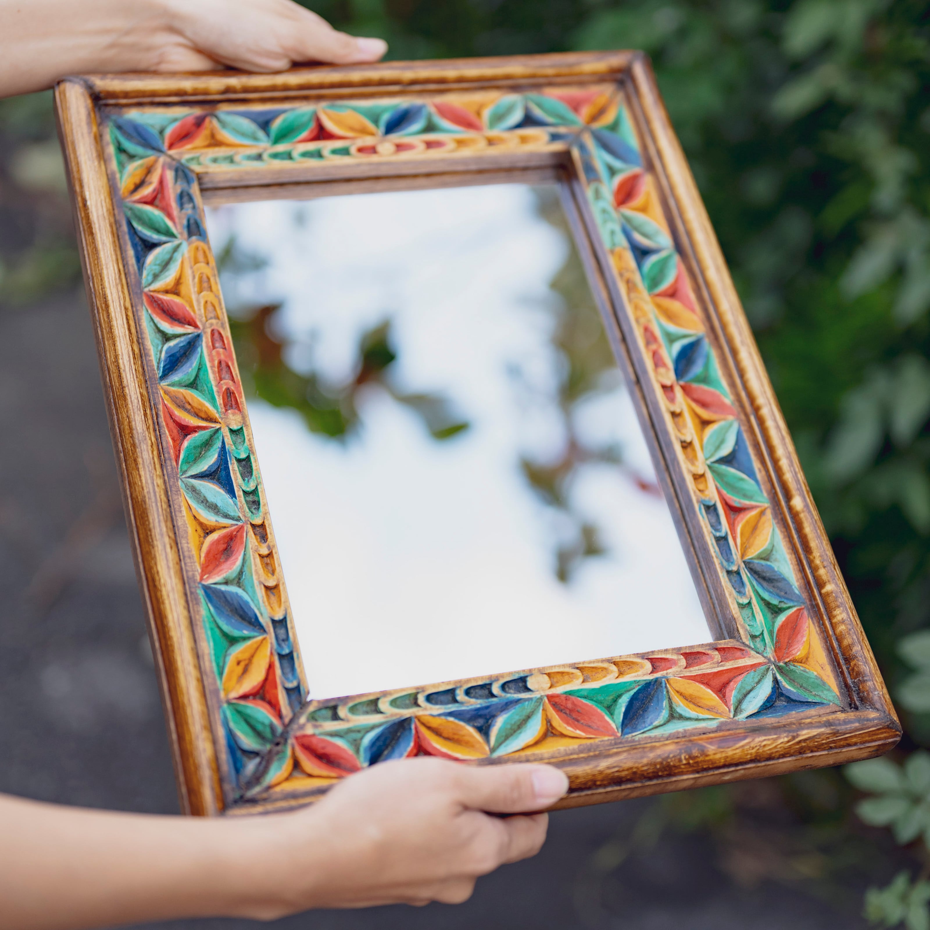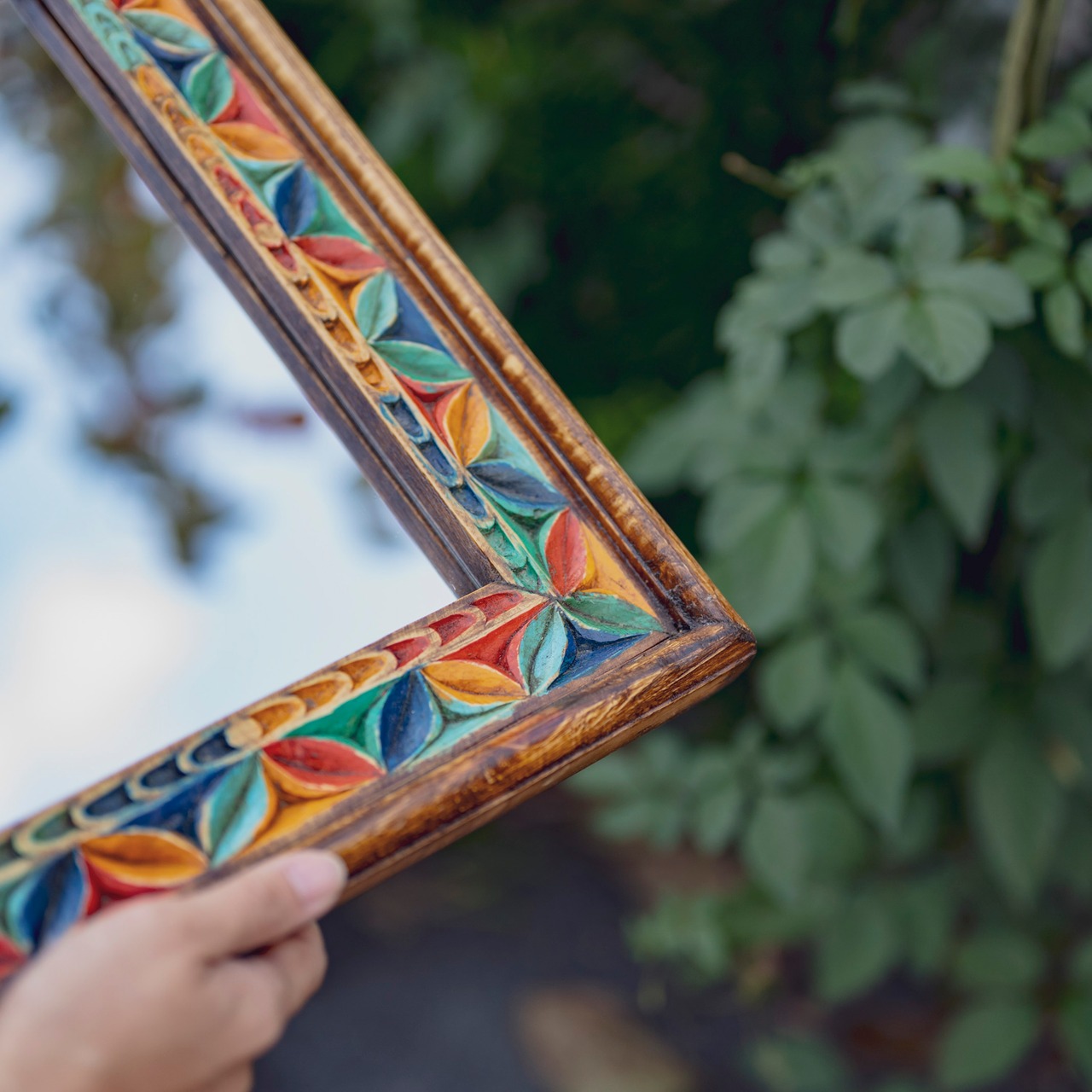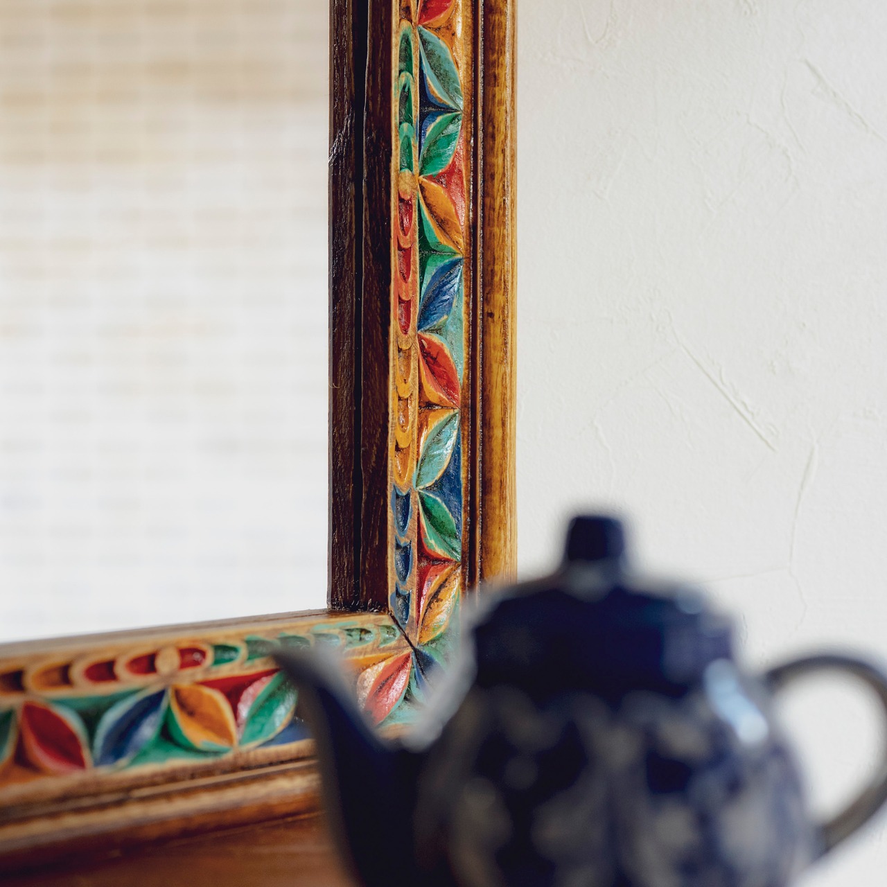 無垢材の木製フレームに手彫りの彫刻をあしらったミラー。