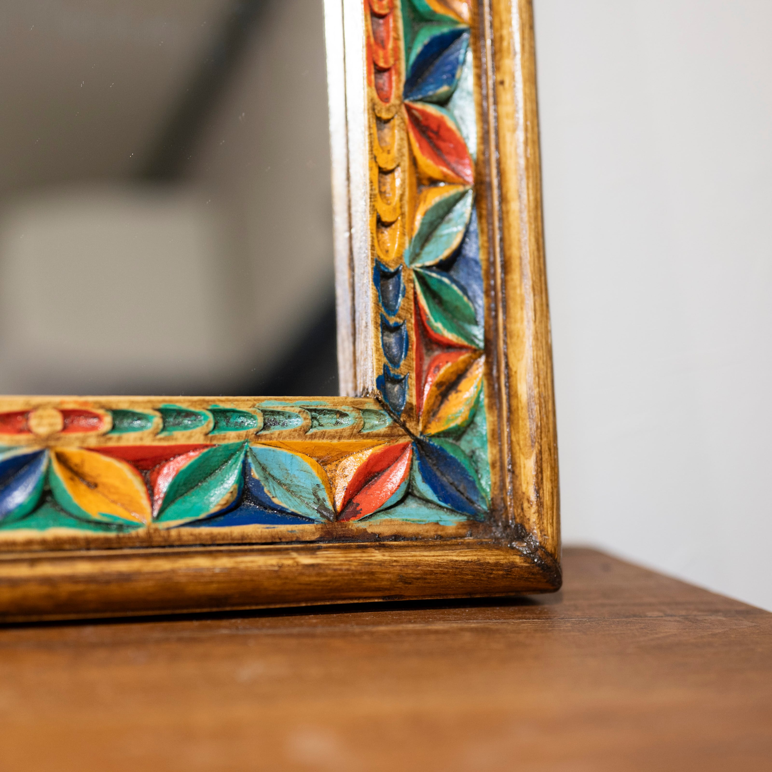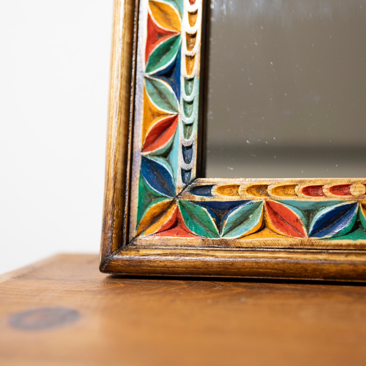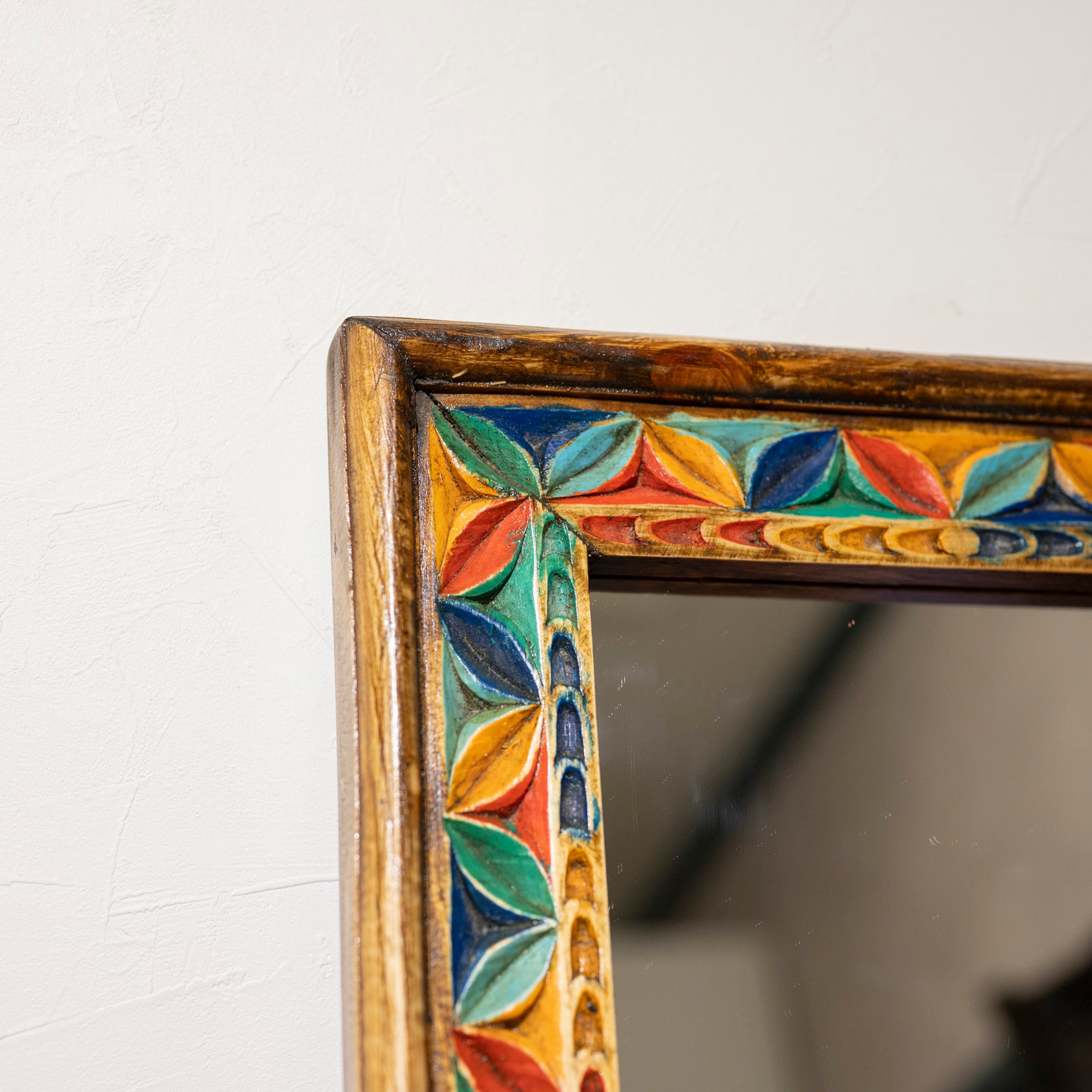 無垢材の木製フレームに手彫りの彫刻をあしらったミラー。