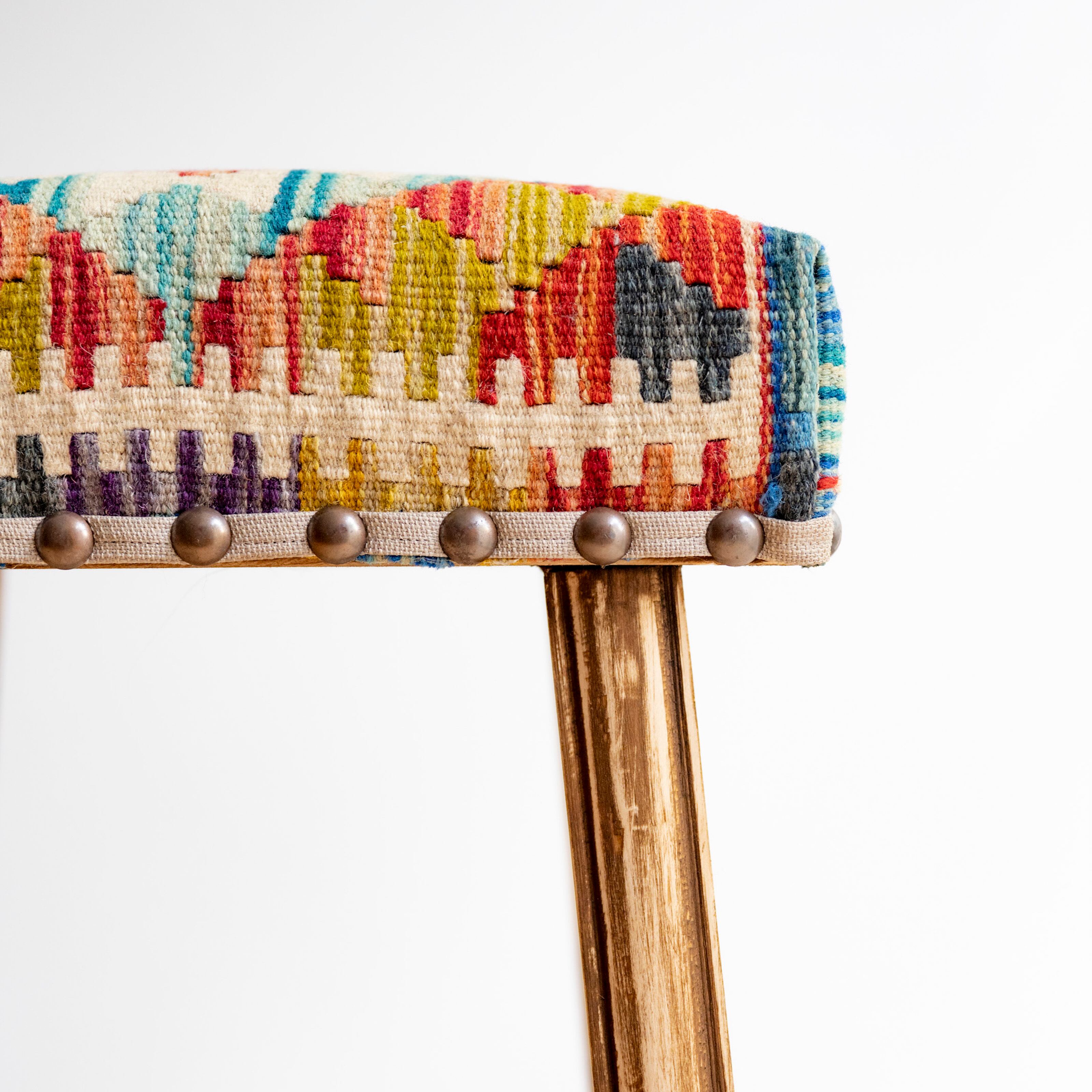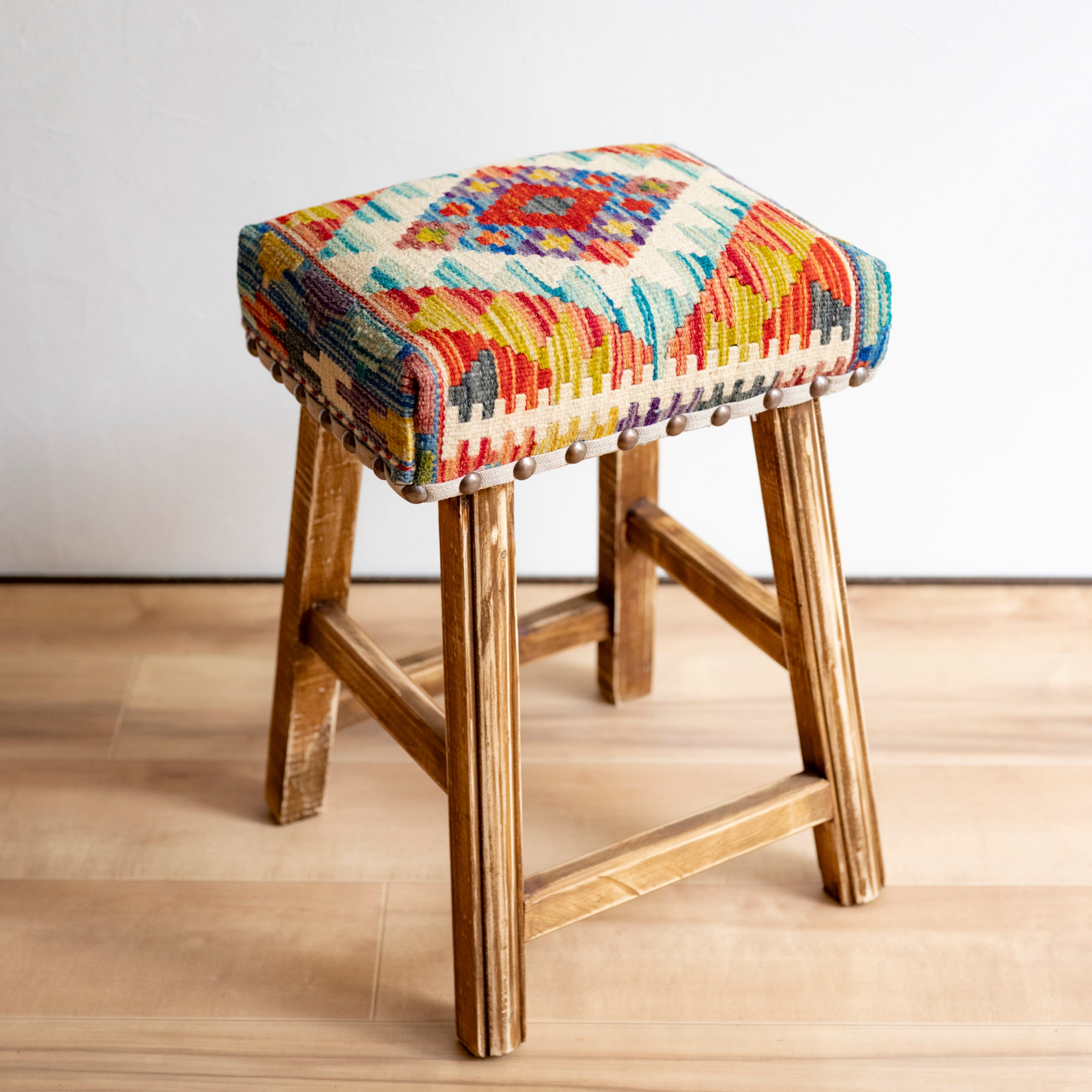 ウール製の手織りキリム(ラグ)を座面にあしらった、パキスタン製の椅子です。