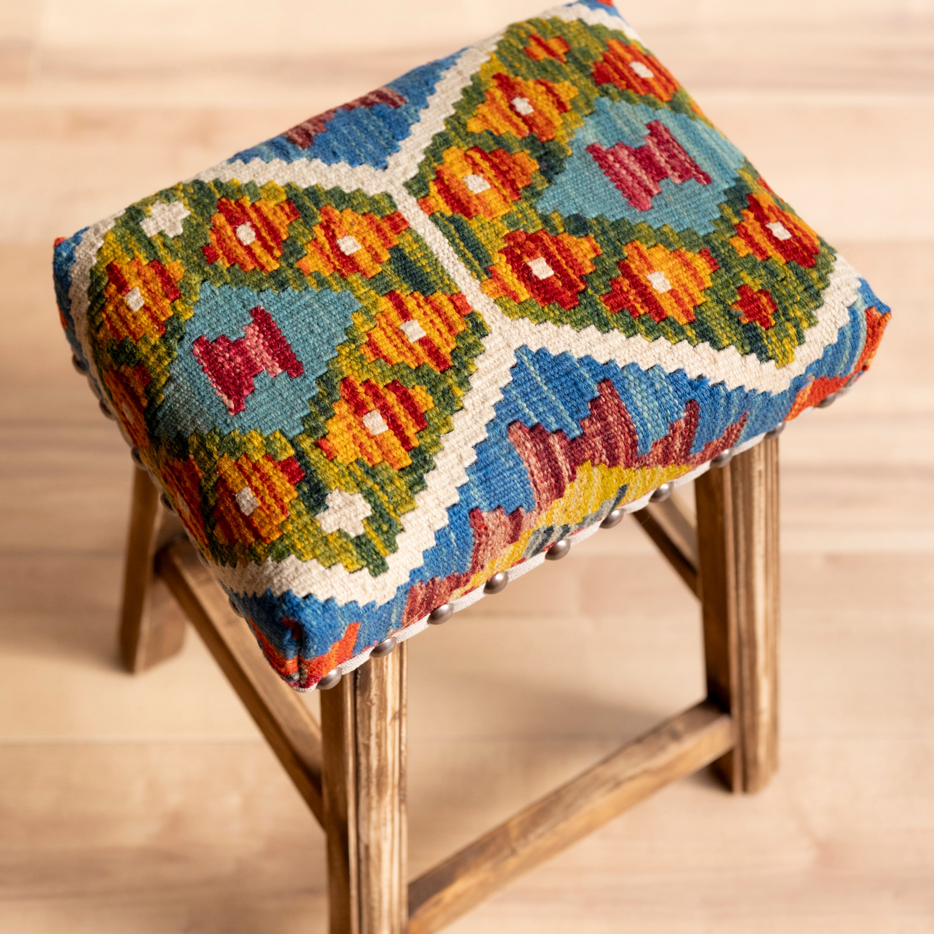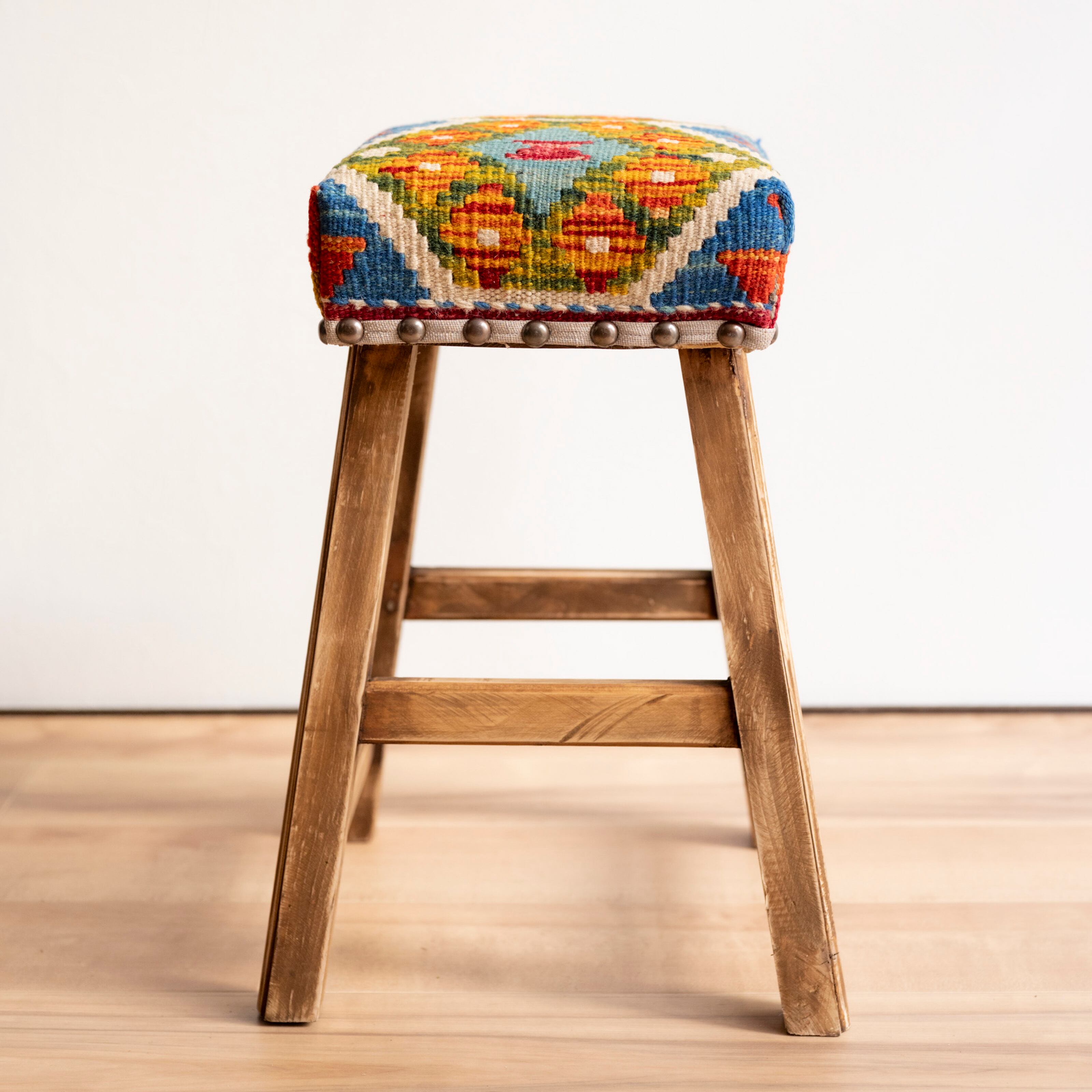 ウール製の手織りキリム(ラグ)を座面にあしらった、パキスタン製の椅子です。