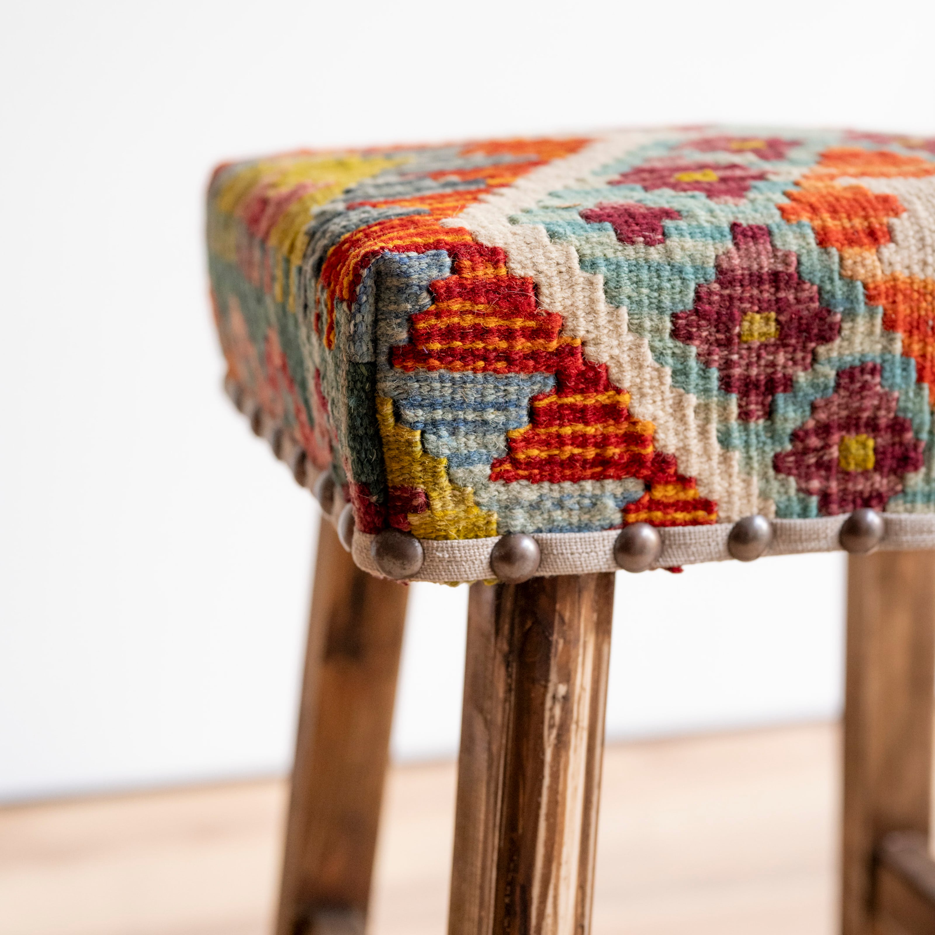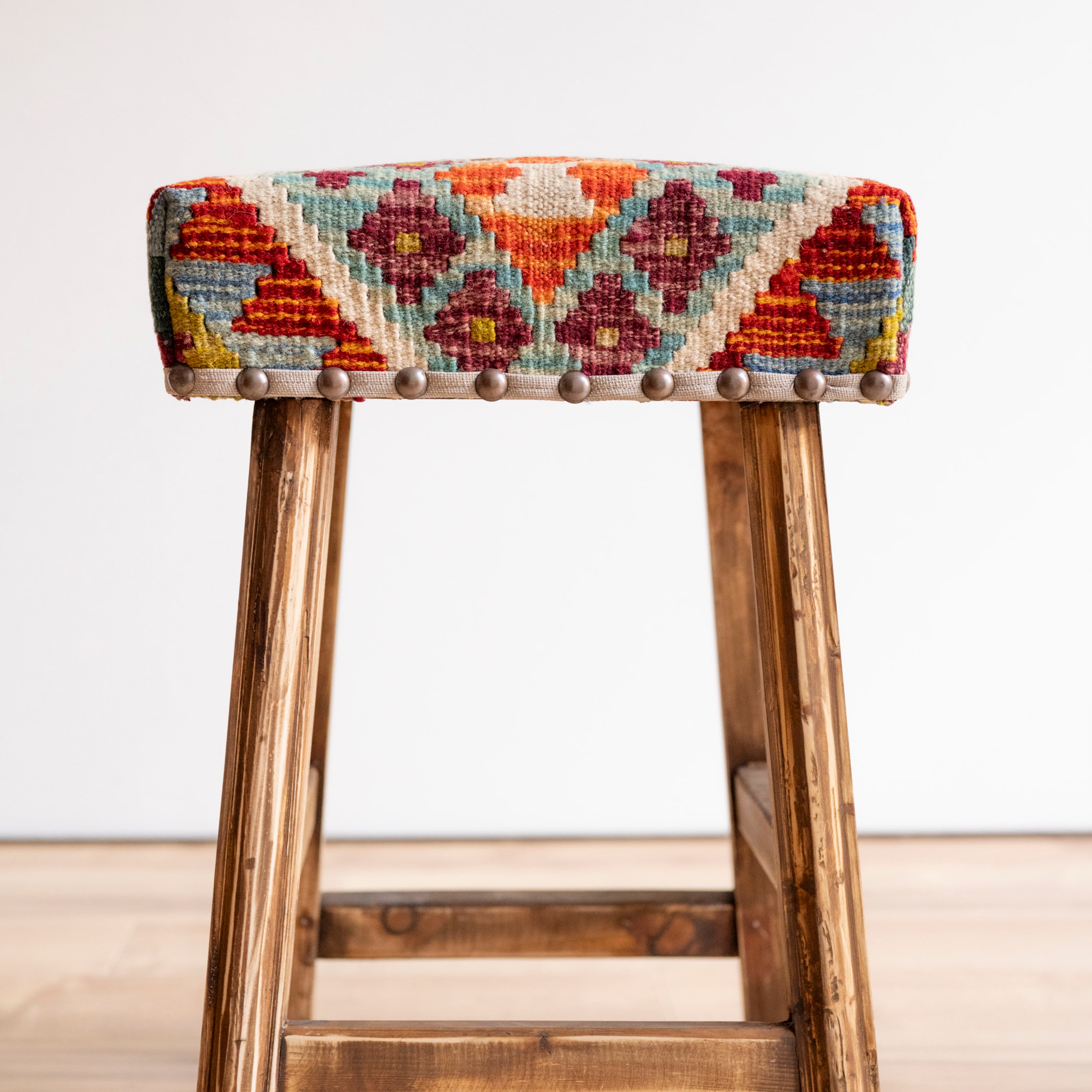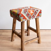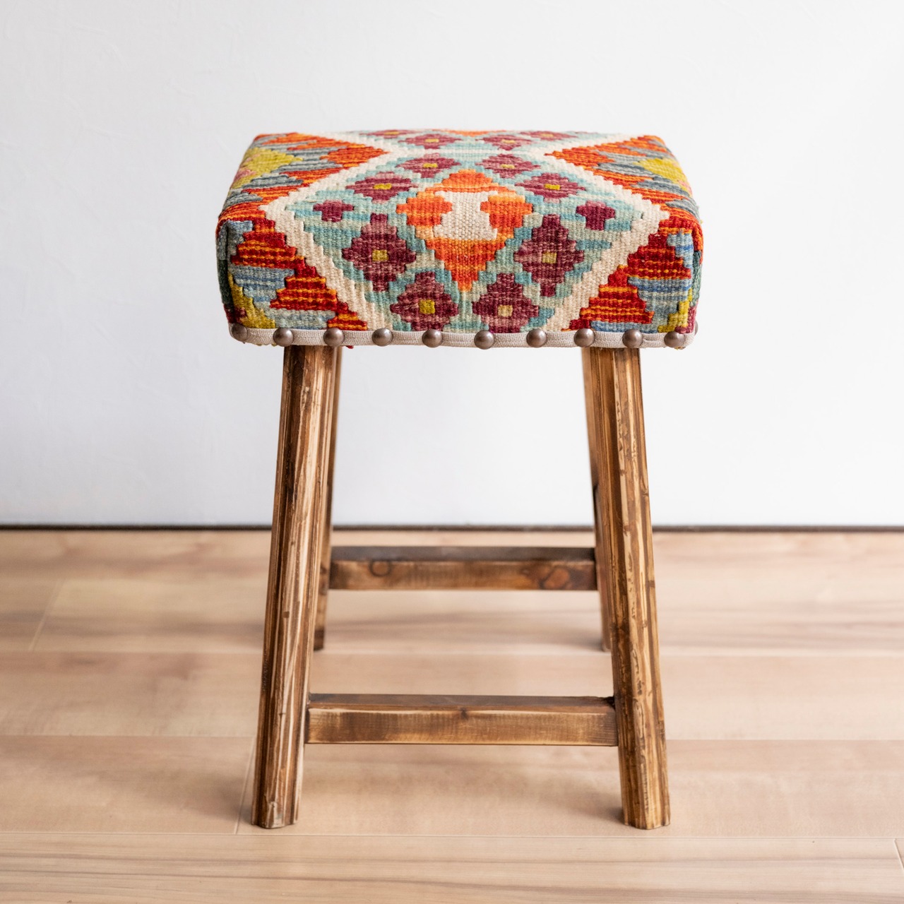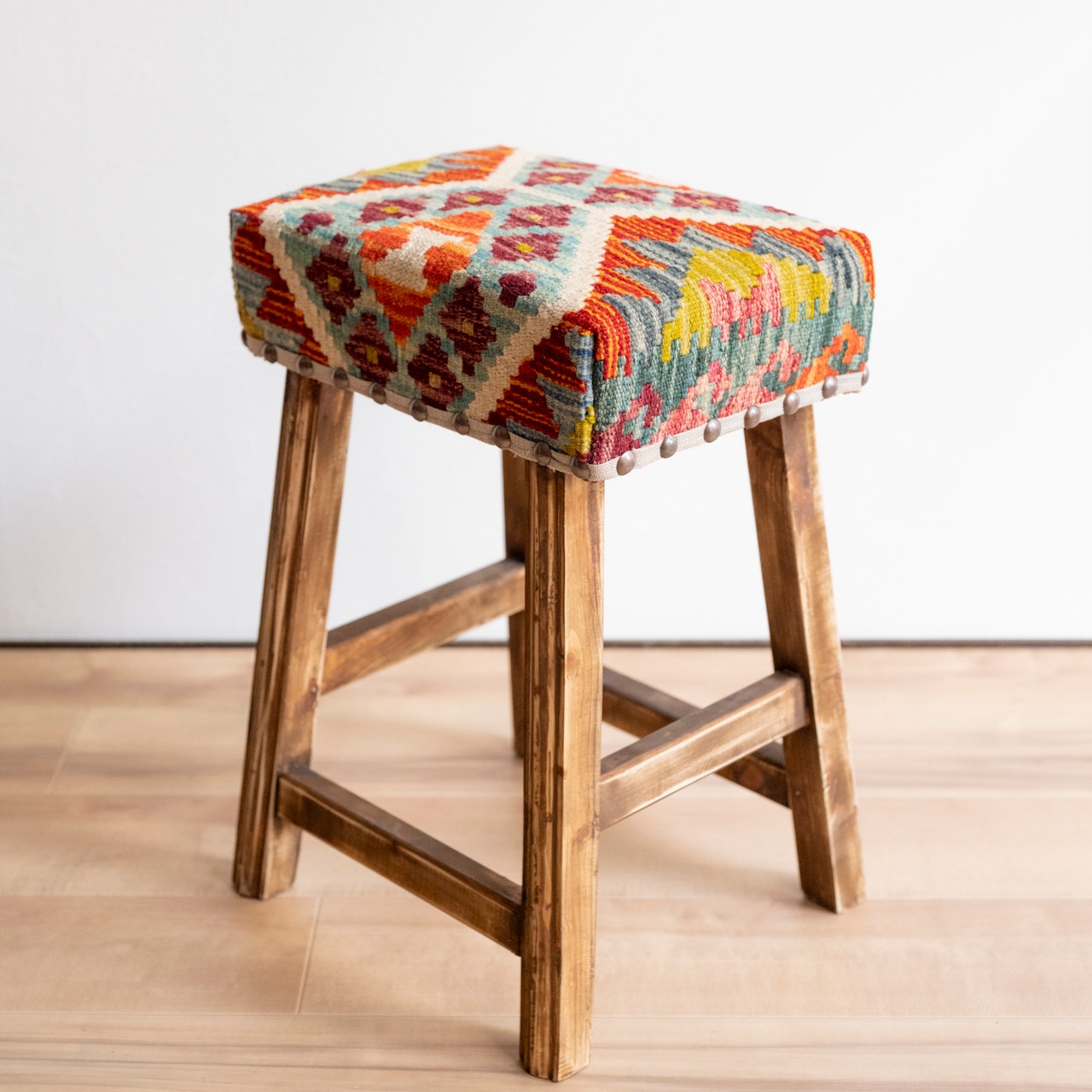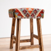 ウール製の手織りキリム(ラグ)を座面にあしらった、パキスタン製の椅子です。