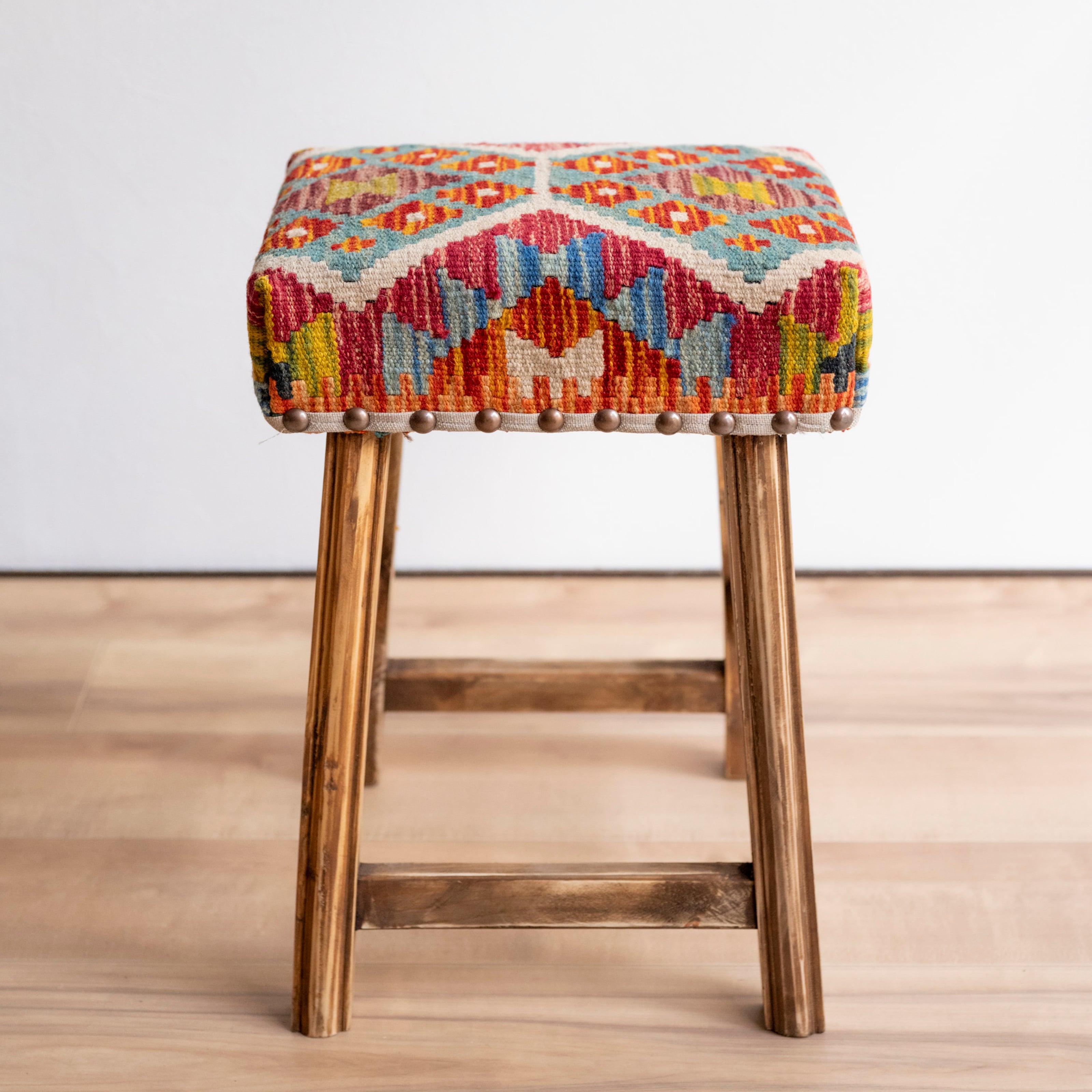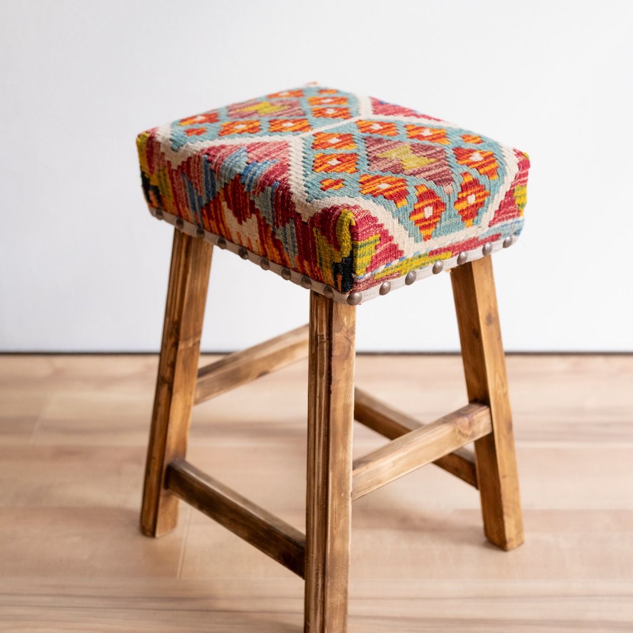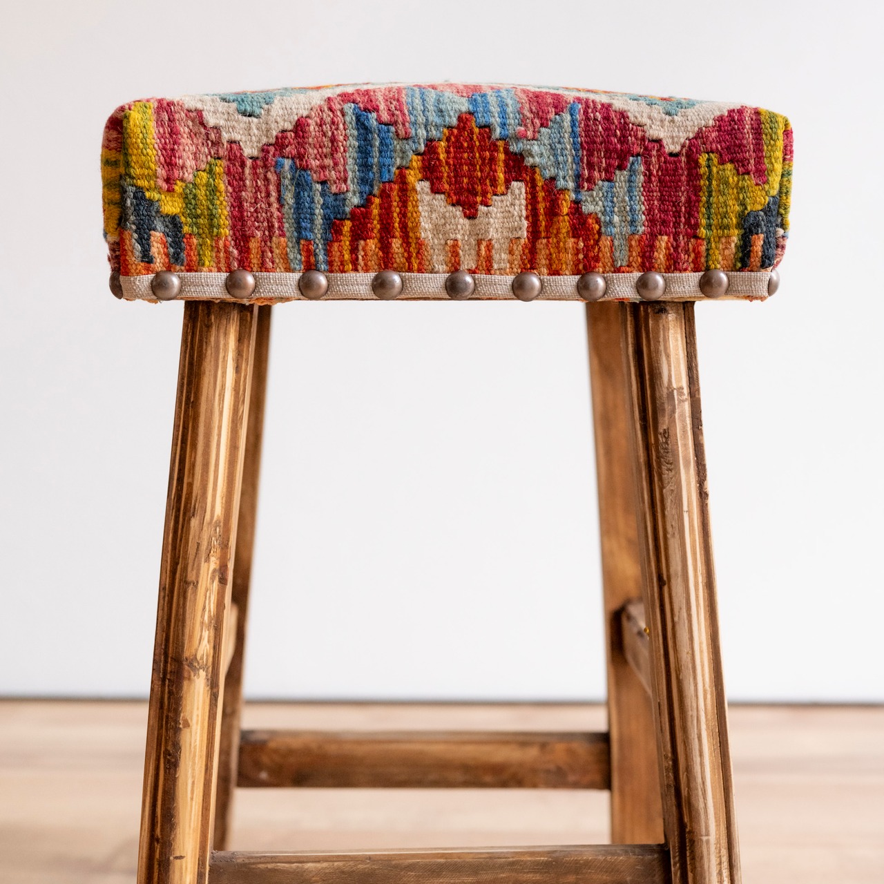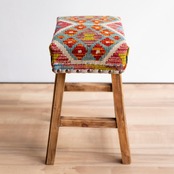 ウール製の手織りキリム(ラグ)を座面にあしらった、パキスタン製の椅子です。