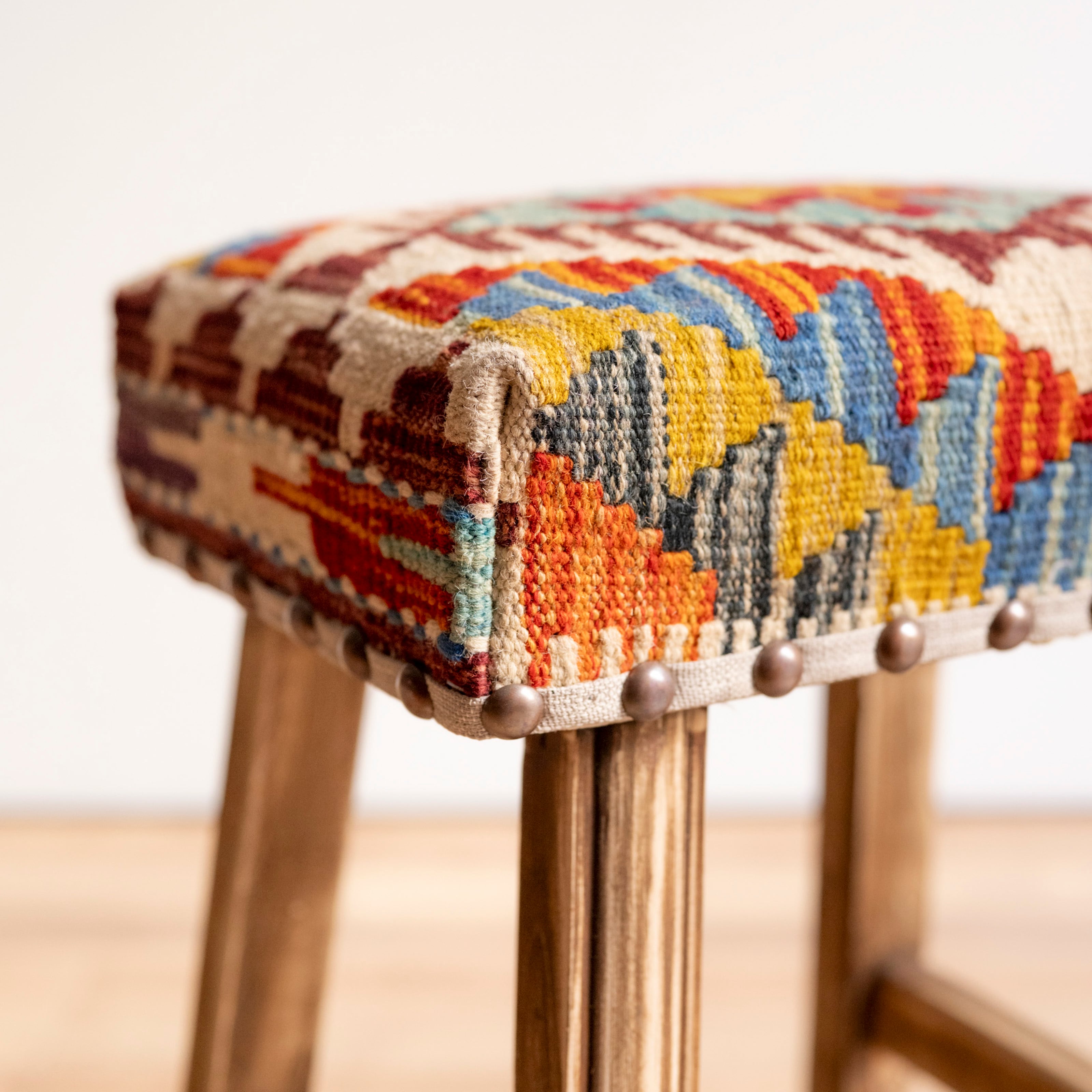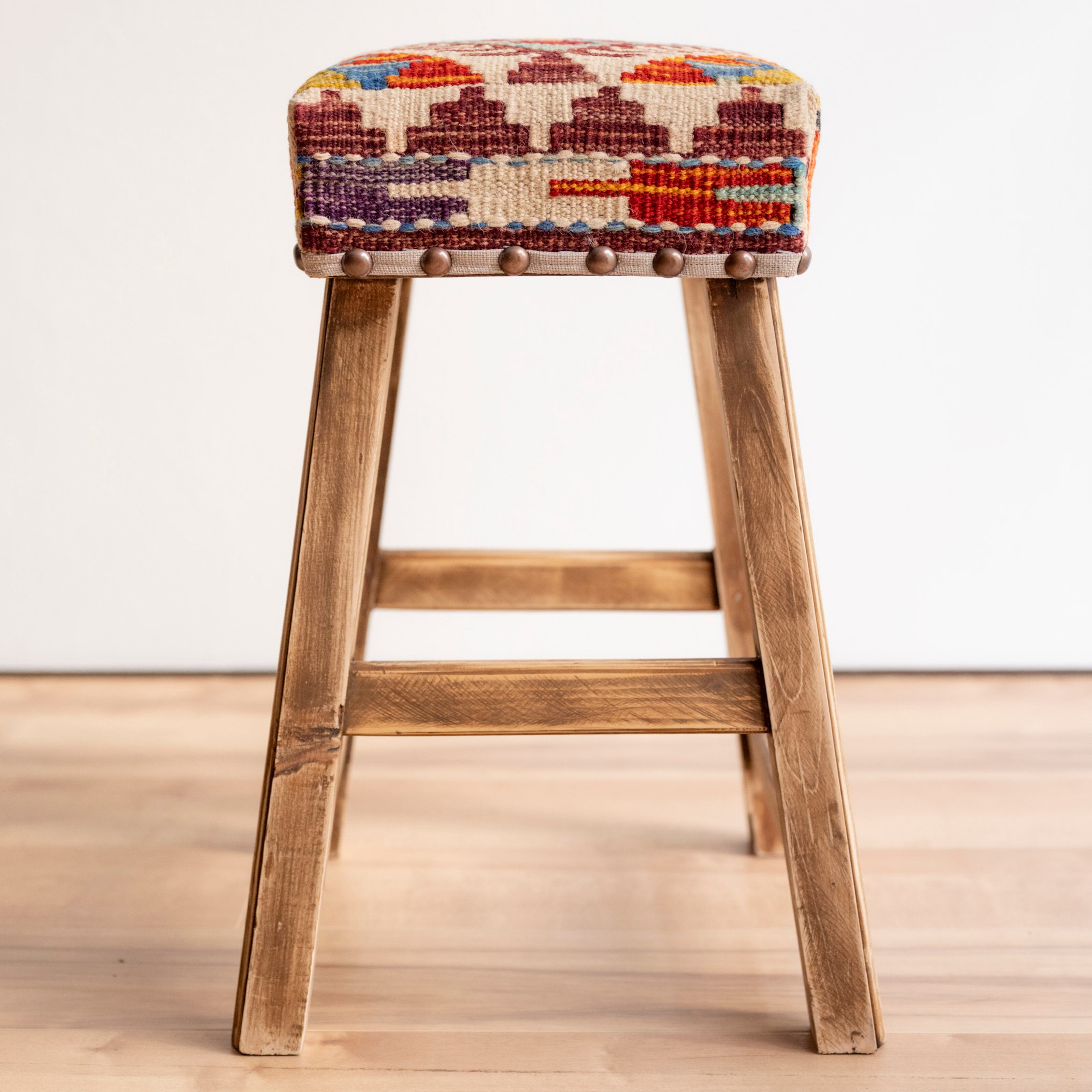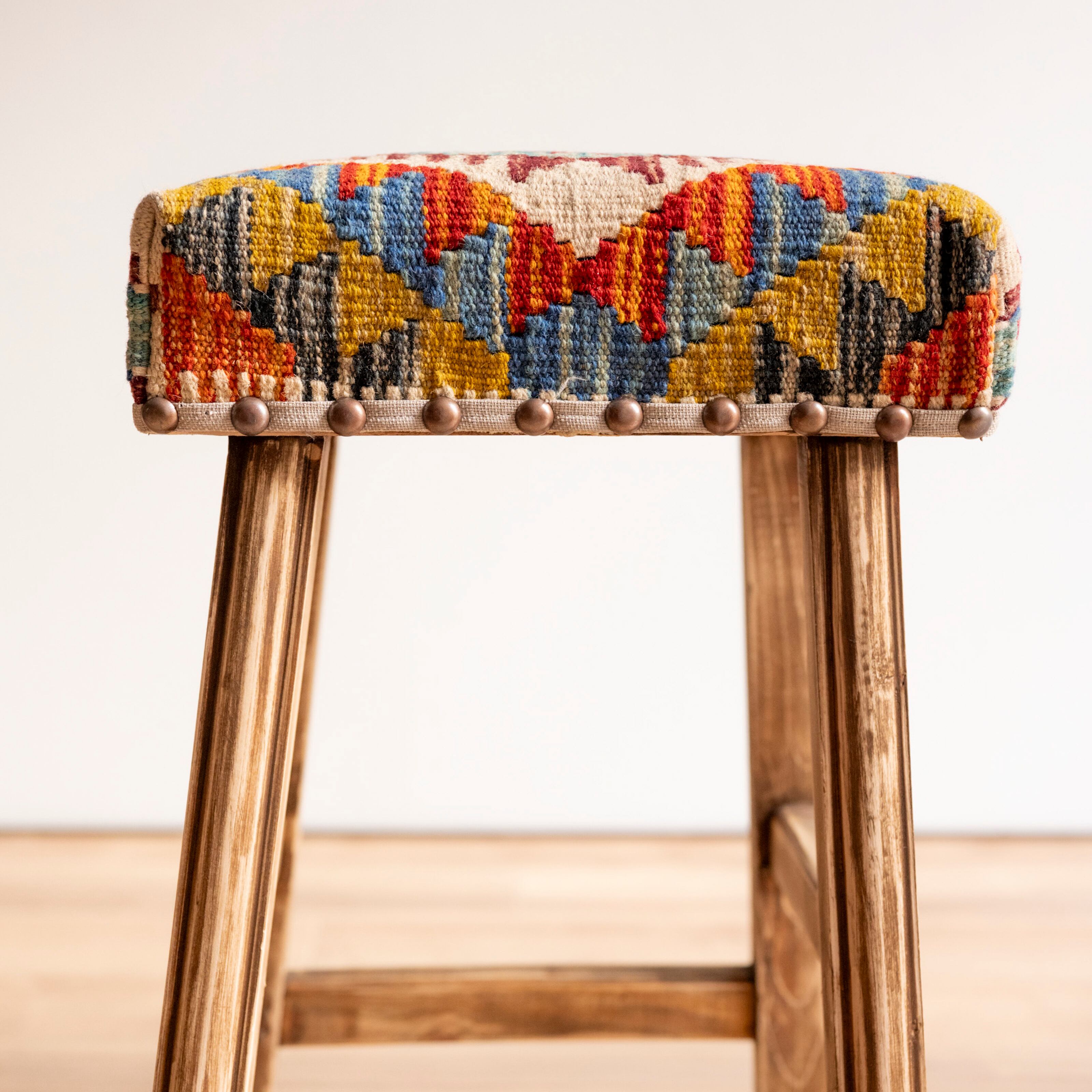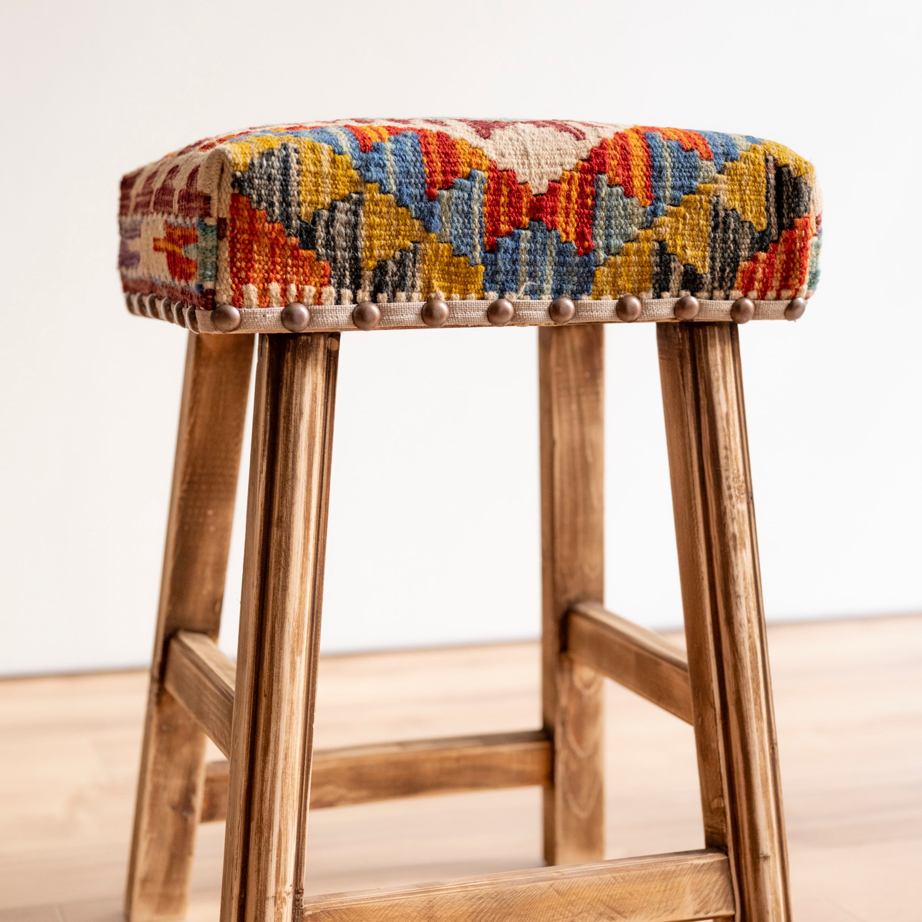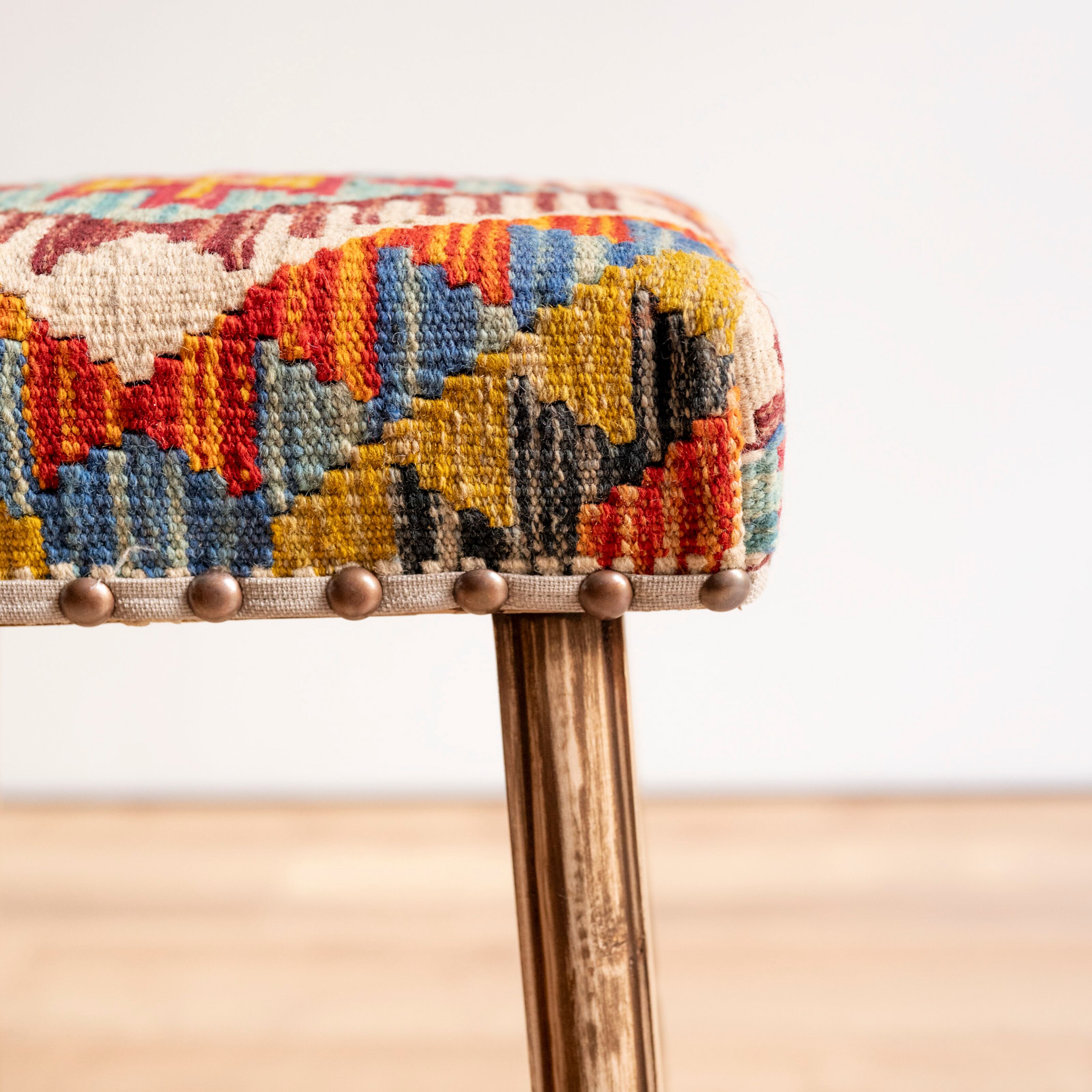 ウール製の手織りキリム(ラグ)を座面にあしらった、パキスタン製の椅子です。