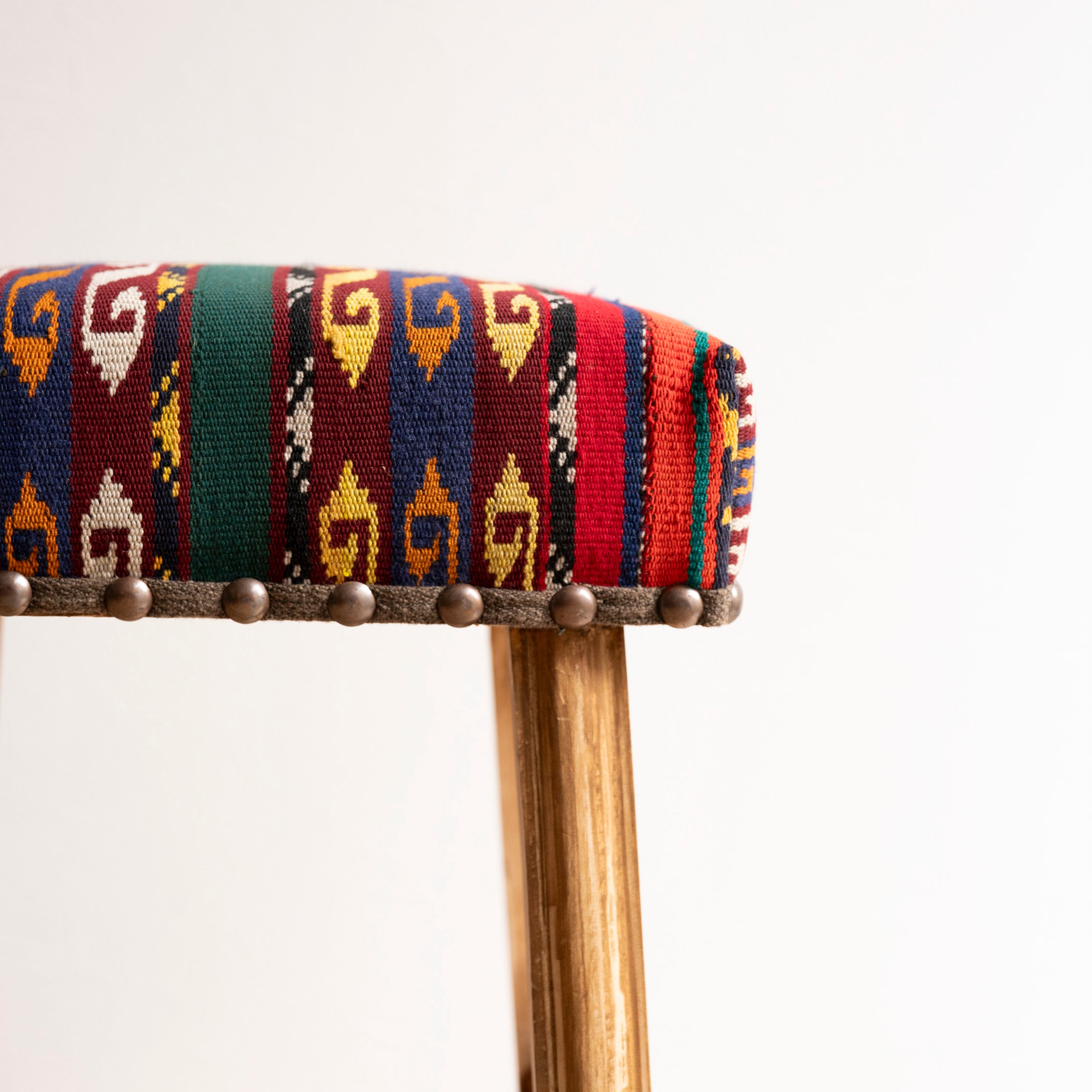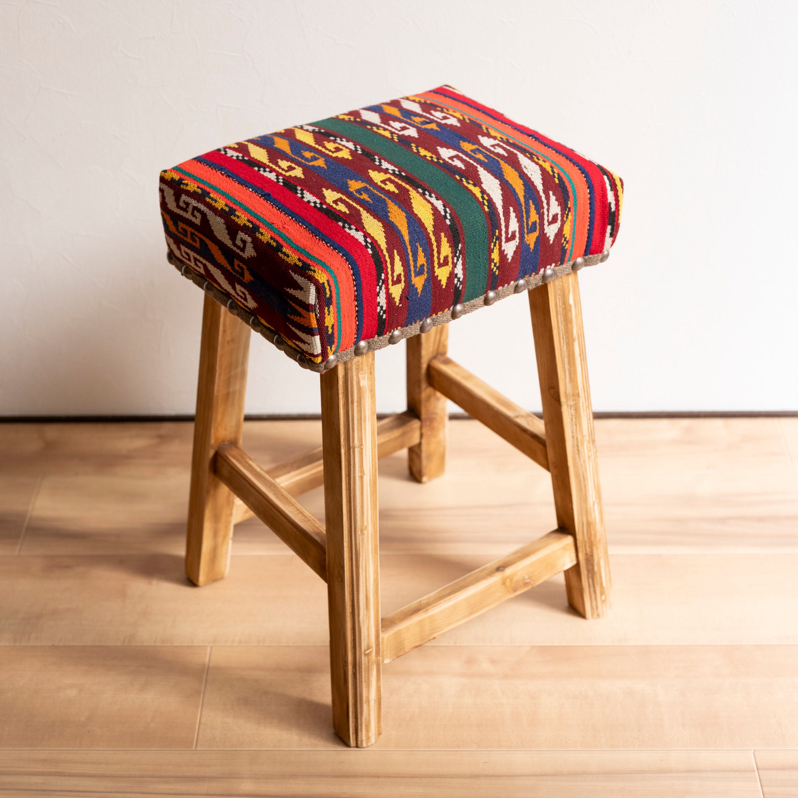 ウール製の手織りキリム(ラグ)を座面にあしらった、パキスタン製の椅子です。