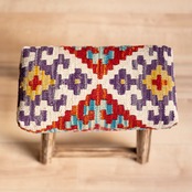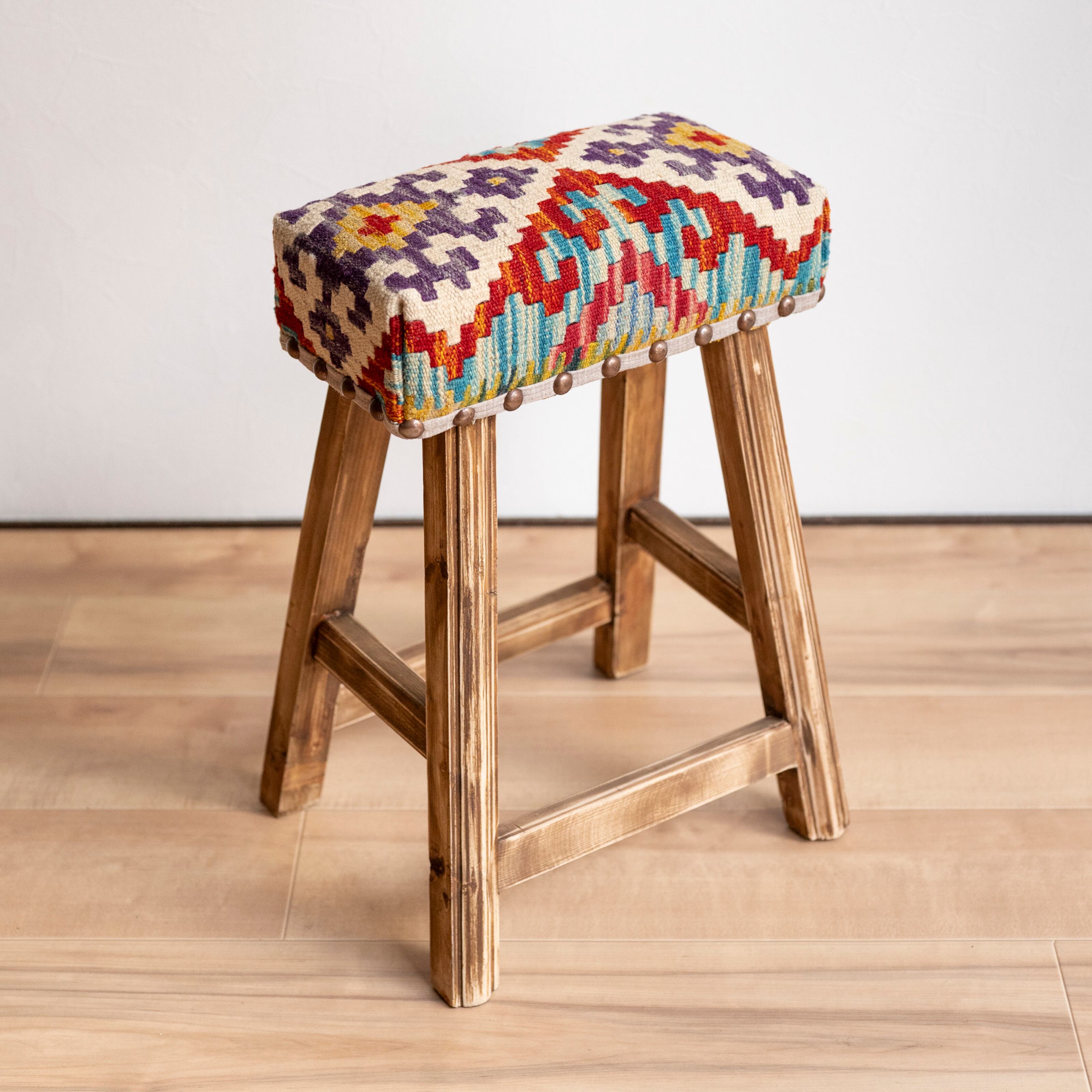 ウール製の手織りキリム(ラグ)を座面にあしらった、パキスタン製の椅子です。