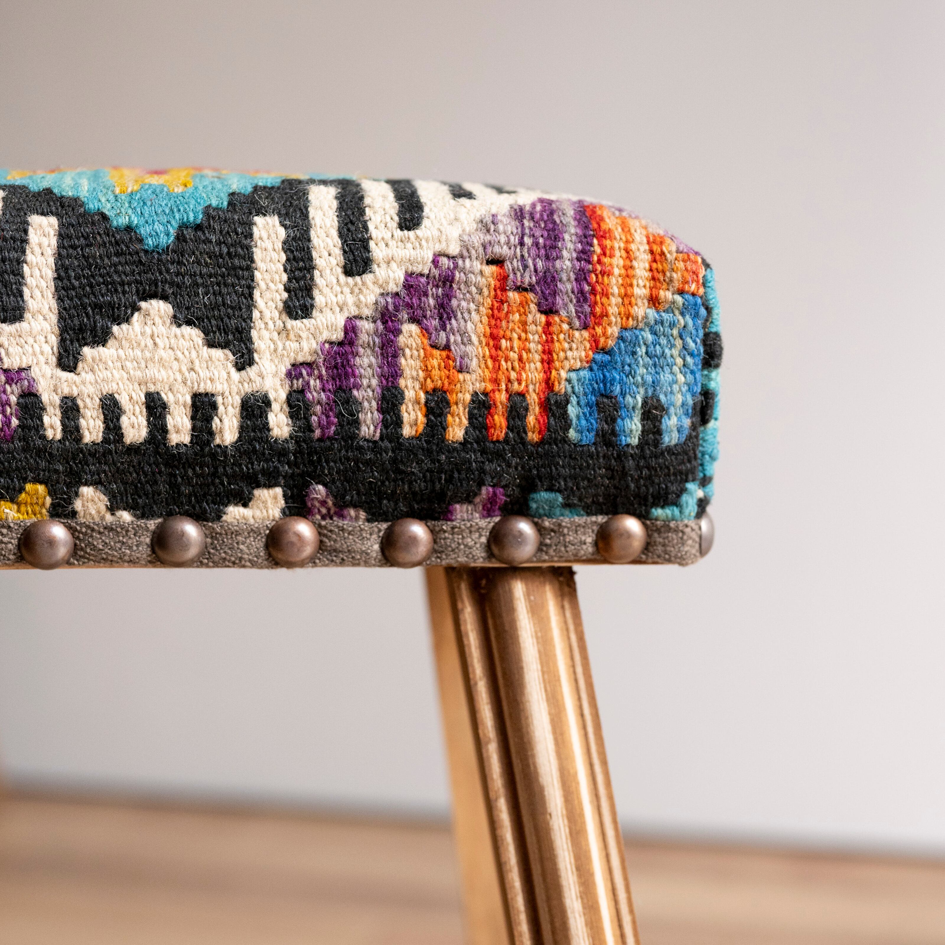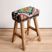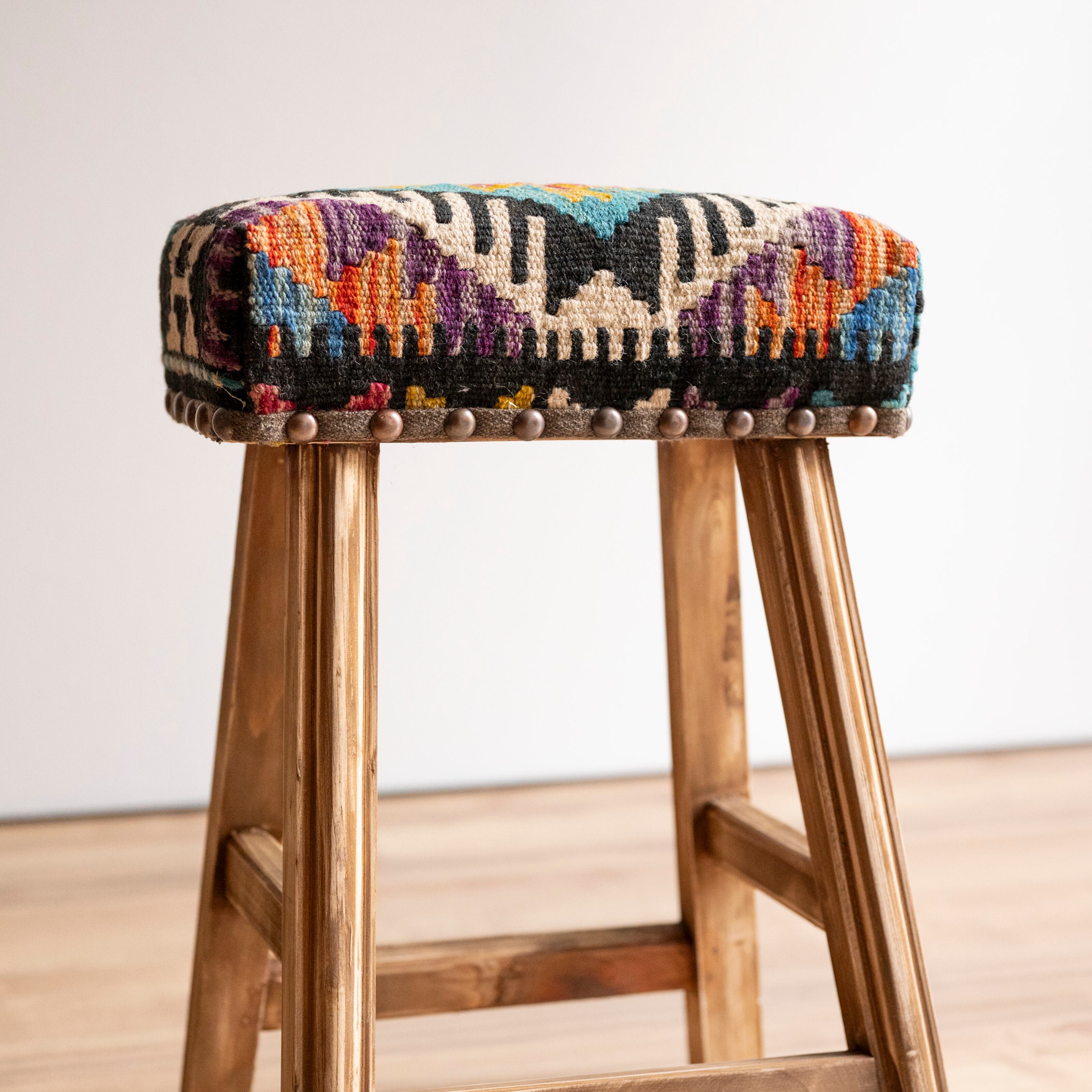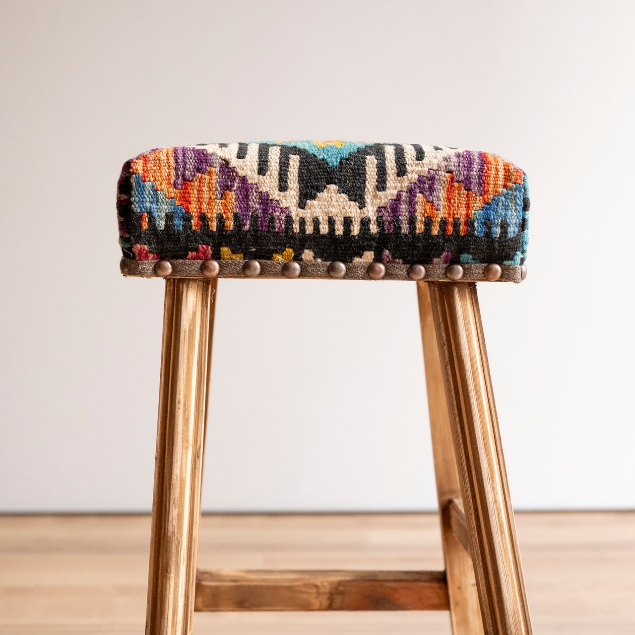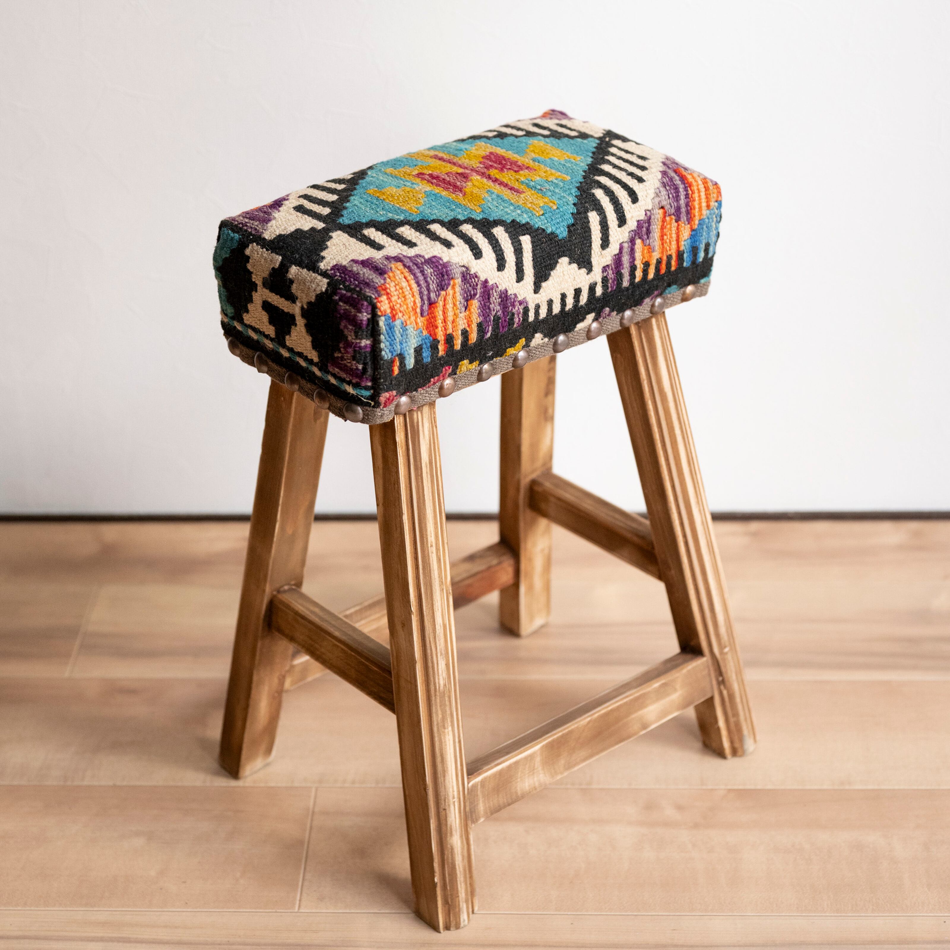 ウール製の手織りキリム(ラグ)を座面にあしらった、パキスタン製の椅子です。