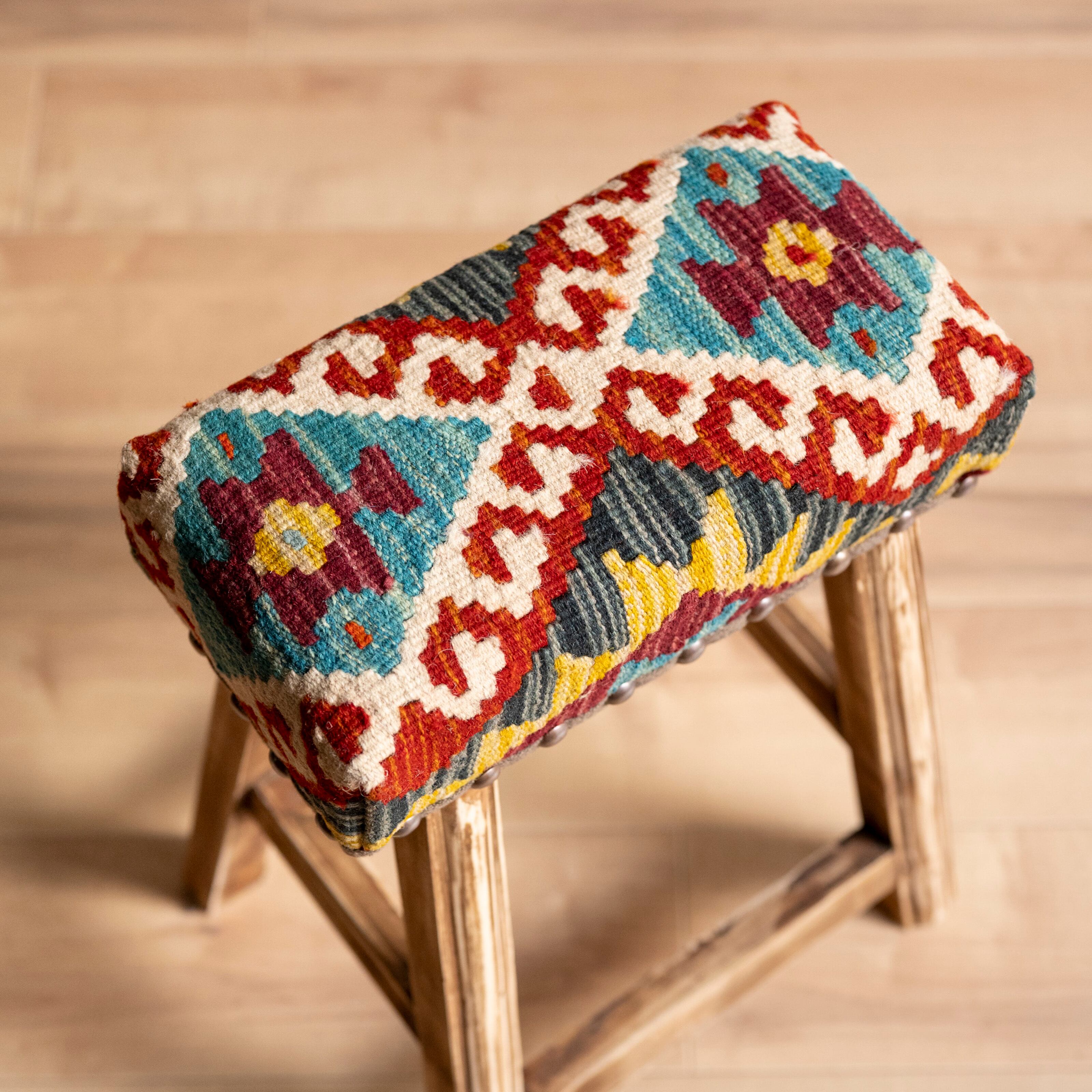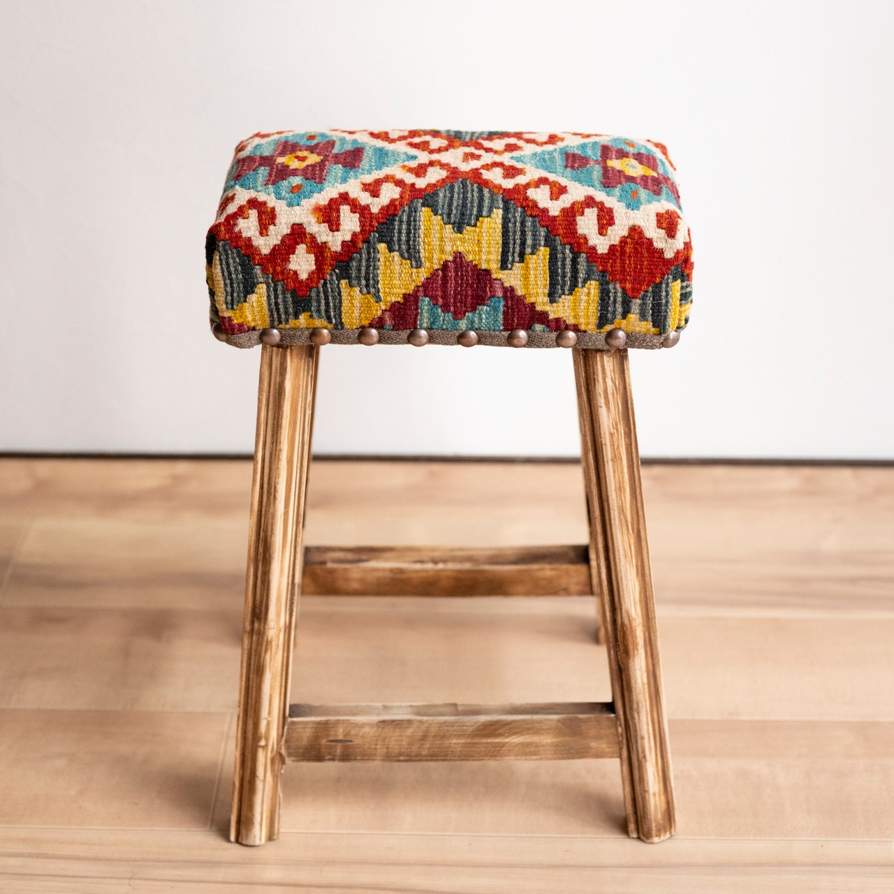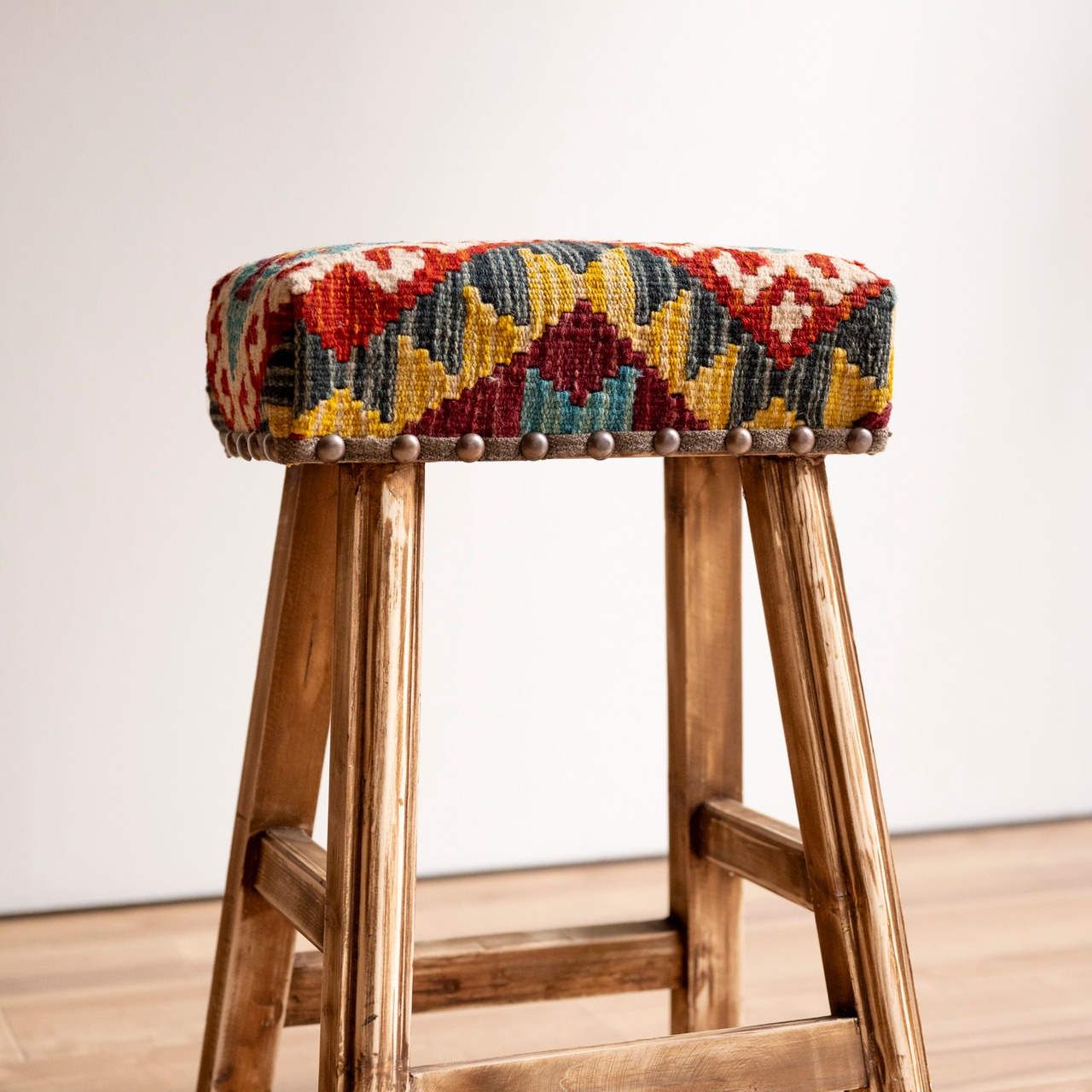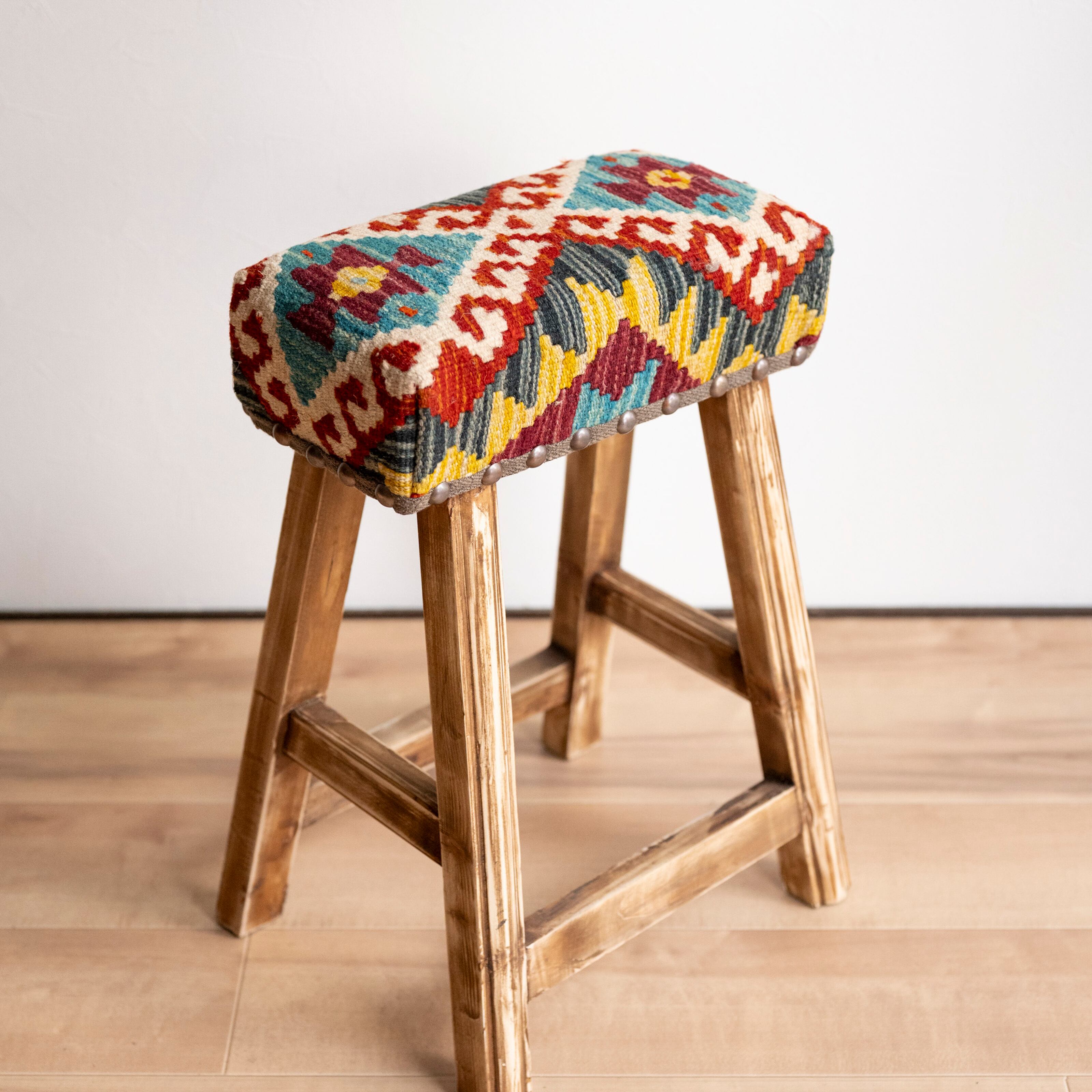 ウール製の手織りキリム(ラグ)を座面にあしらった、パキスタン製の椅子です。