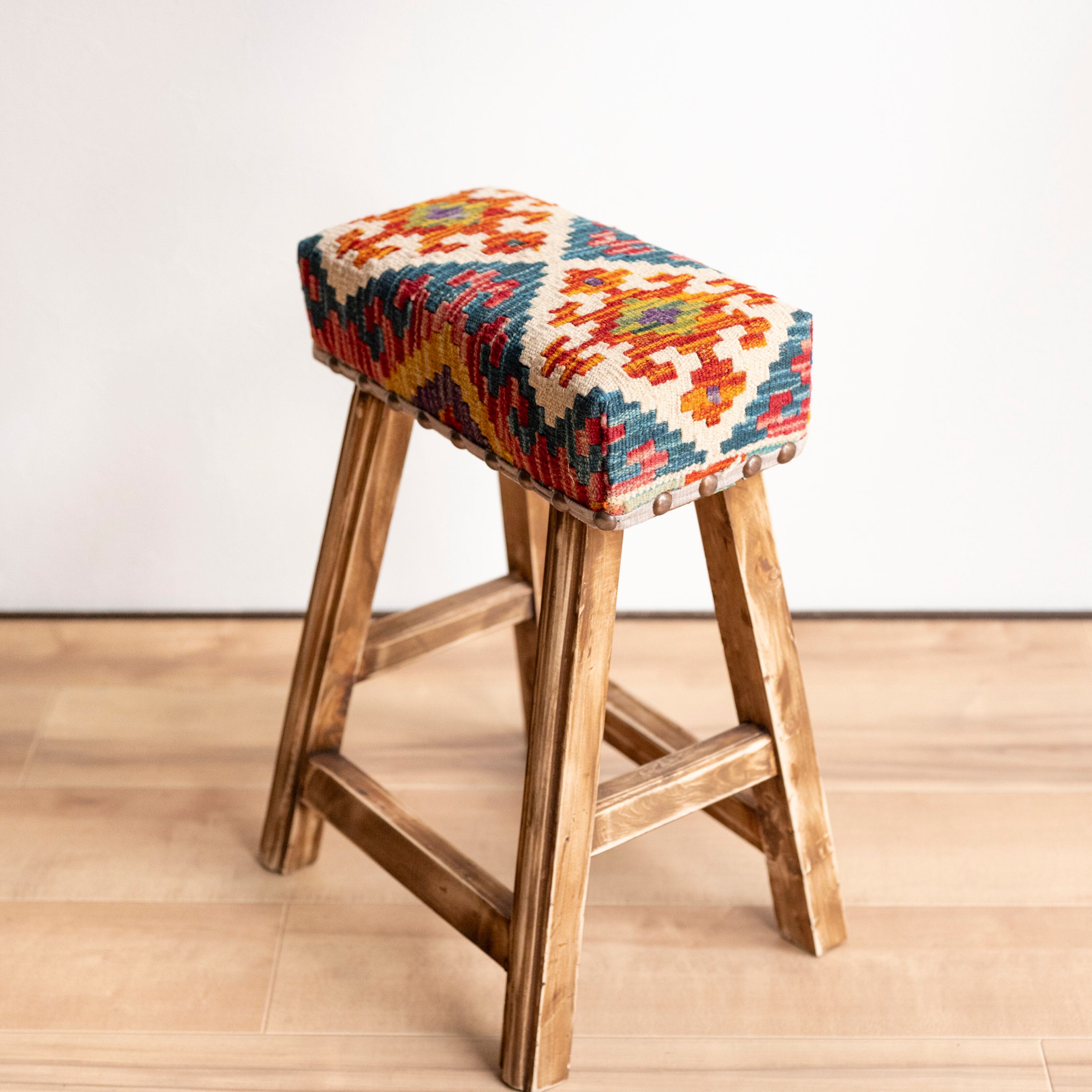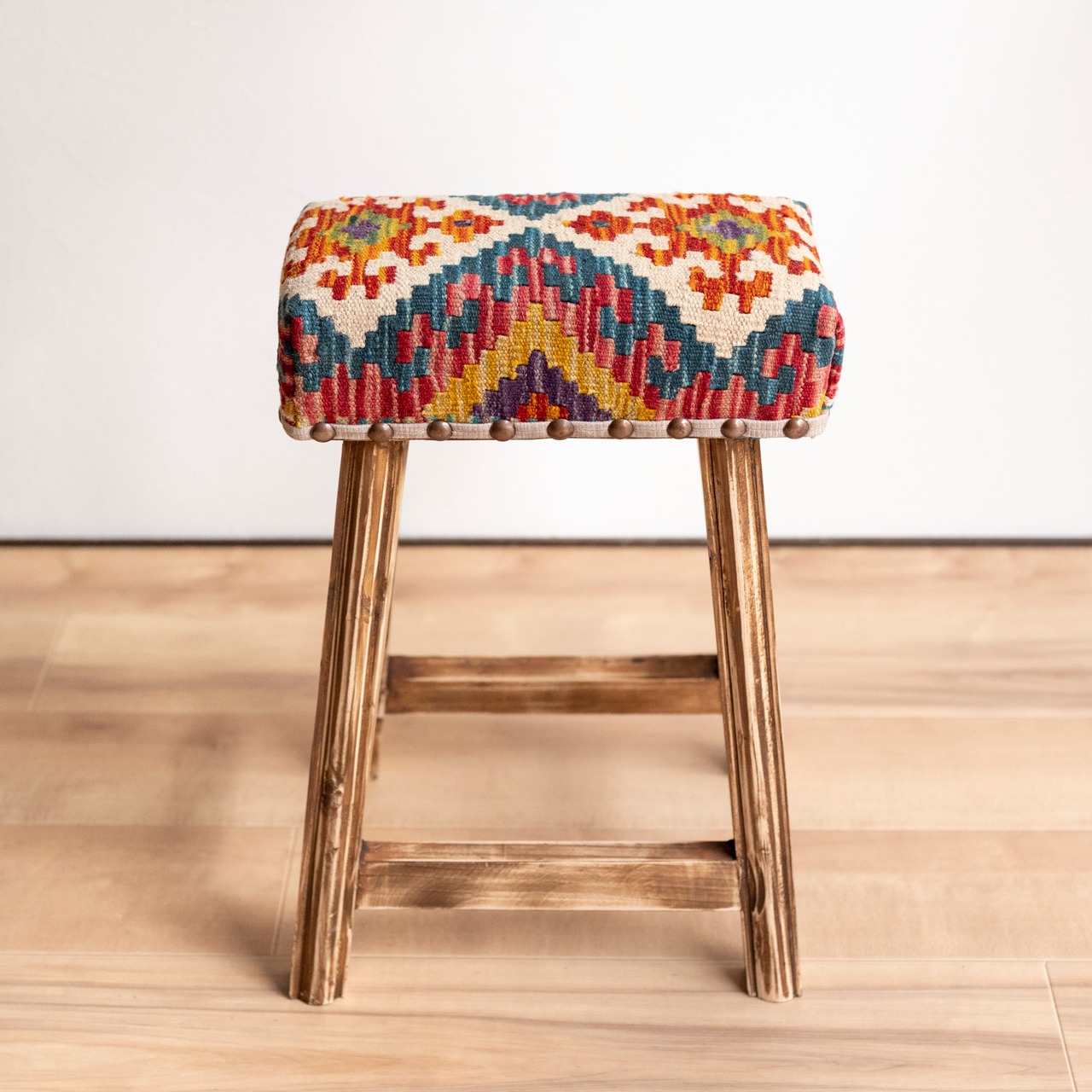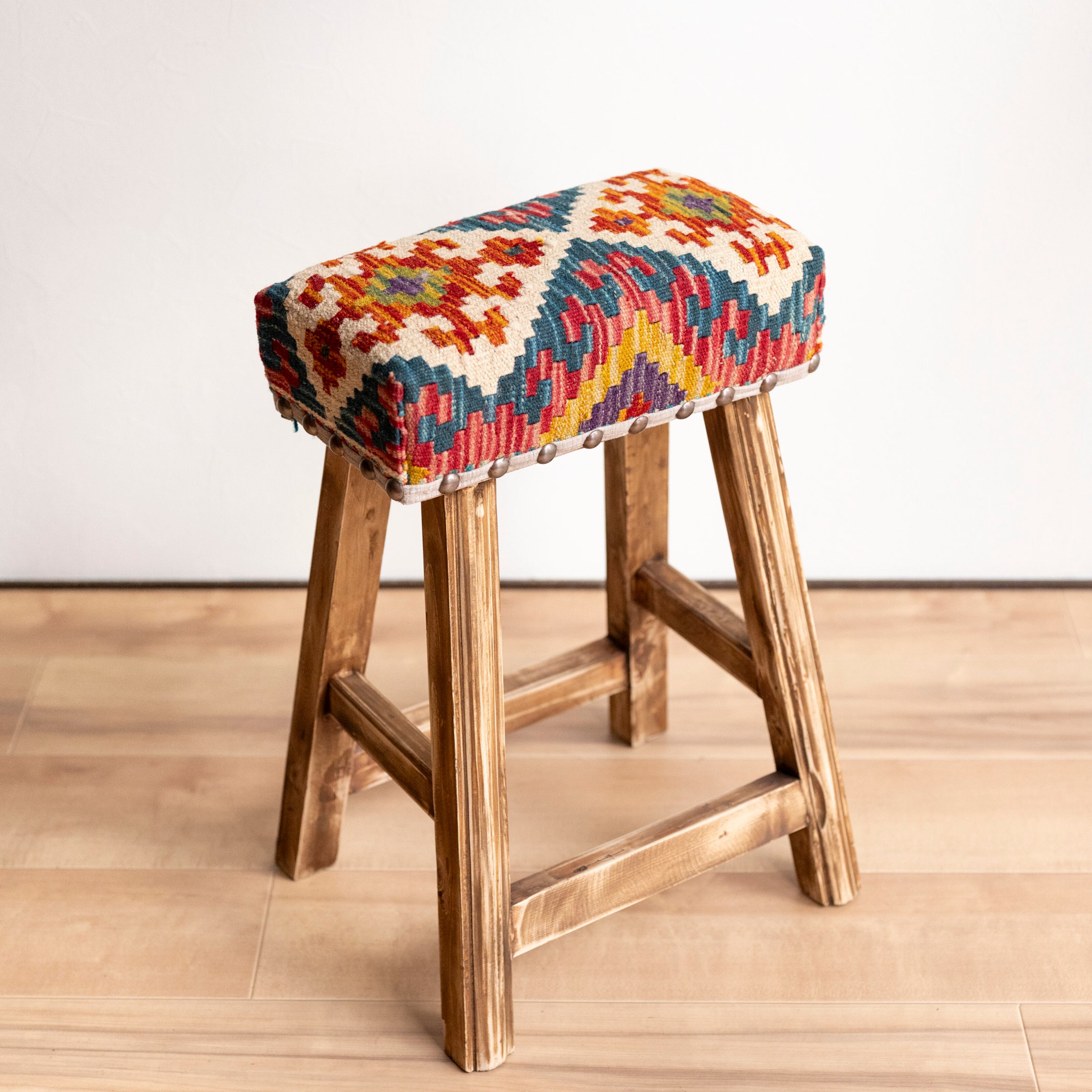 ウール製の手織りキリム(ラグ)を座面にあしらった、パキスタン製の椅子です。