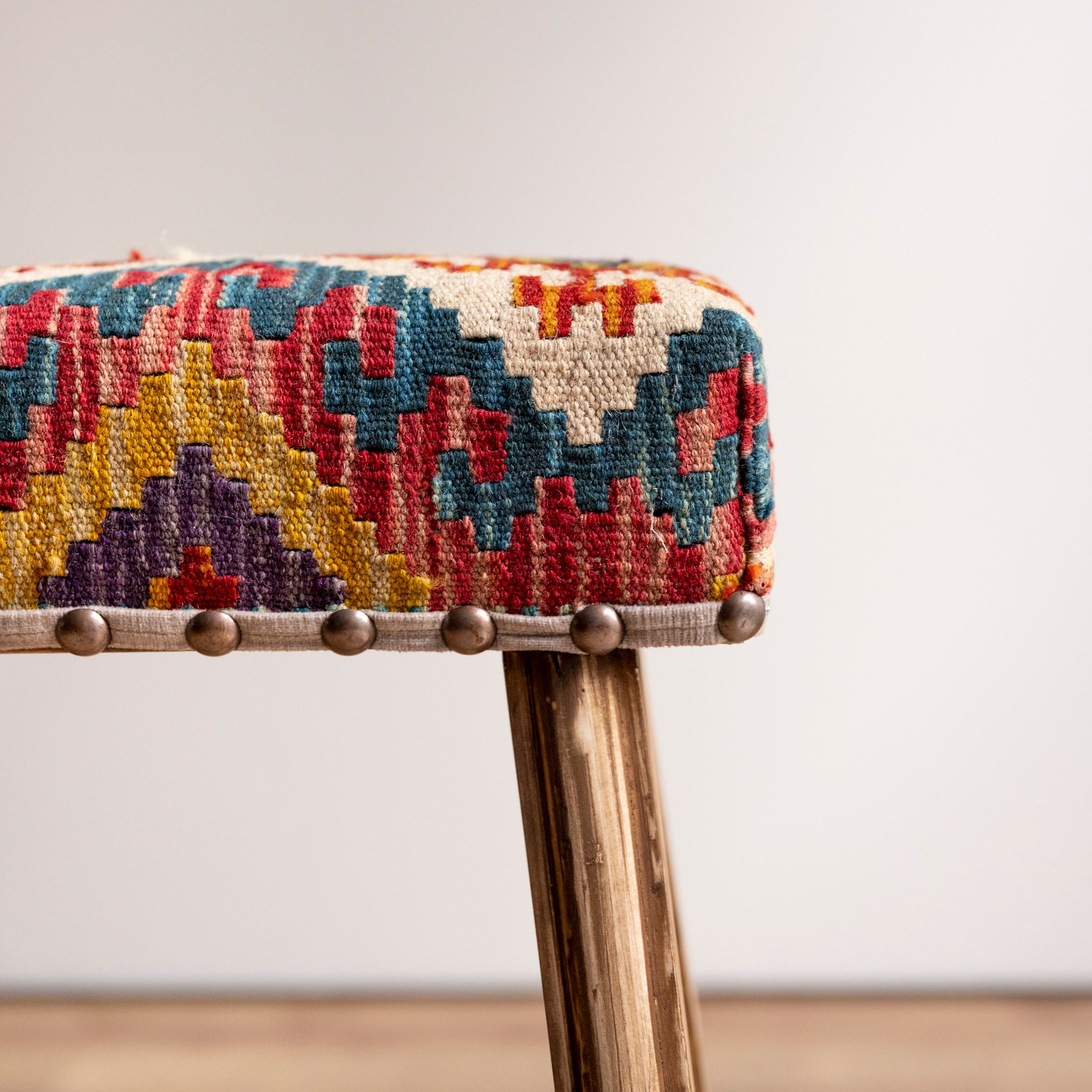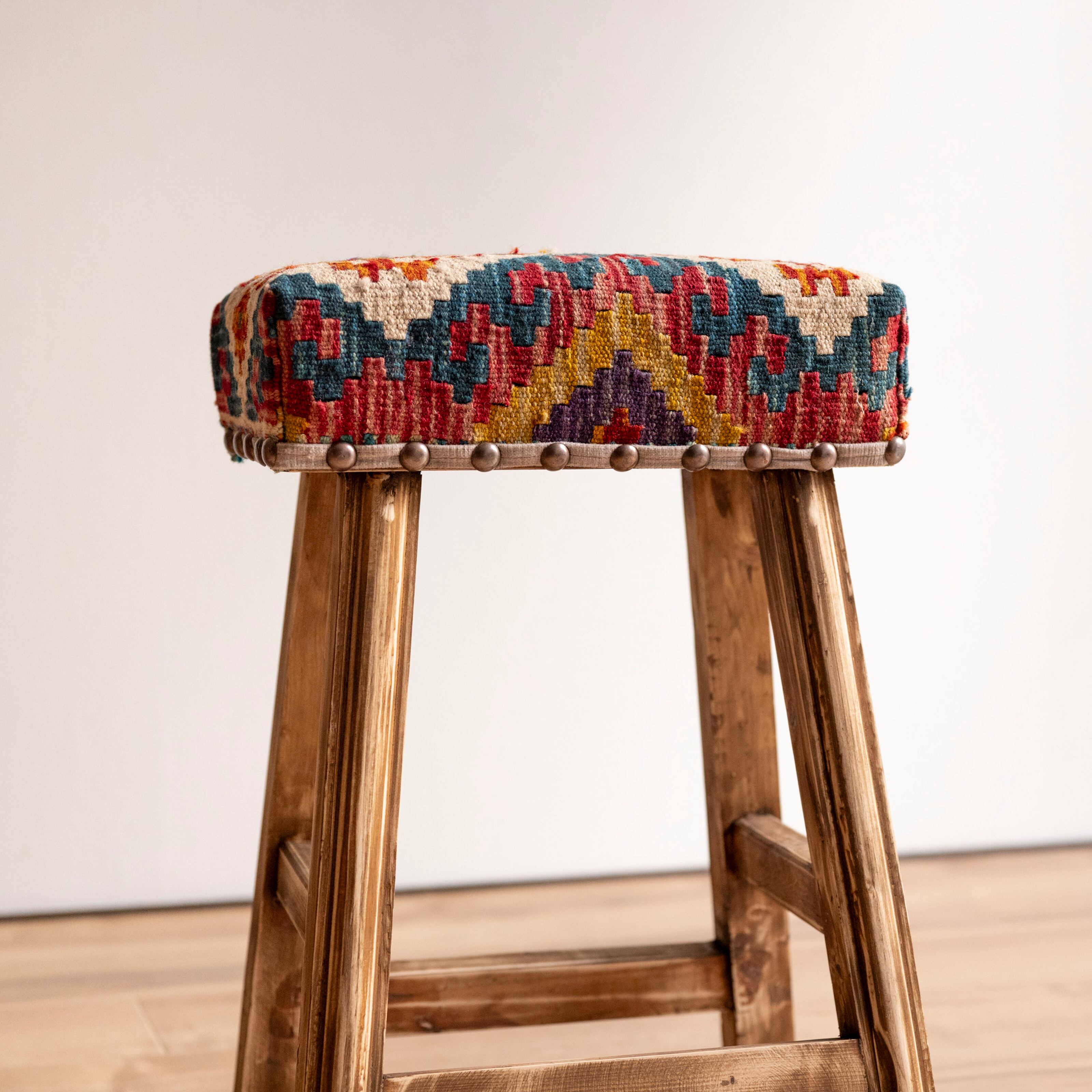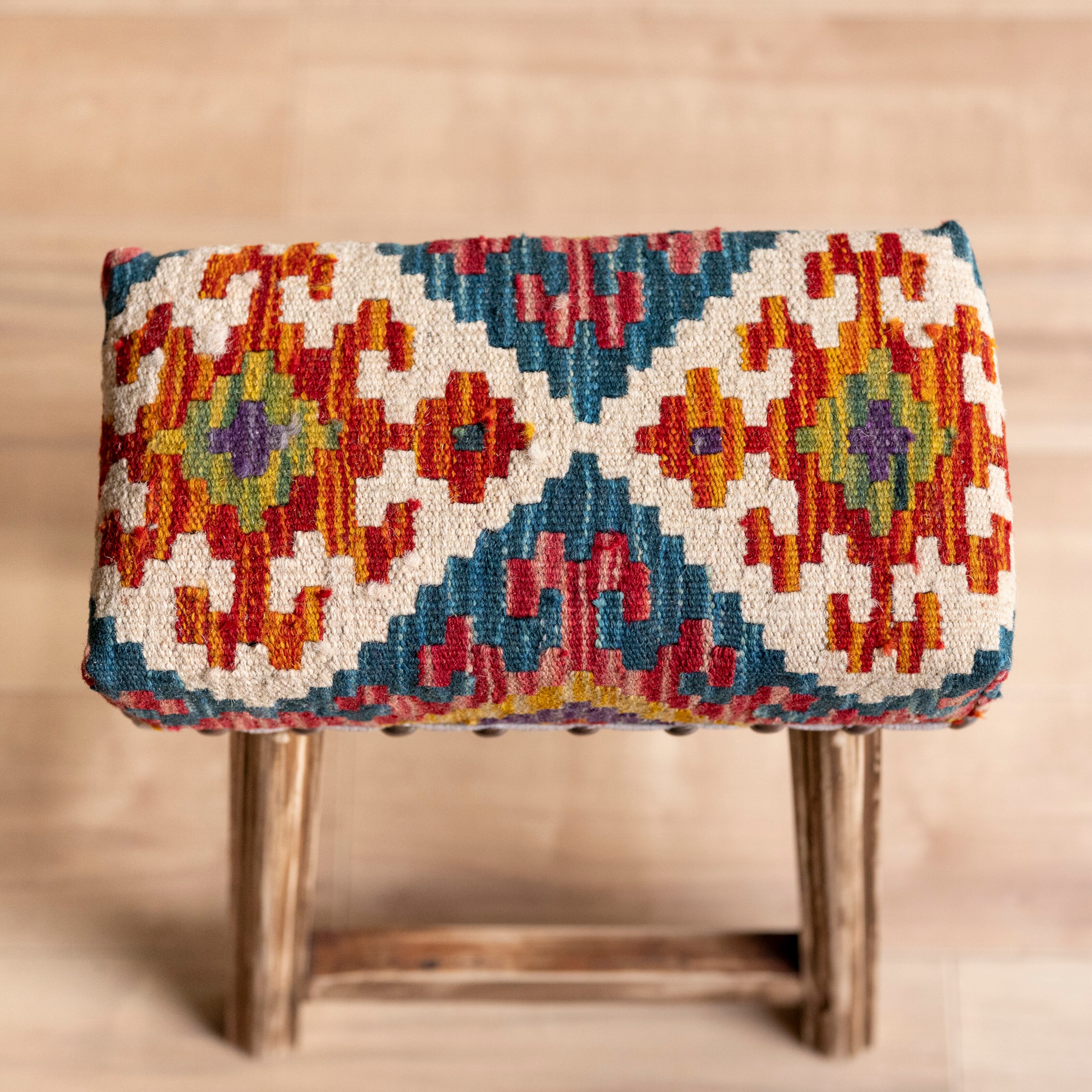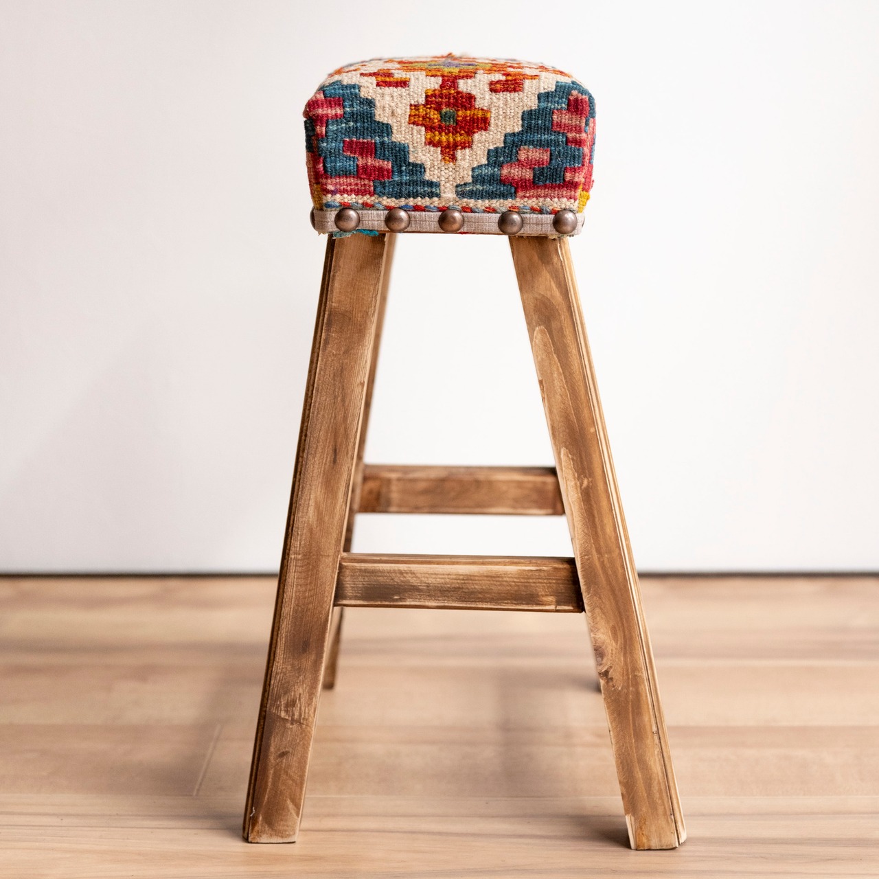 ウール製の手織りキリム(ラグ)を座面にあしらった、パキスタン製の椅子です。