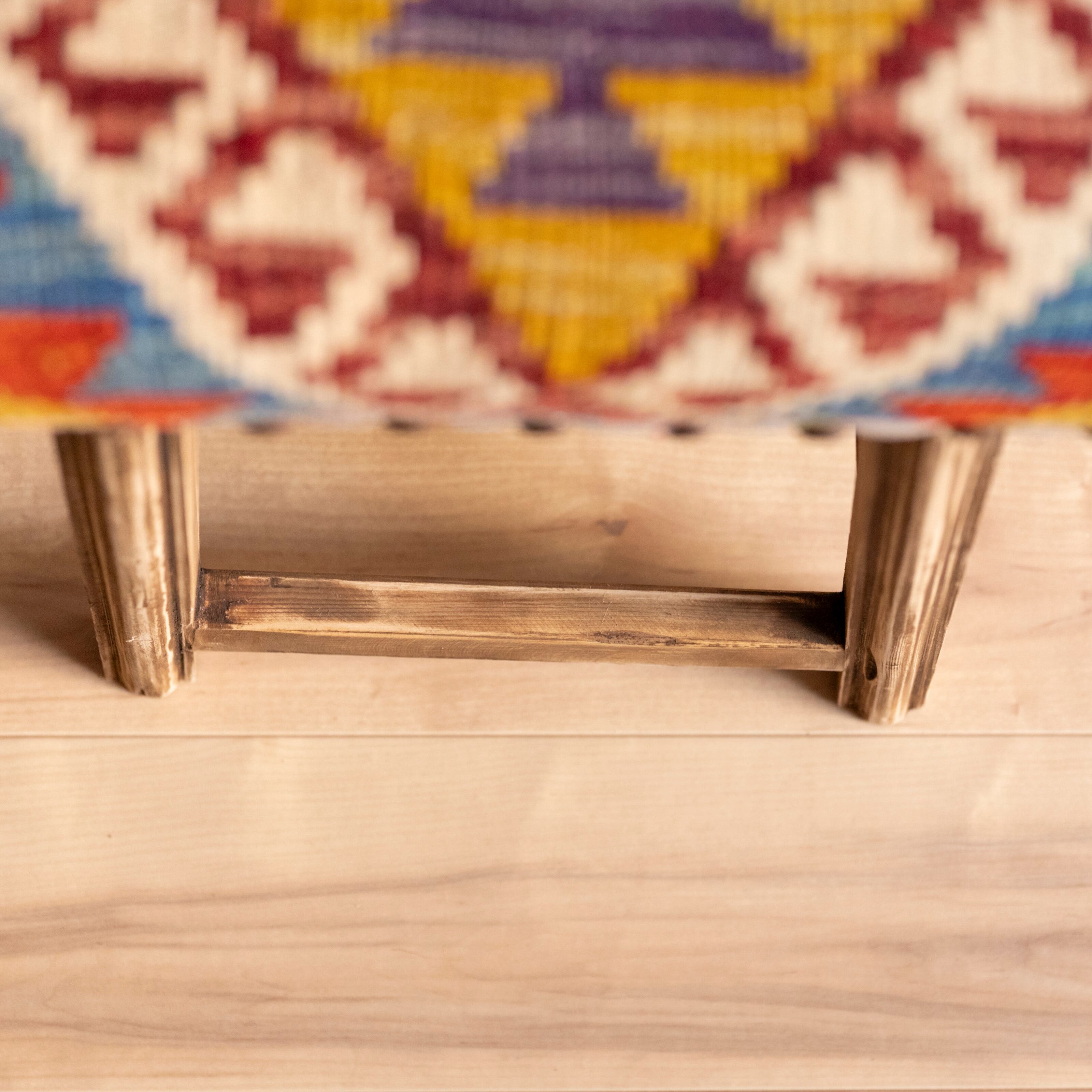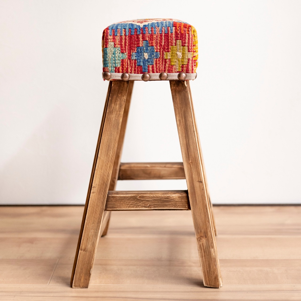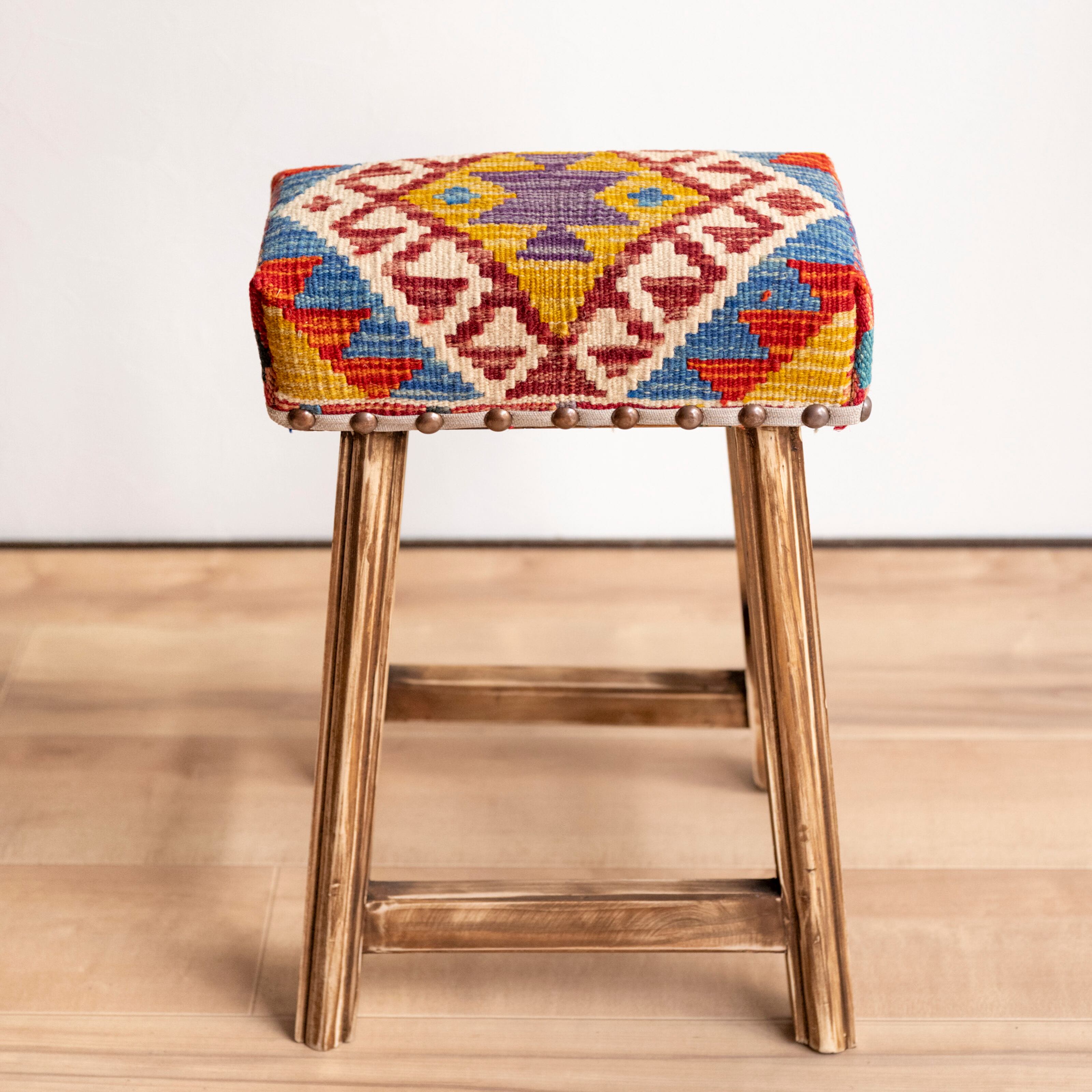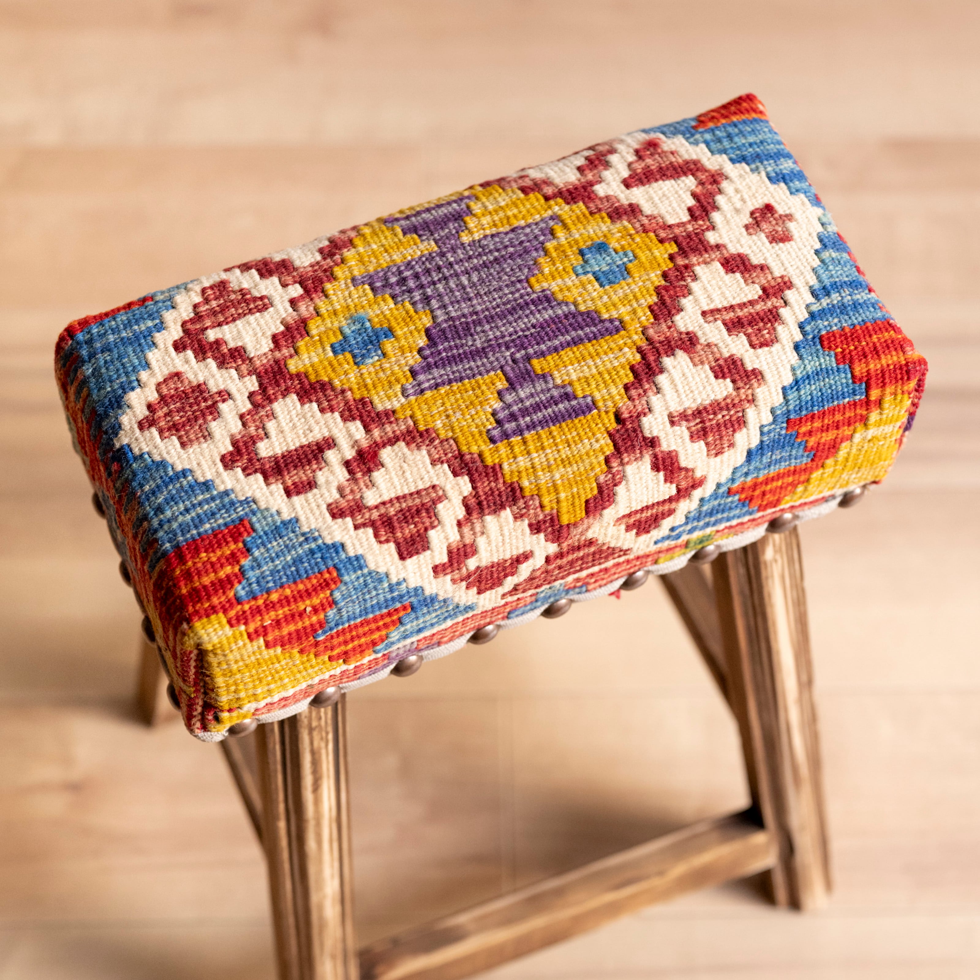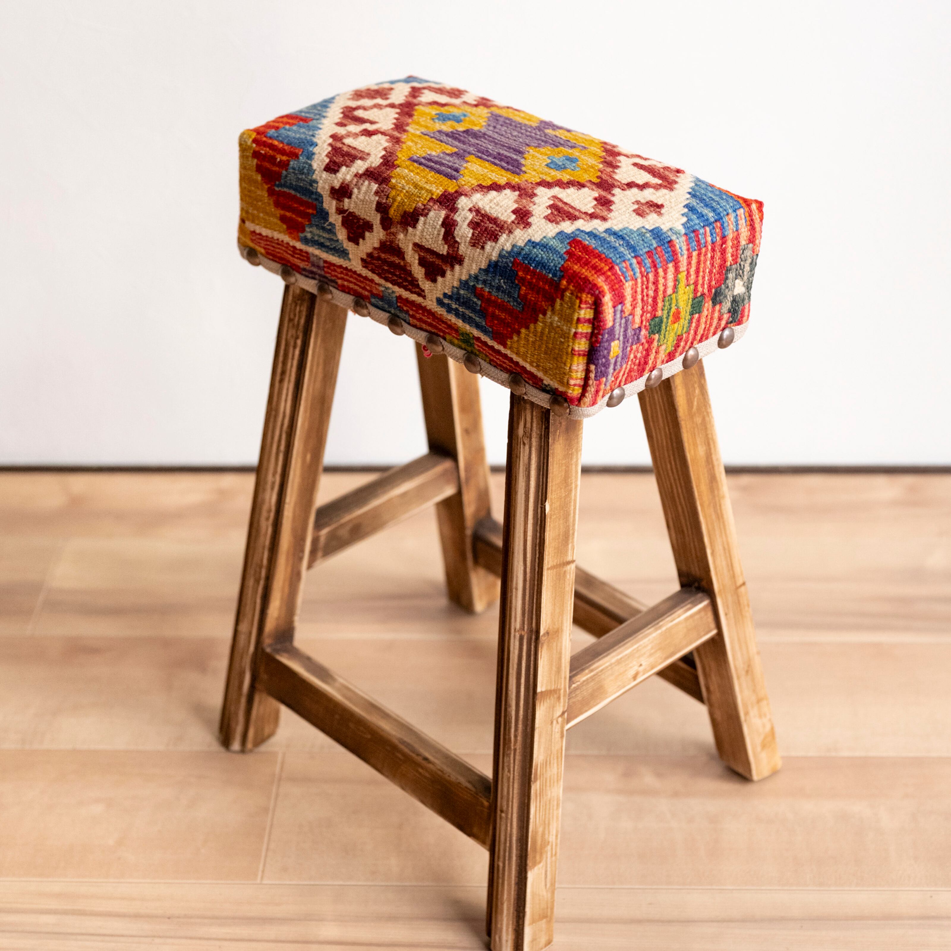 ウール製の手織りキリム(ラグ)を座面にあしらった、パキスタン製の椅子です。