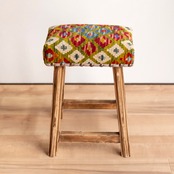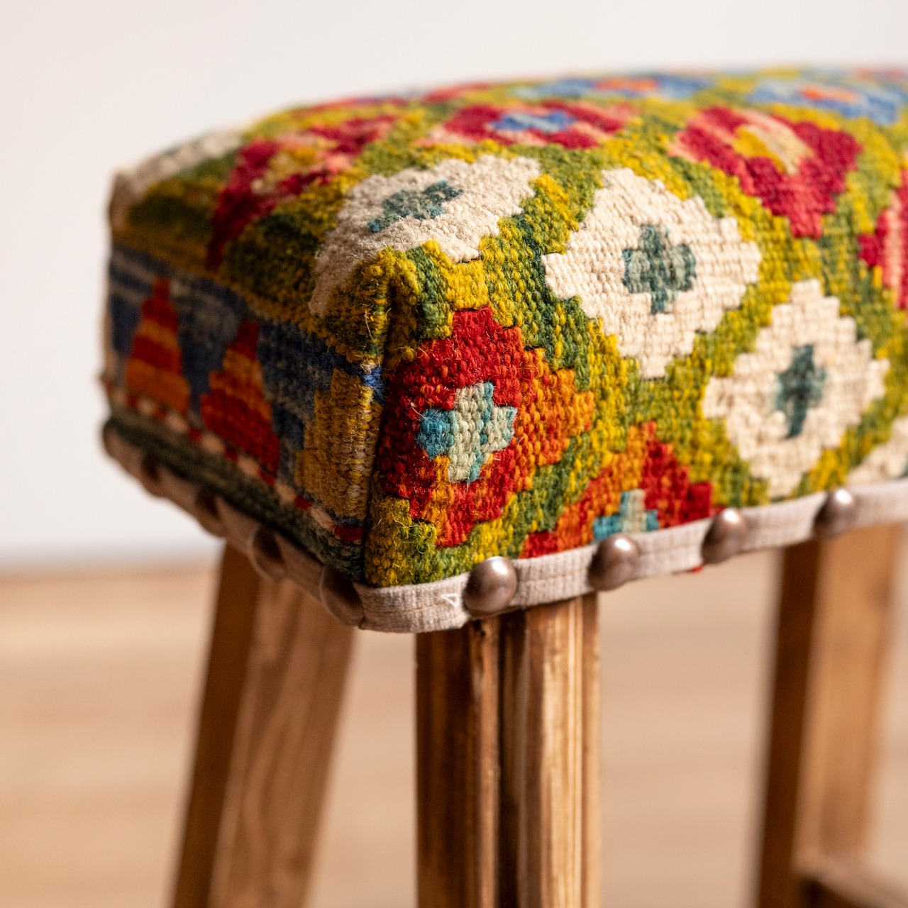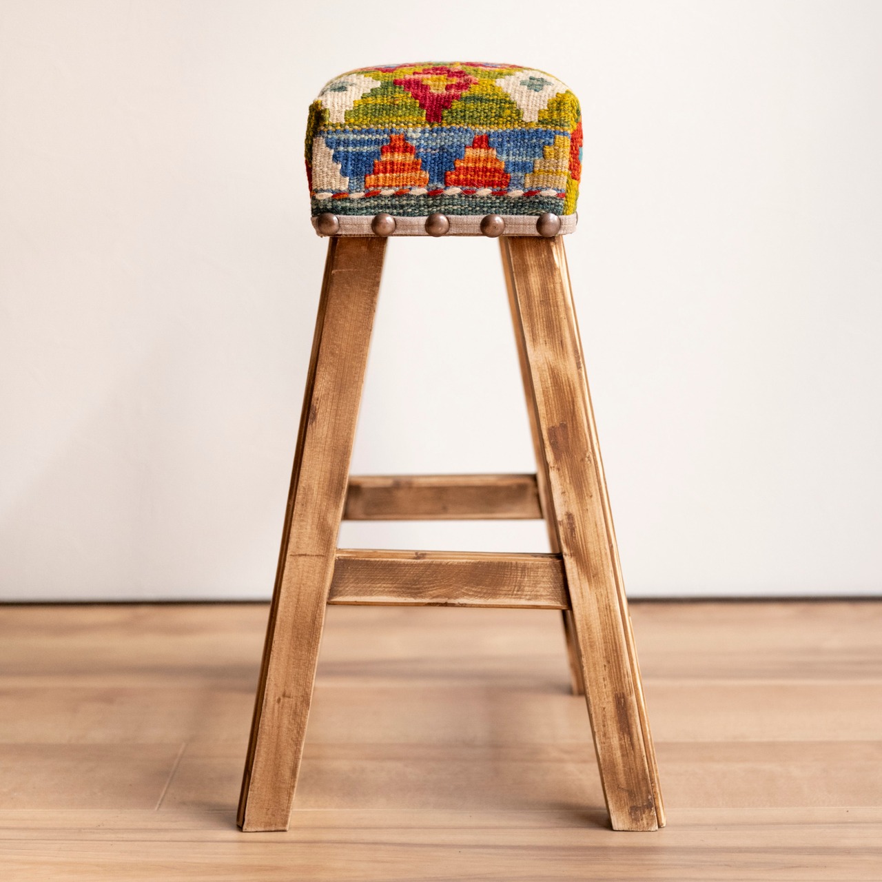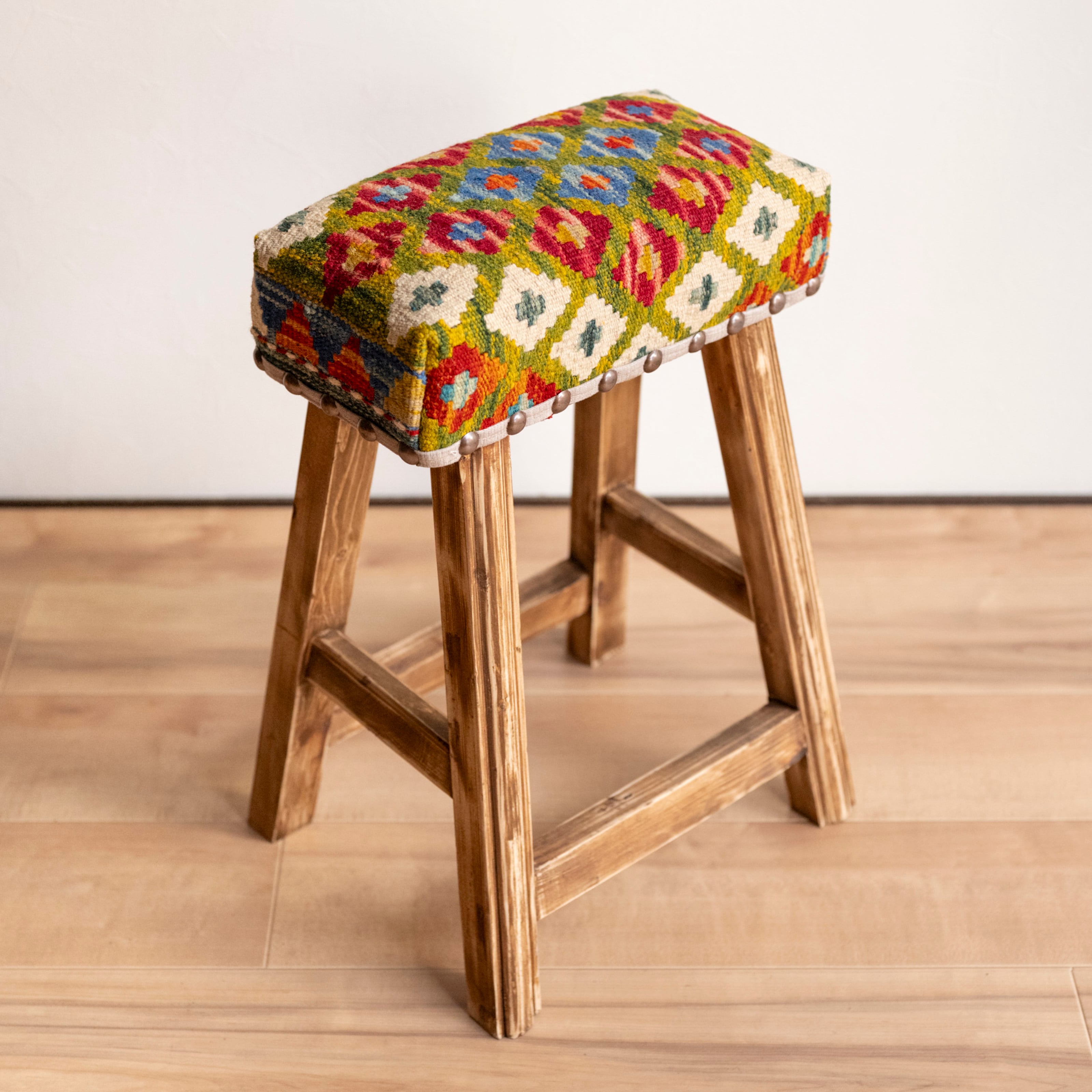 ウール製の手織りキリム(ラグ)を座面にあしらった、パキスタン製の椅子です。