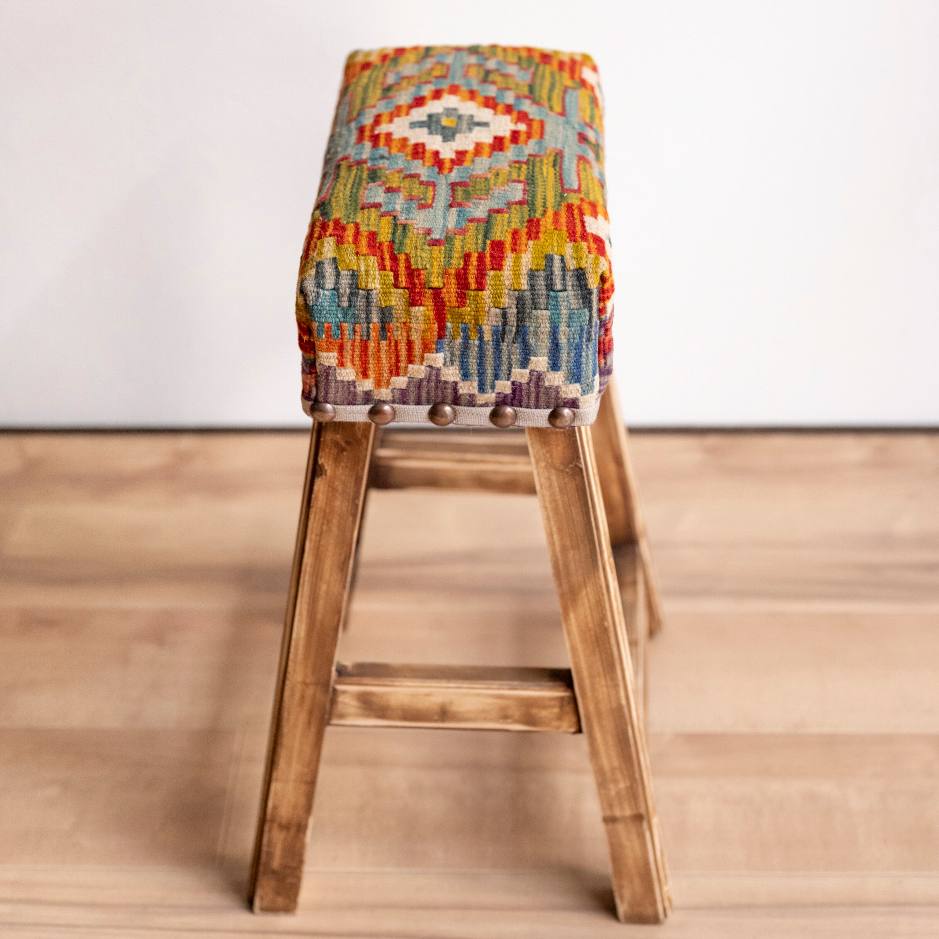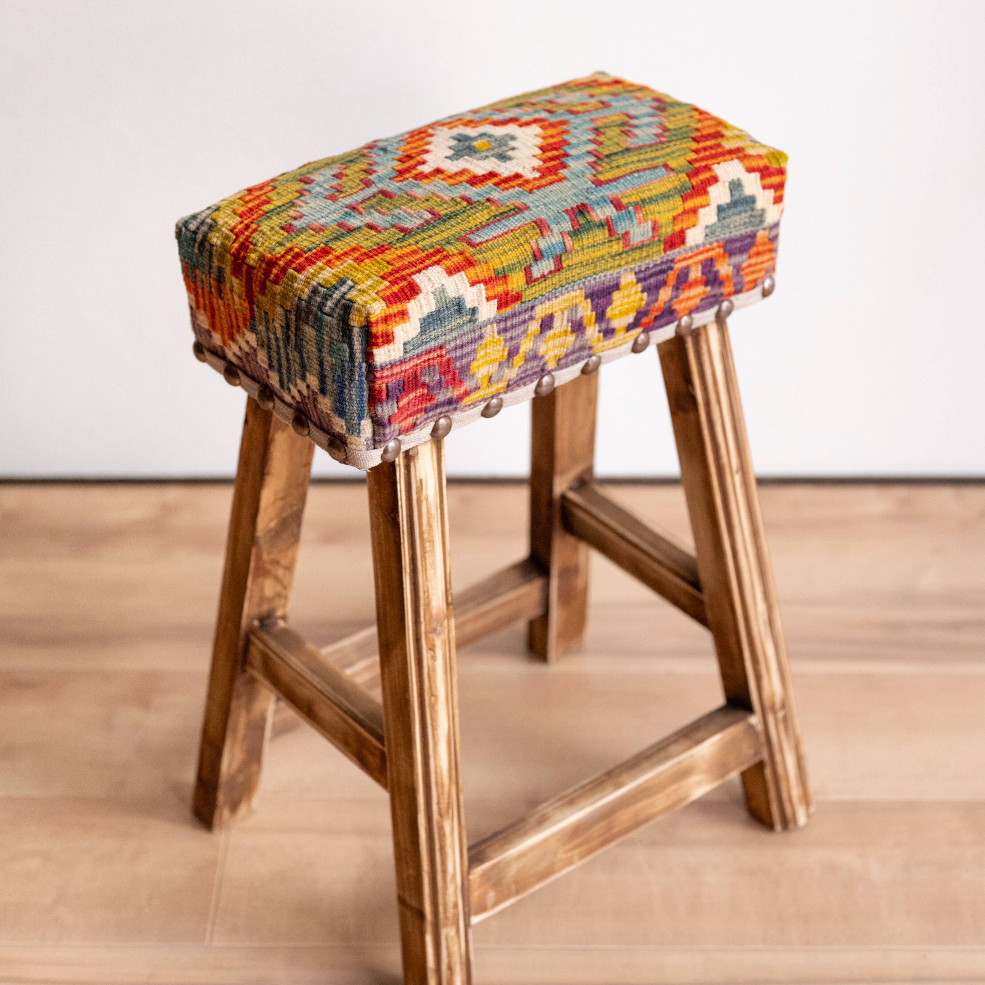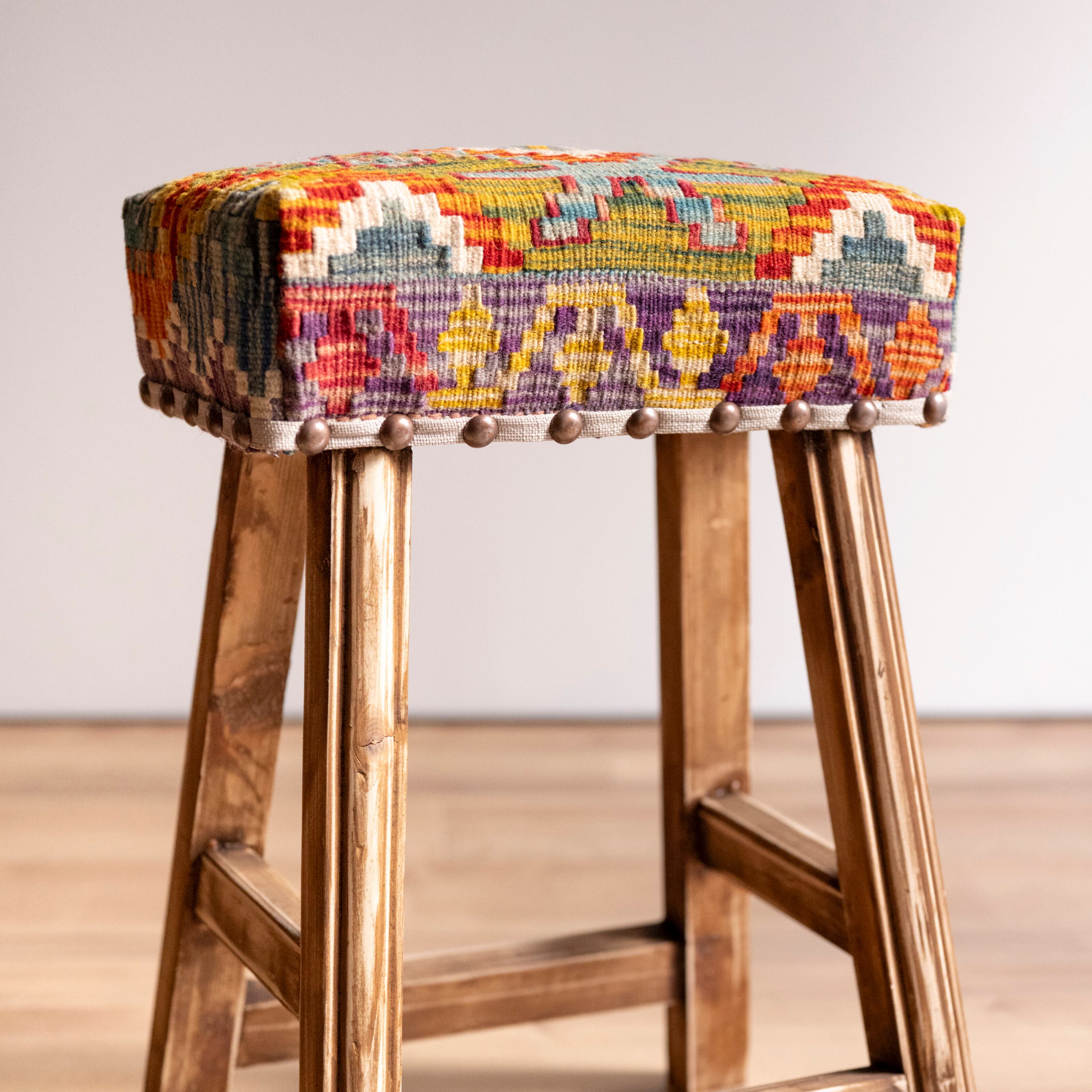ウール製の手織りキリム(ラグ)を座面にあしらった、パキスタン製の椅子です。