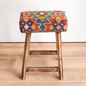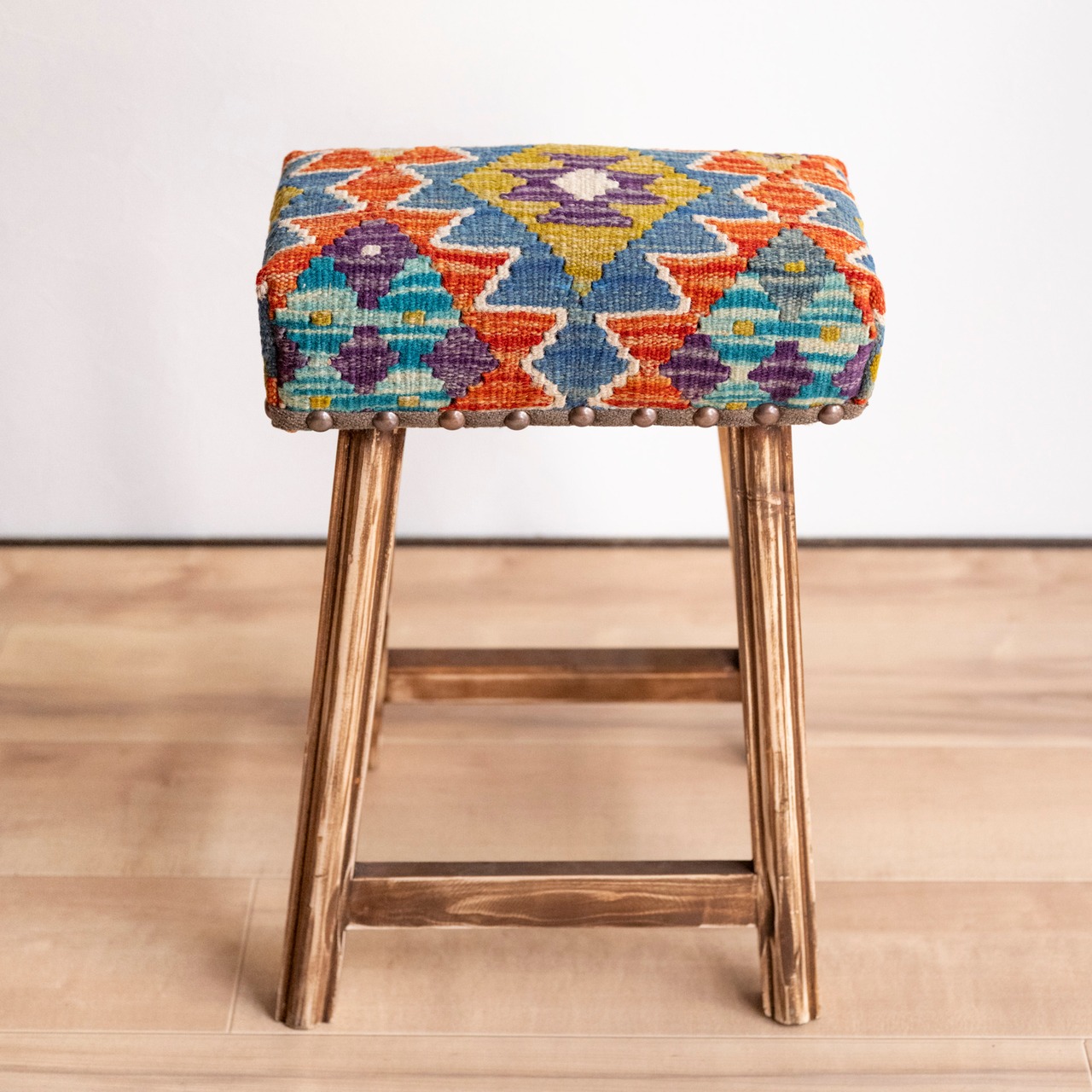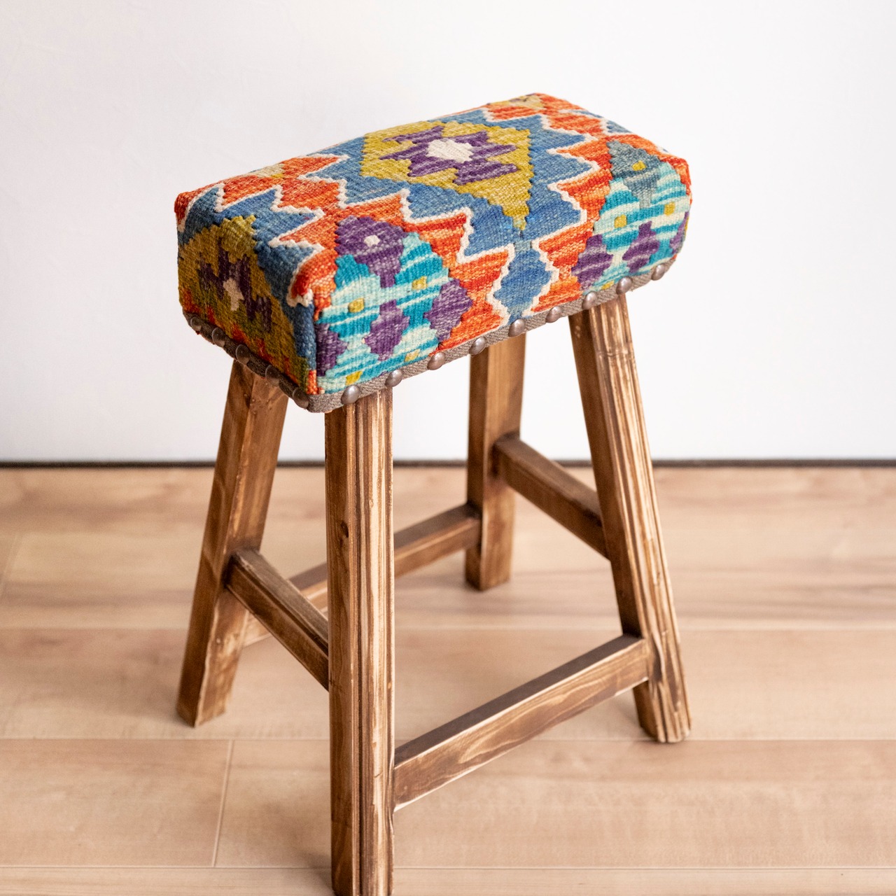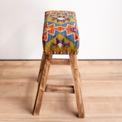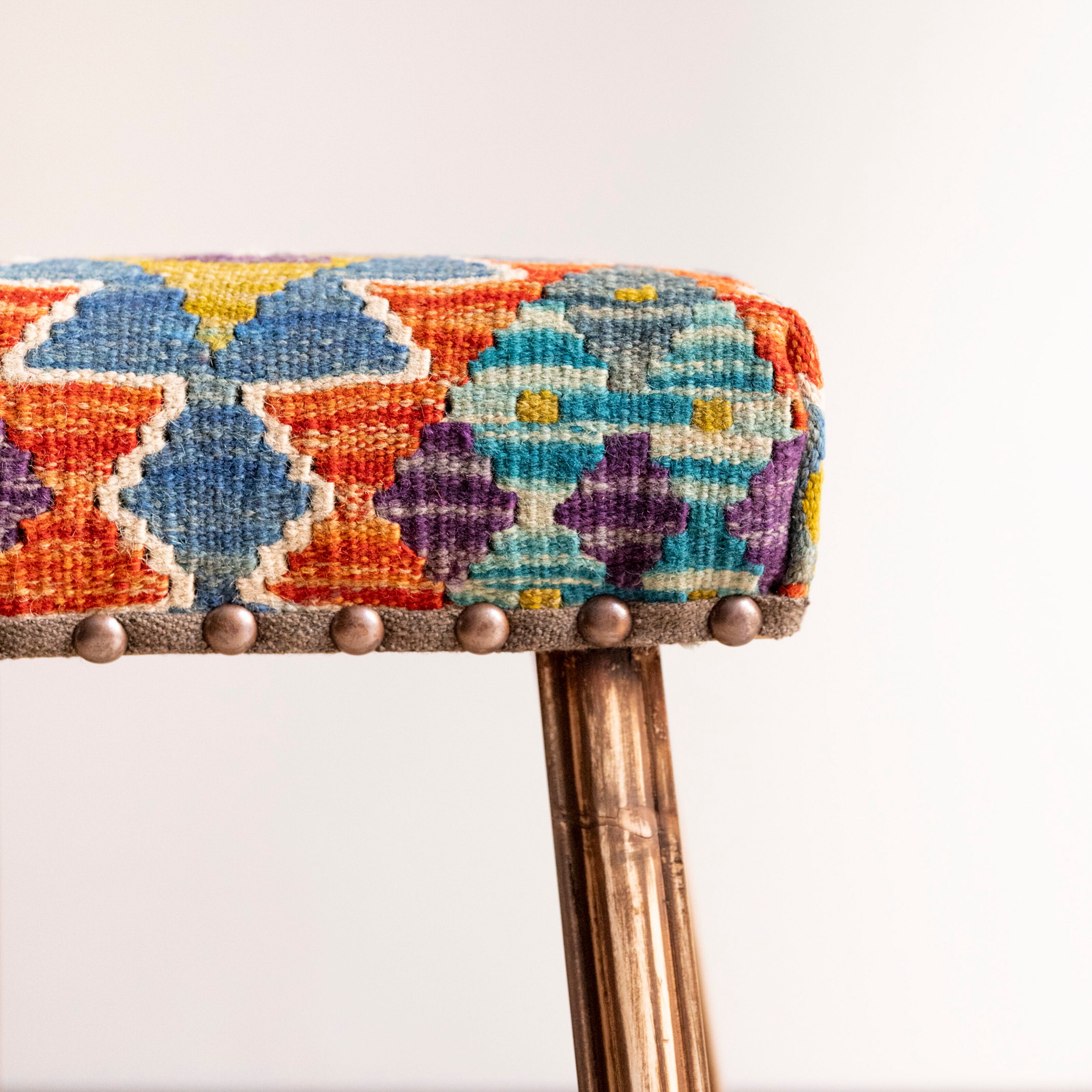 ウール製の手織りキリム(ラグ)を座面にあしらった、パキスタン製の椅子です。